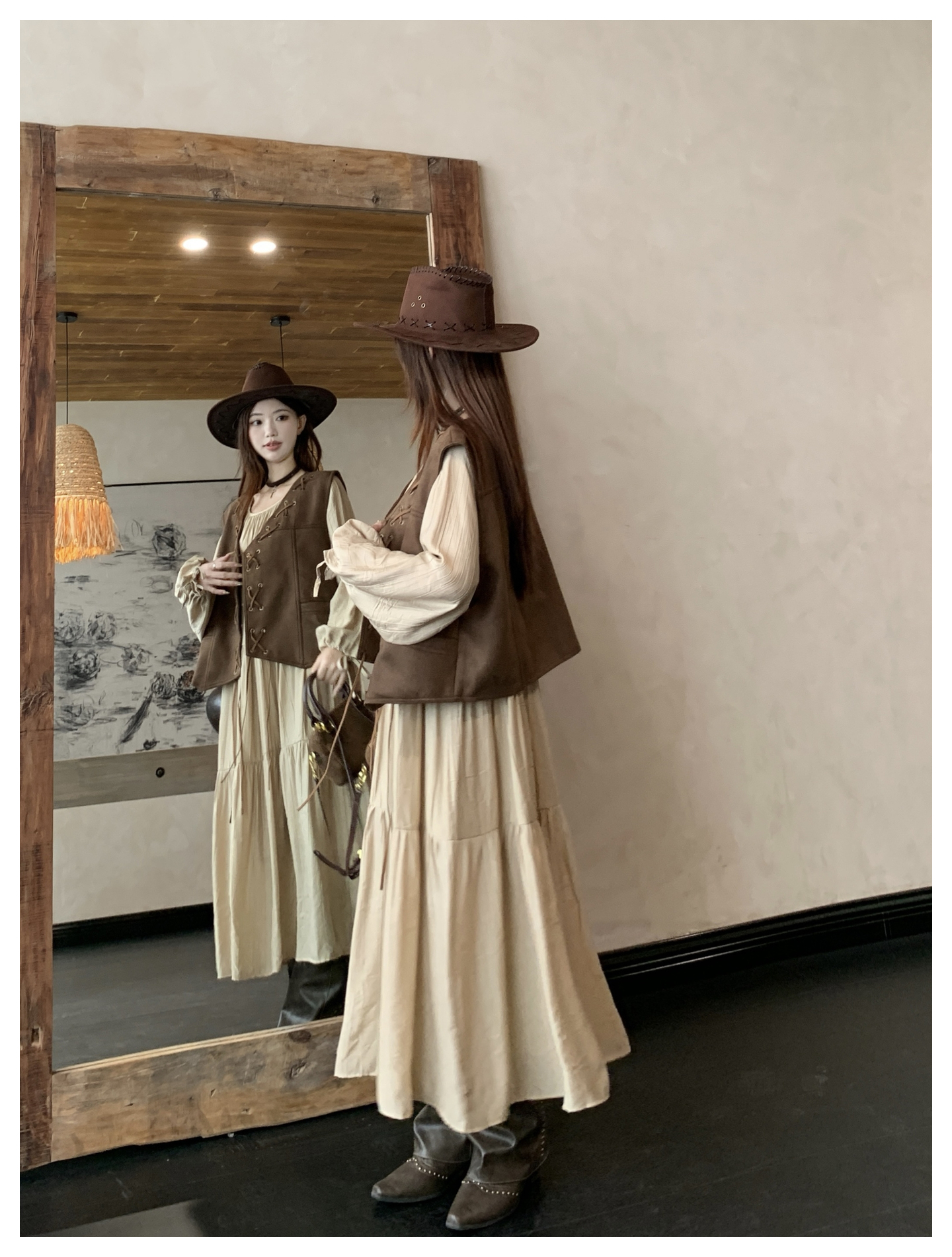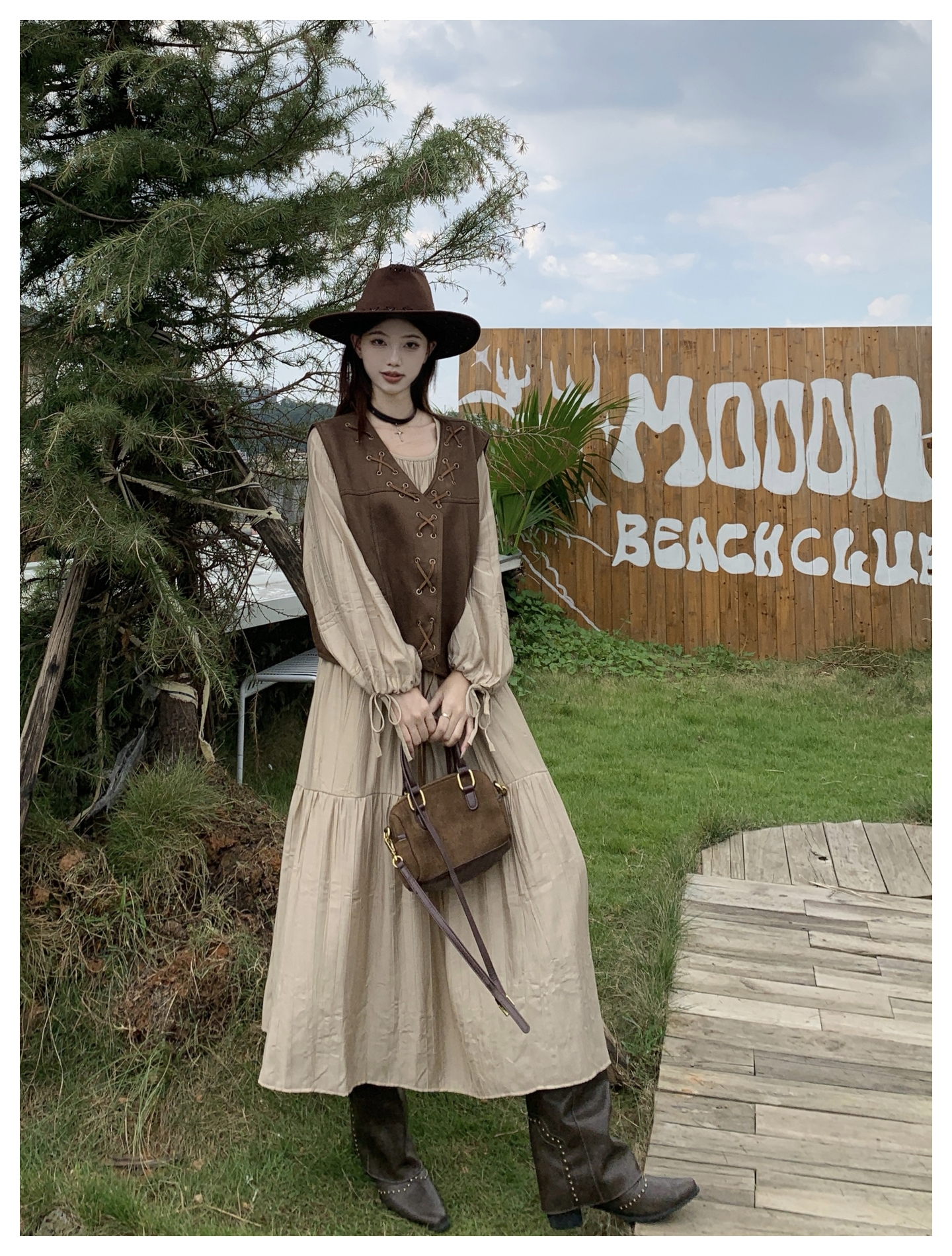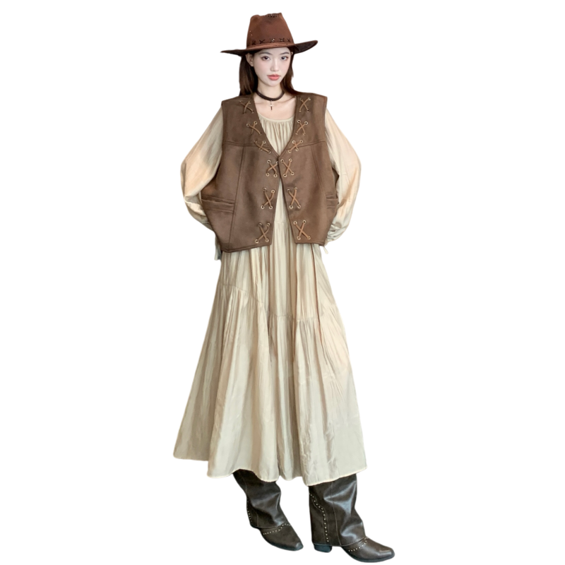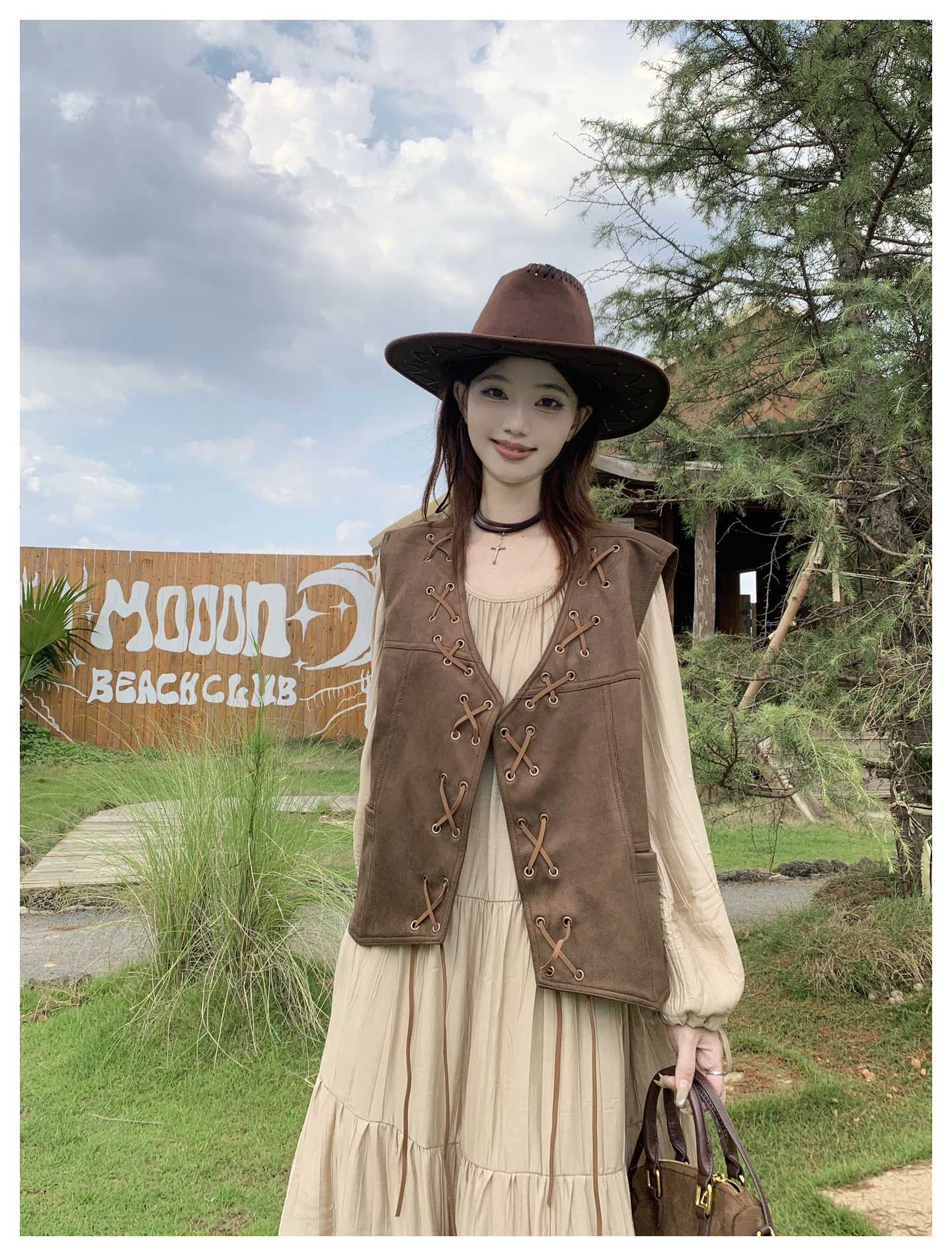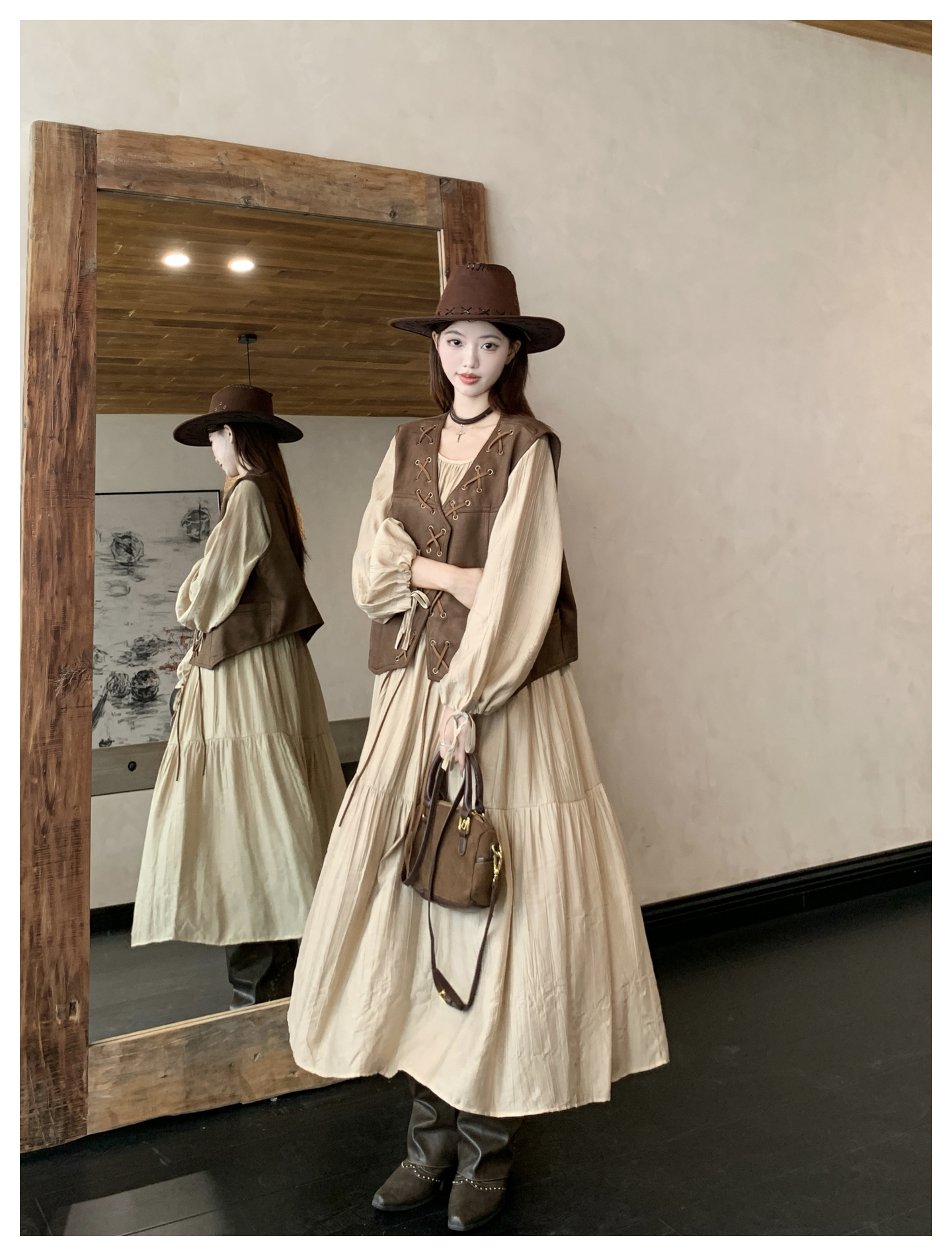 실사 스웨이드 원단 베스트 세트 여성 드레스 봄 한 부서 느긋한 바람 휴가 전원 빅 사이즈 투피스 세트