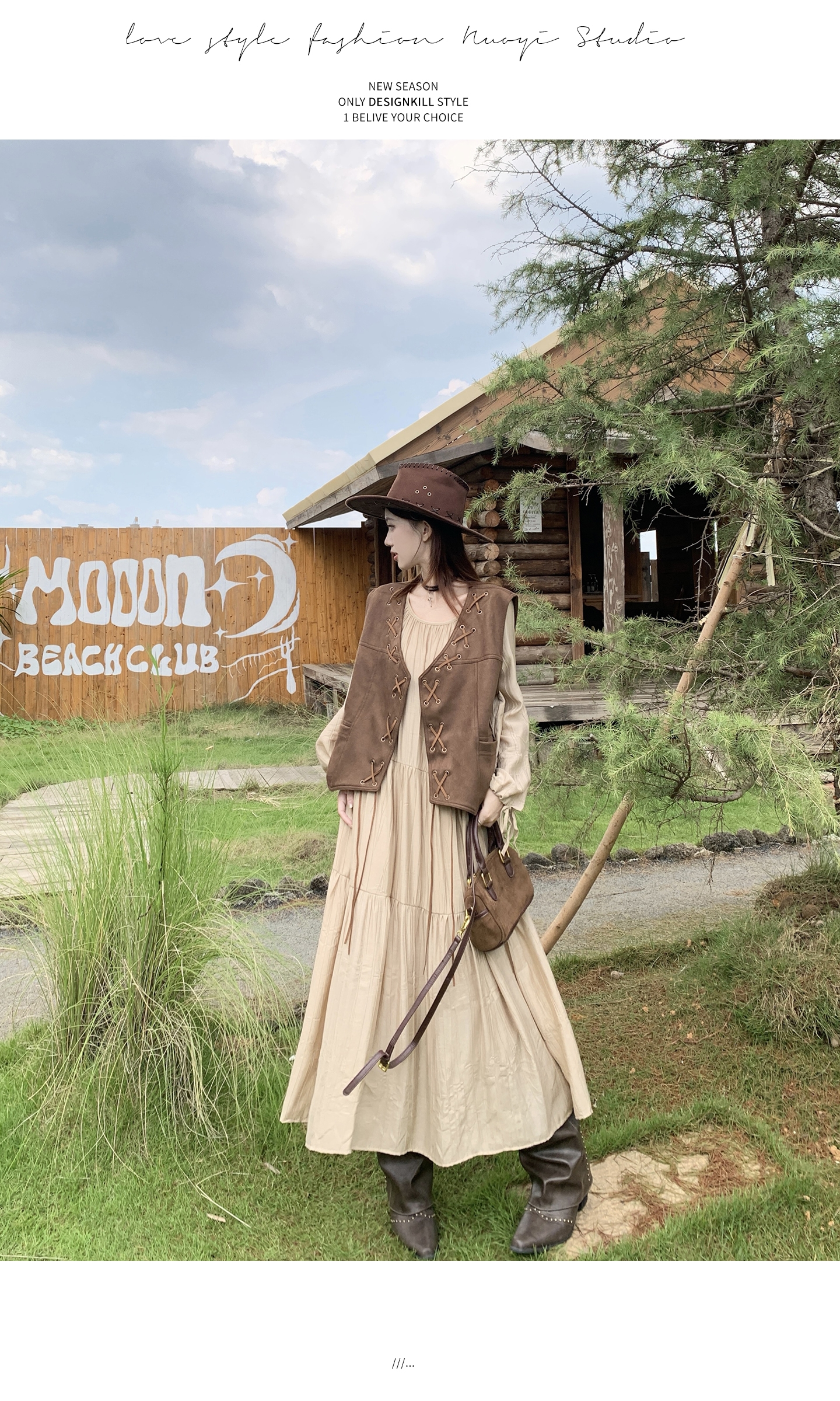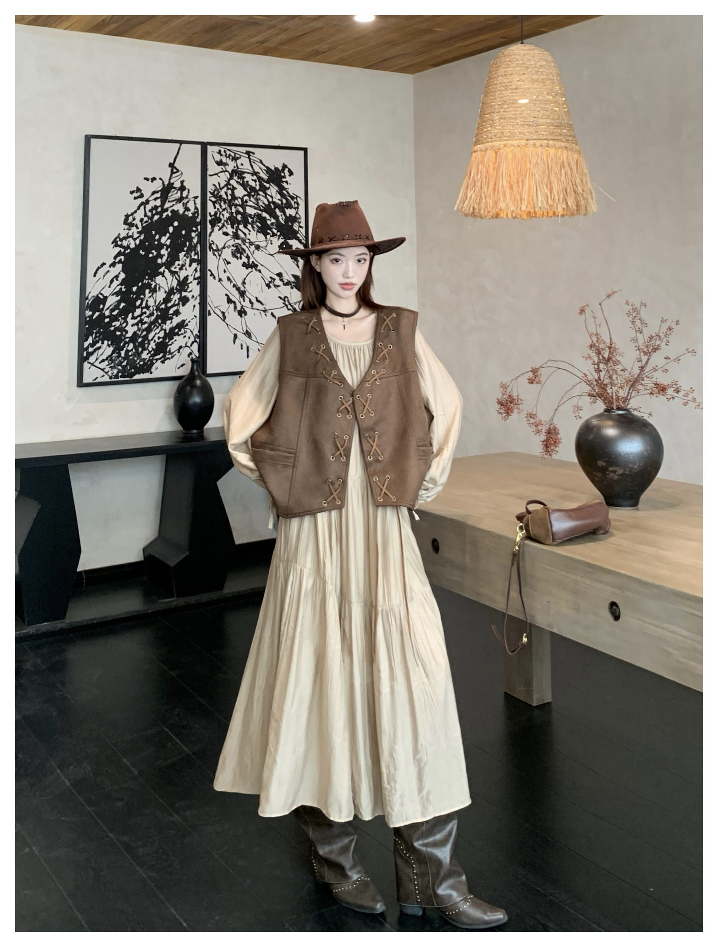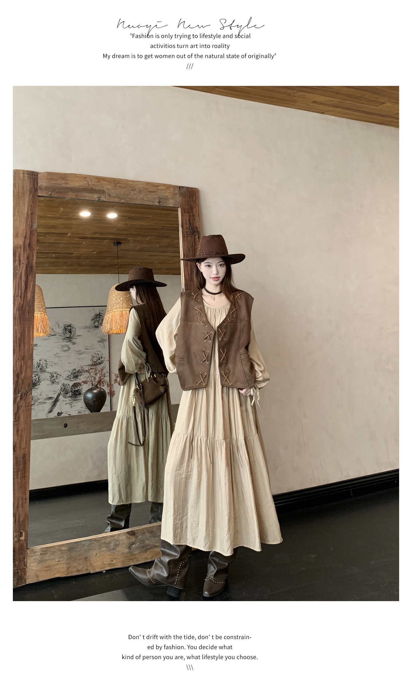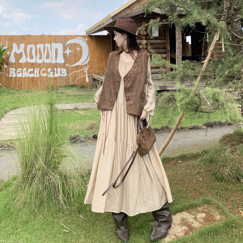 실사 스웨이드 원단 베스트 세트 여성 드레스 봄 한 부서 느긋한 바람 휴가 전원 빅 사이즈 투피스 세트