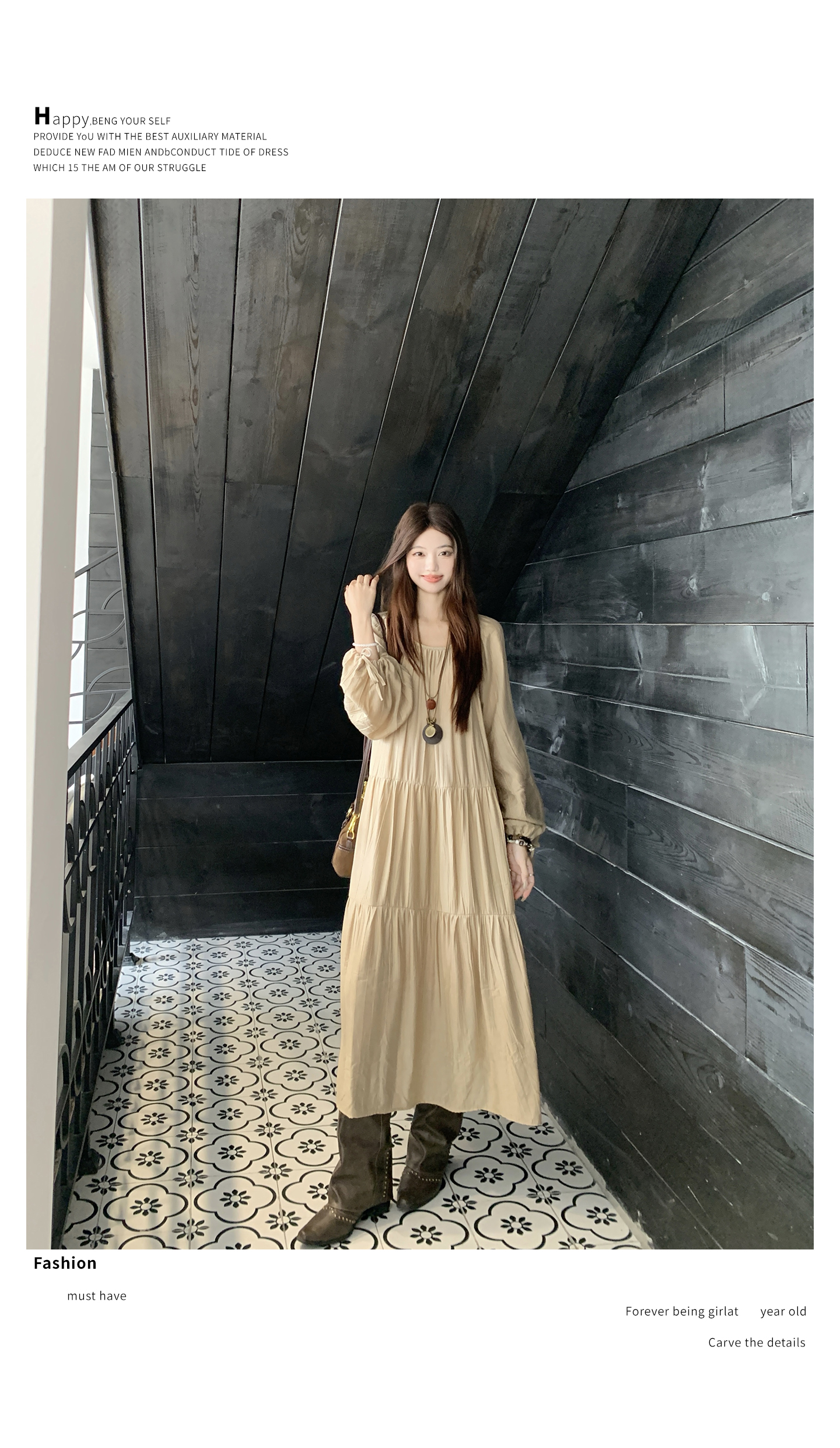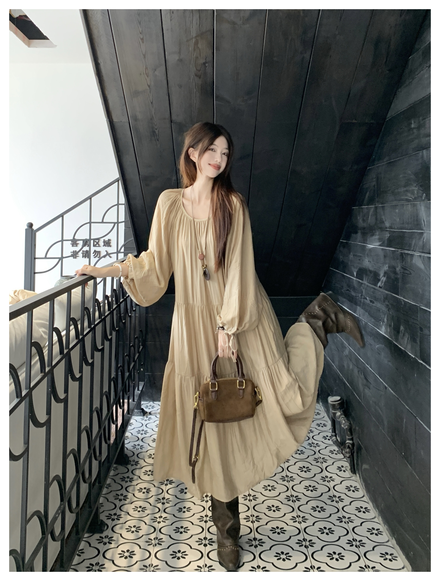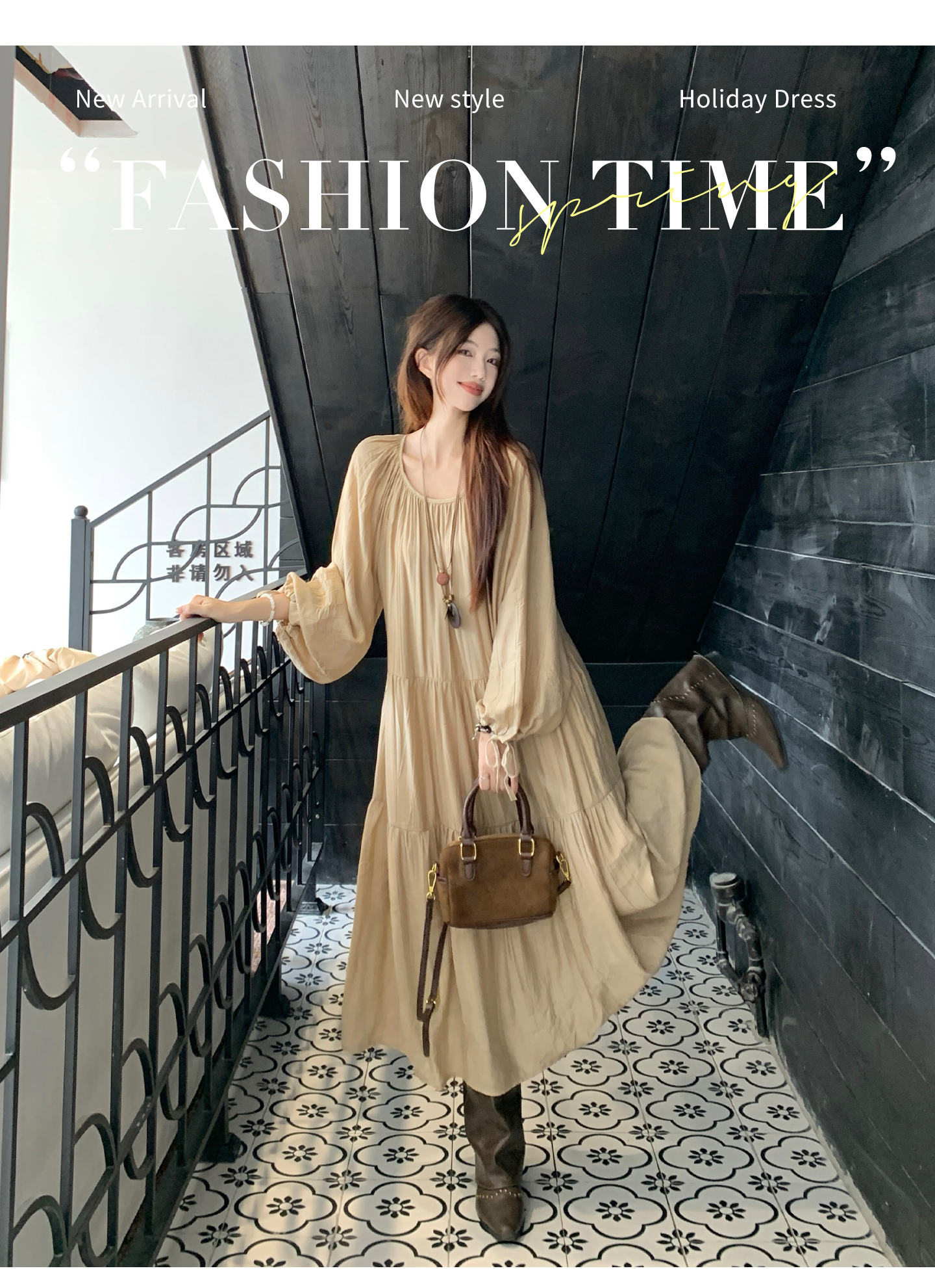 실사 가을 프랑스식 고급 센스 V넥 긴팔 드레스 2026 이른 봄 새로운 아름다운 치마 허리 수축 롱 스커트