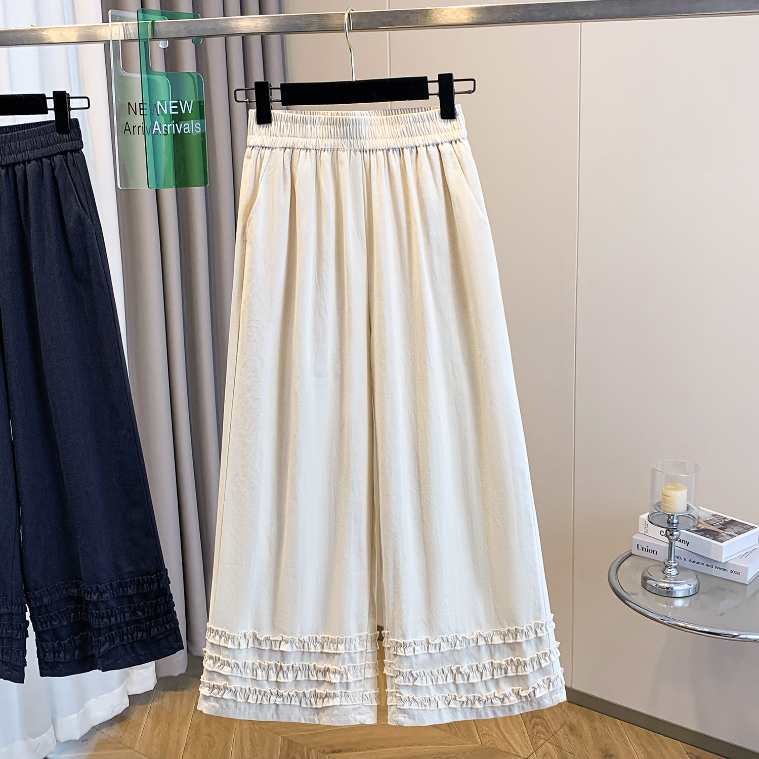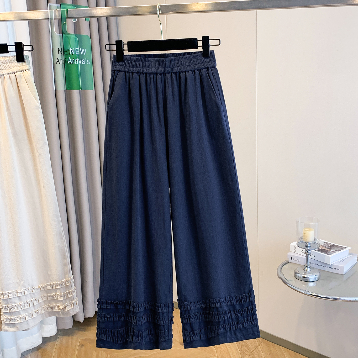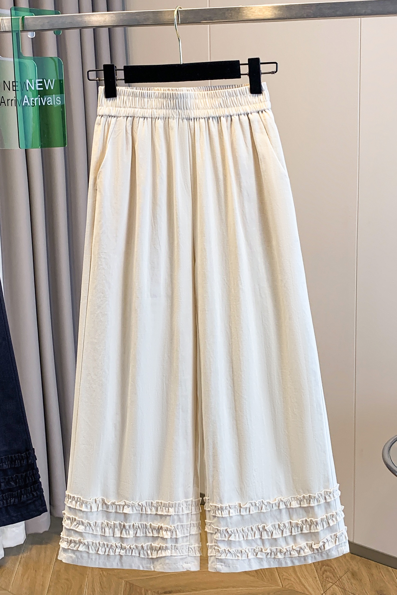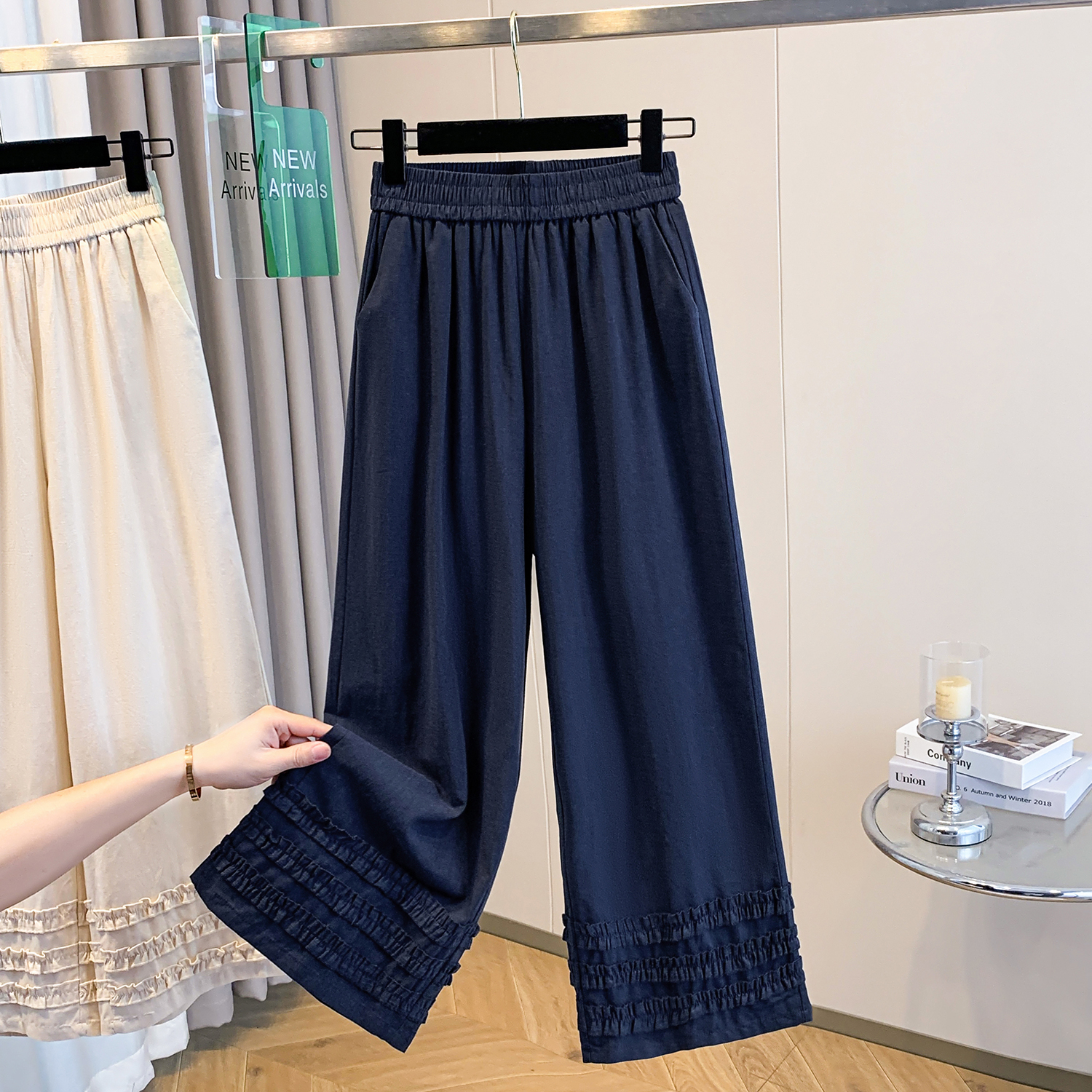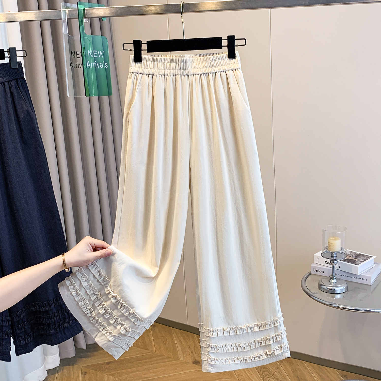 실사 여름 새로운 허리밴드 아마 목이버섯 레이스 루즈핏 9 포인트 와이드 레그 팬츠 여성 레저 다용도 스트레이트 팬츠