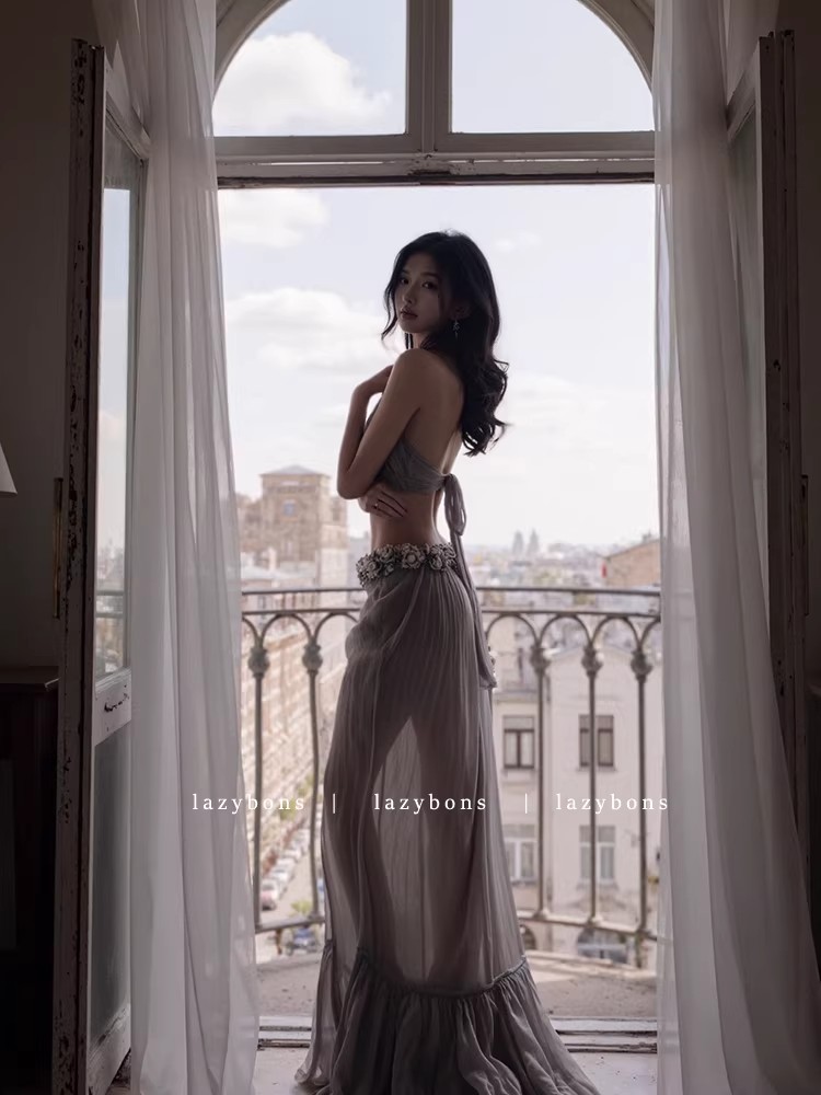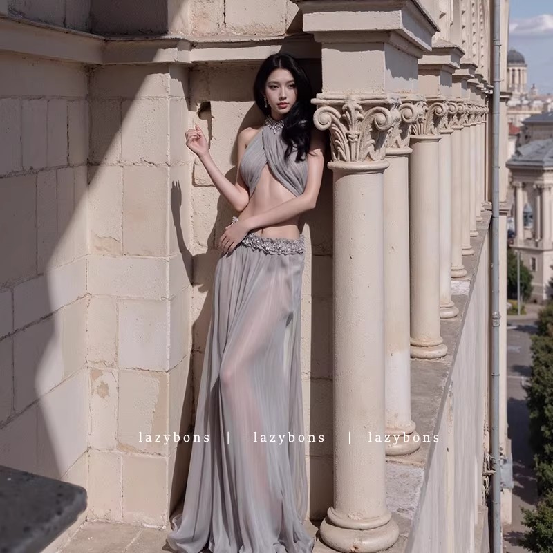 고급 센스 높음 트임 깊은 V 넥 행침 목 드레스 이슬 허리 백리스 타이트 스커트 인어 꼬리 스커트 품격 롱 스커트