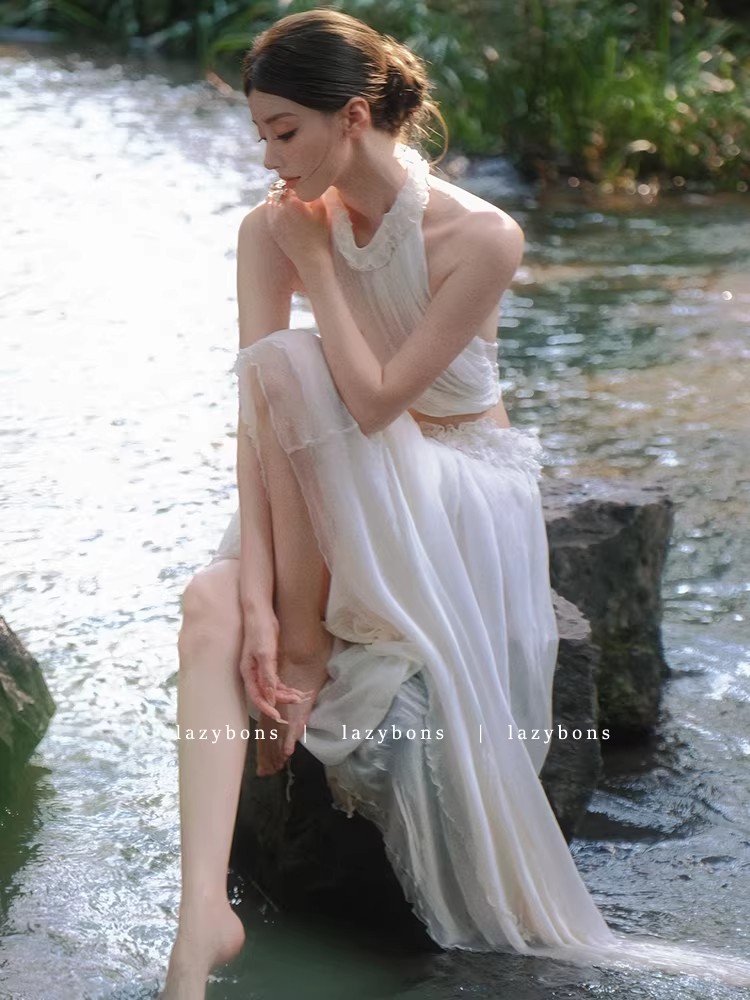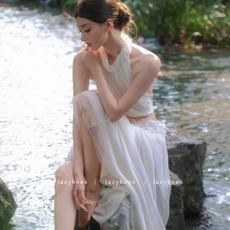 카 다몸 한여름 순수한 욕망 센스 프랑스식 홀로우 아웃 레이스 계단식 백리스 여성 드레스