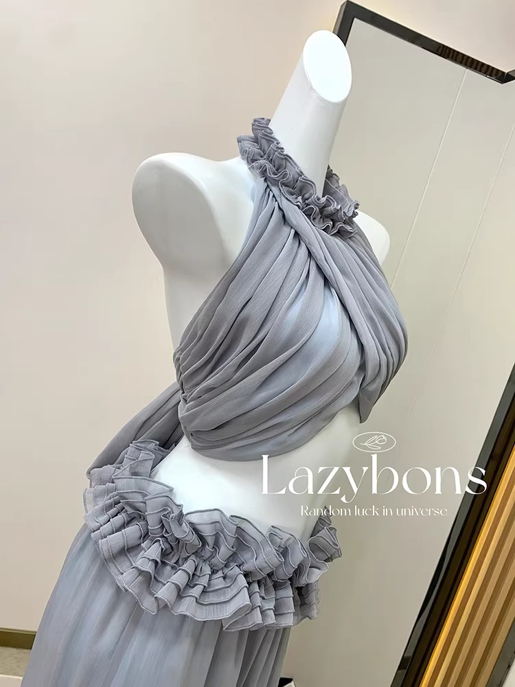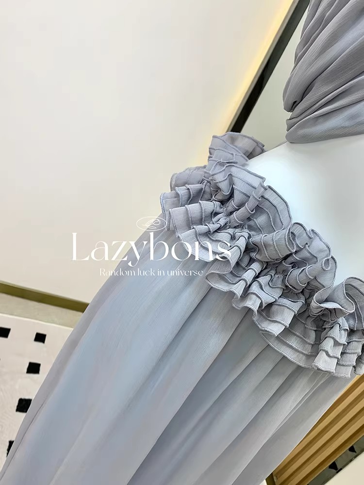 샐리 정원 망사 비스듬한 어깨 주름 허리 수축 드레스 높음 폭탄 디자인 센스 타이트 스커트