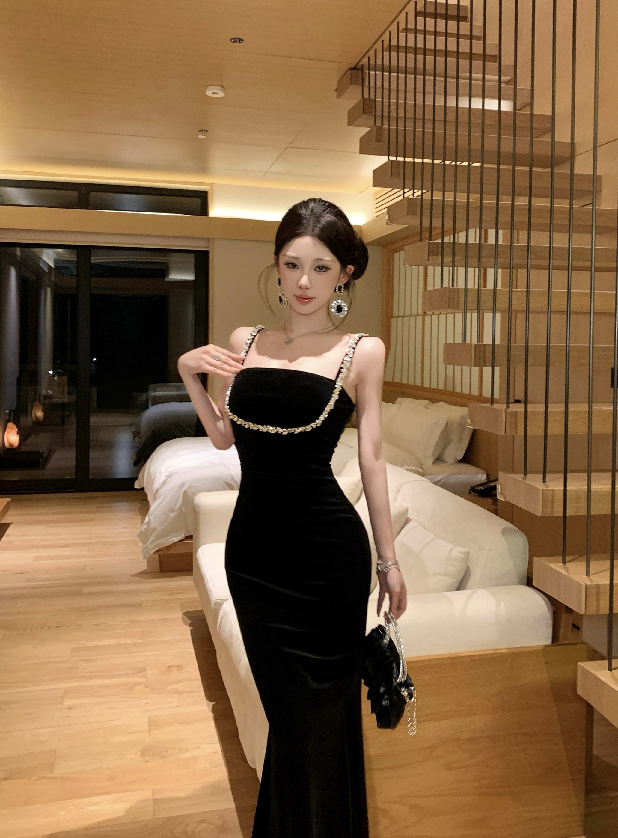 실사 정가 고급 센스 슬립 스팽글 패치워크 이브닝 드레스
