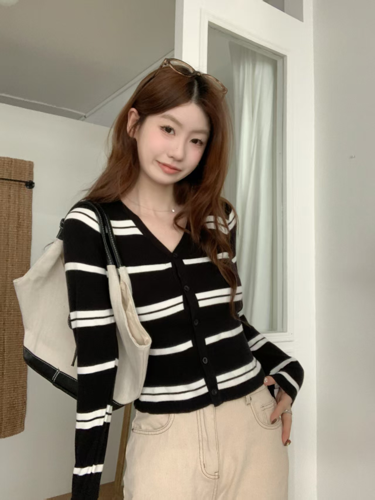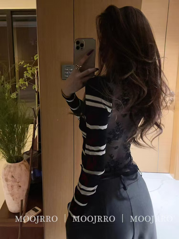 스트라이프 V넥 레이스 니트 스웨터 여성 가을 겨울철 몸매 가꾸기 인사이드 가져 가라. 섹시함 순수한 욕망 기본 셔츠 쇼트 스타일 긴팔 맨위