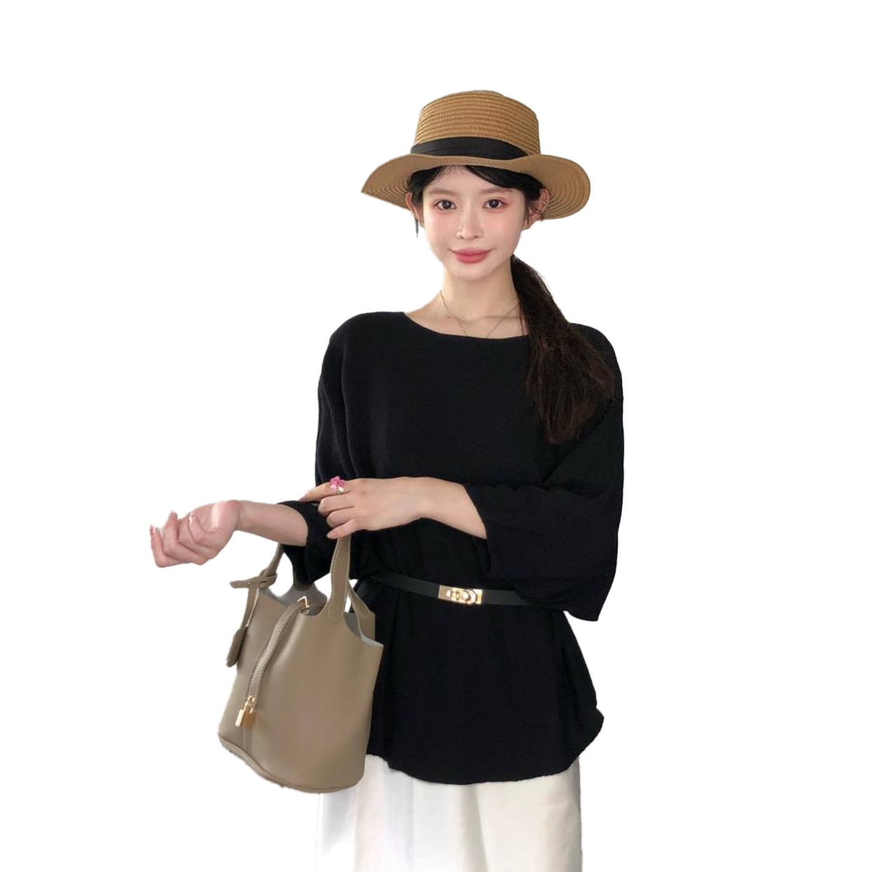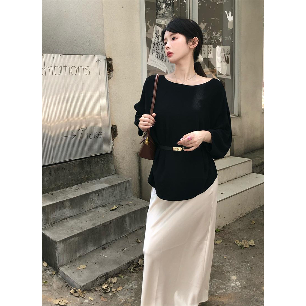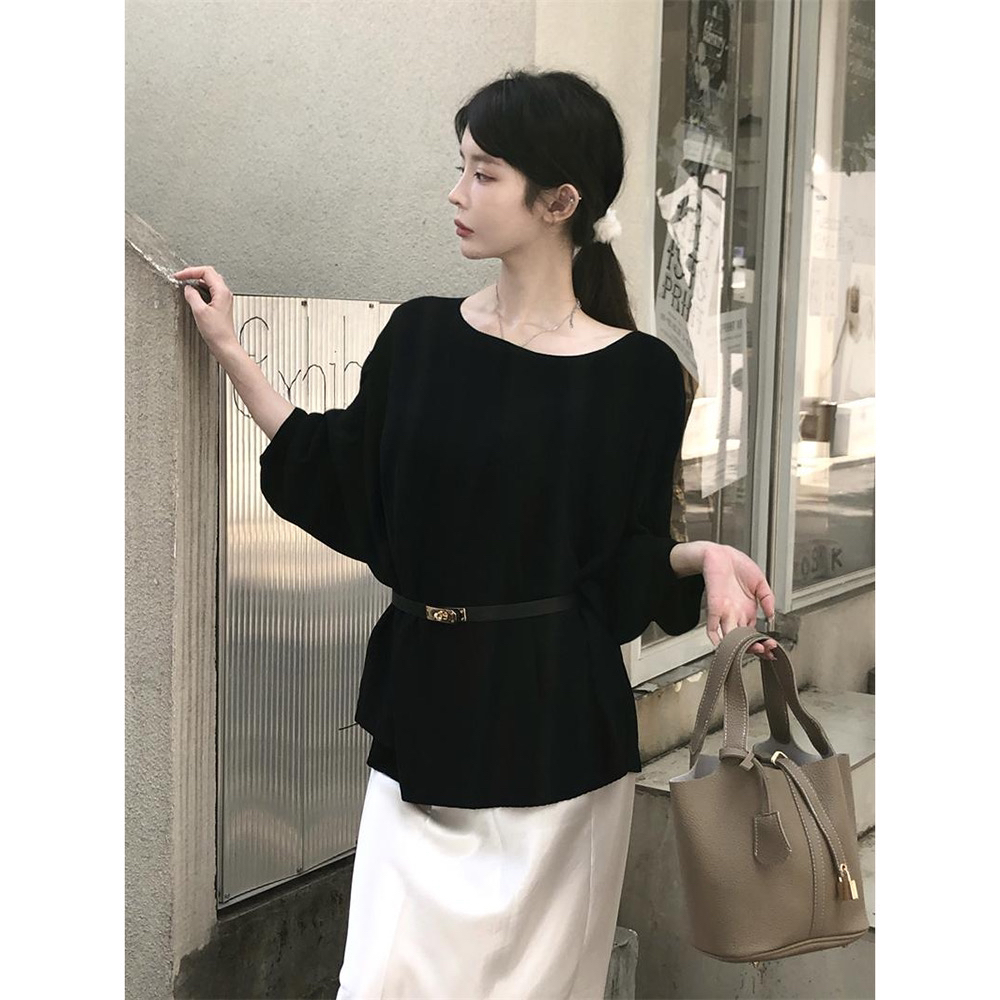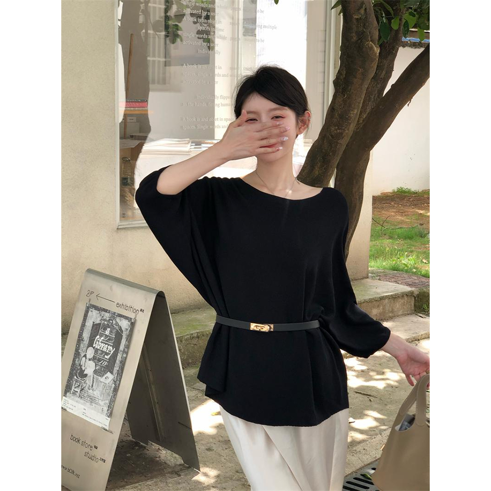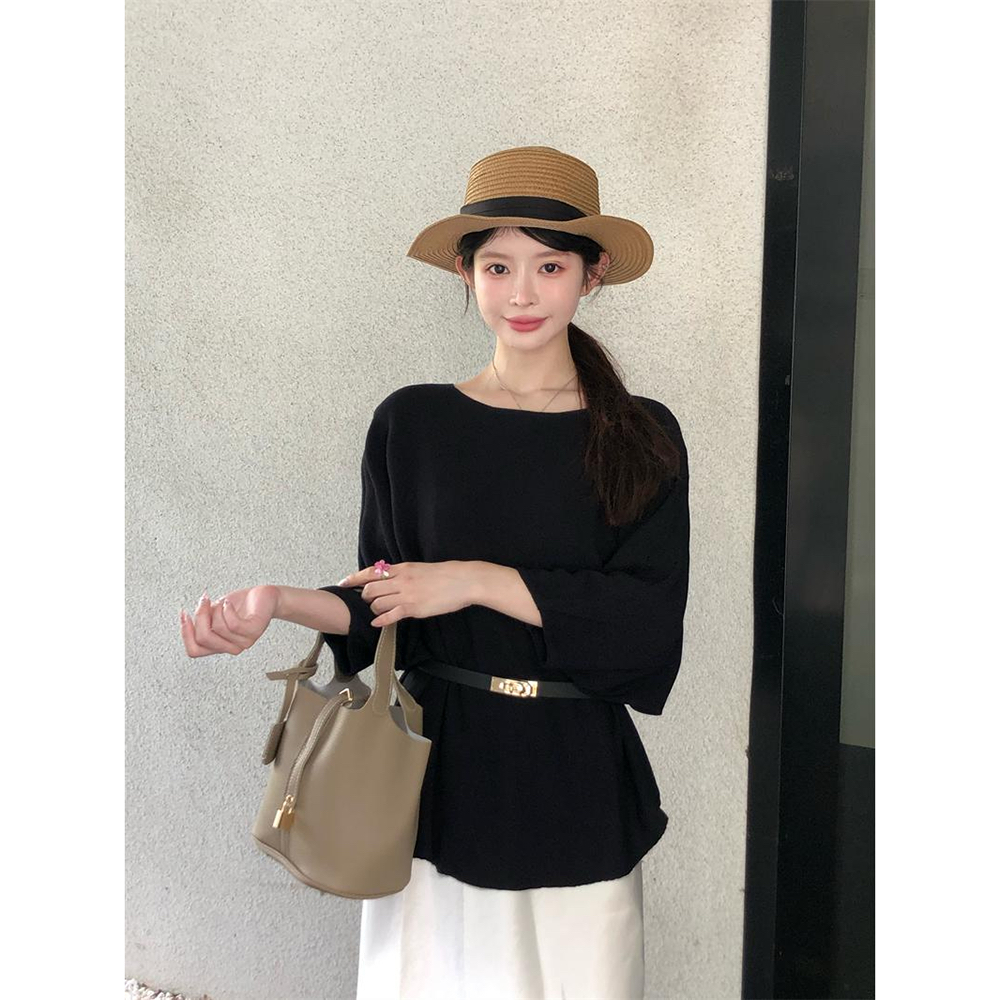 260g 모달 벨트 포함 가을 느긋한 바람 보트넥 반소매 맨위 여성 루즈핏 반팔 티셔츠