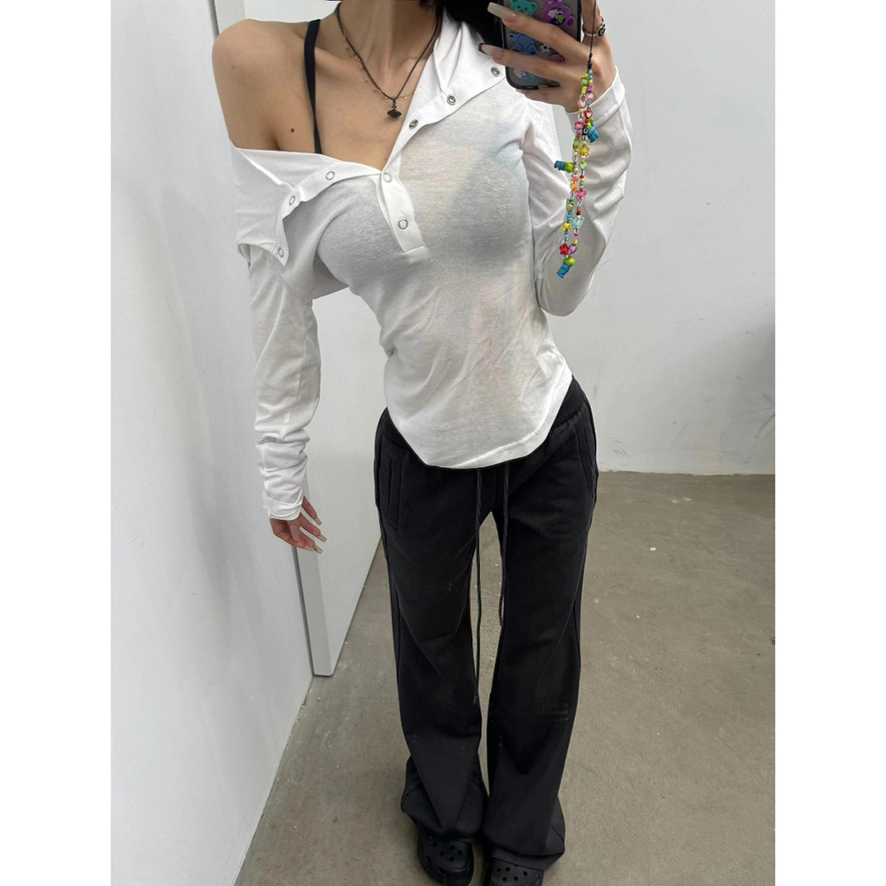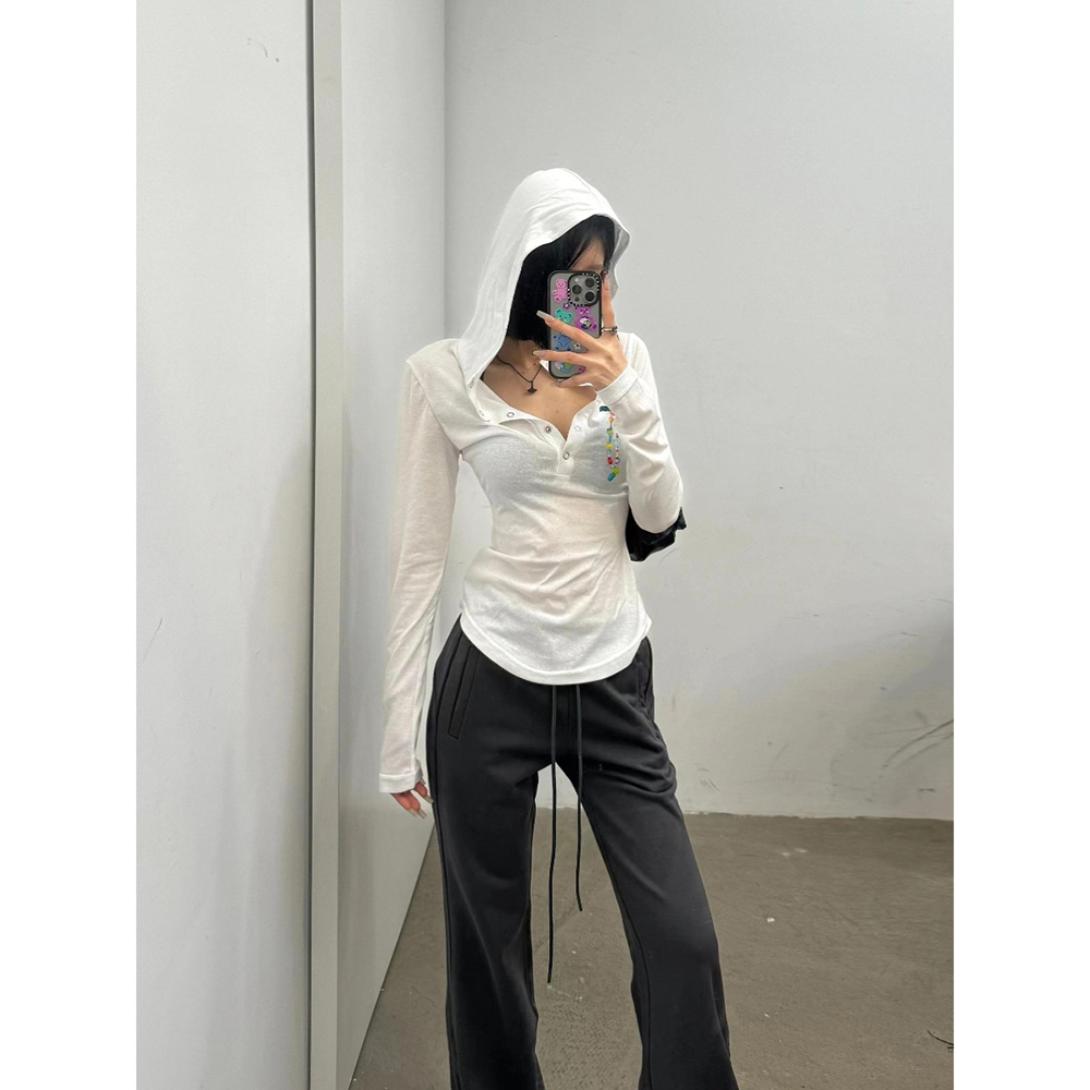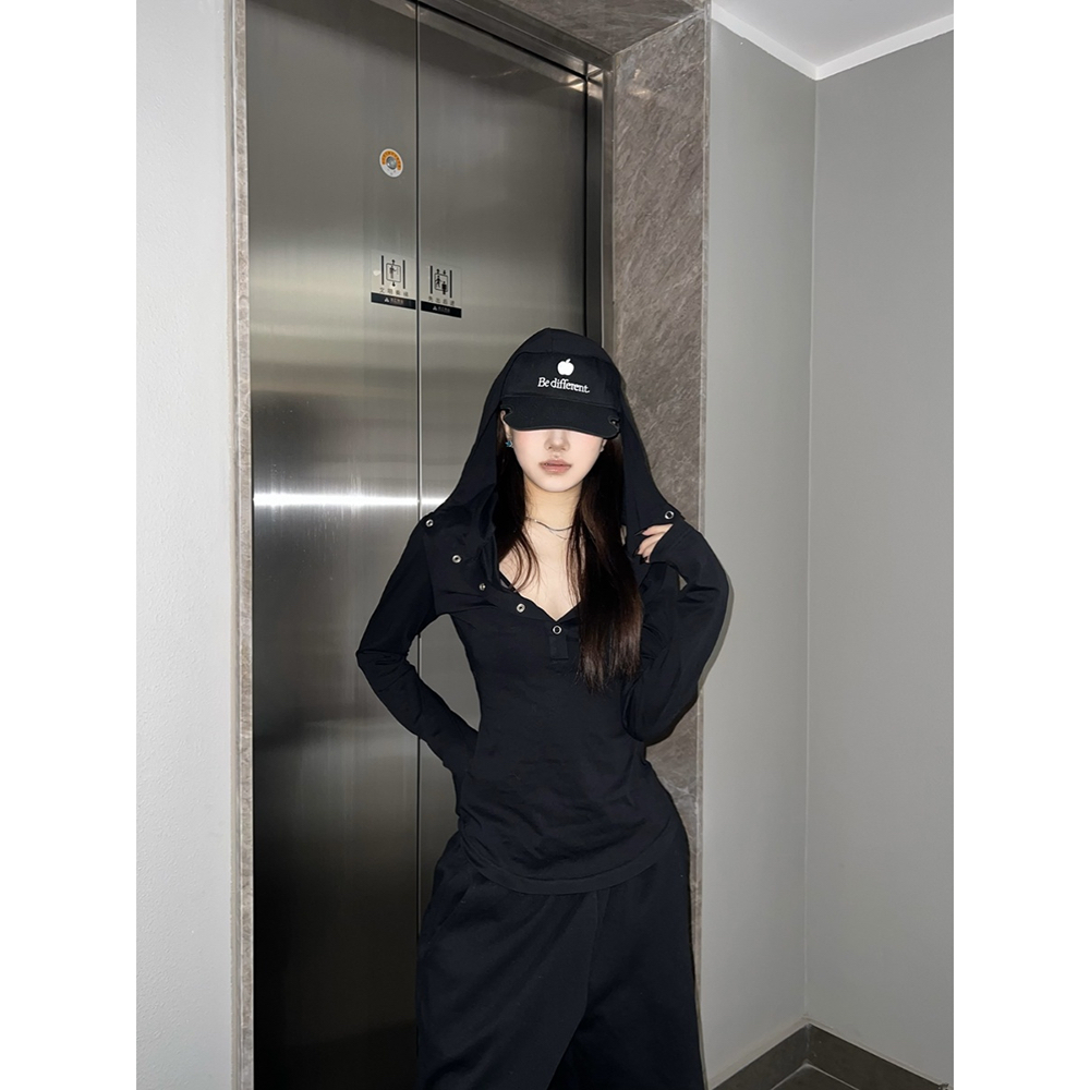 순수한 욕망 핫걸 마이크로 ~을 통해 티셔츠 여성 긴 소매 V넥 기본 셔츠 몸매 가꾸기 슬림해 보이는 자외선 차단 후드 맨위