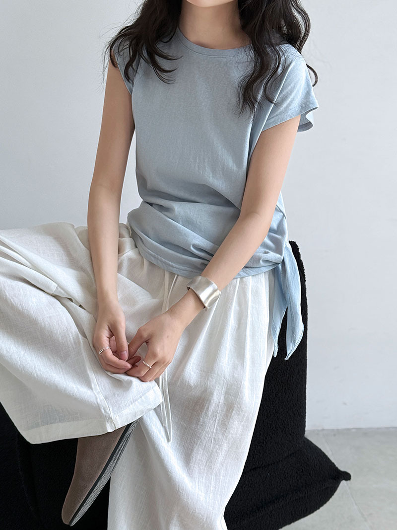 2026 한국 스타일 미니멀리즘 몸매 가꾸기 레이스업 반팔 여성 여름 새로운 허리 수축 불규칙 밑단 티셔츠 맨위