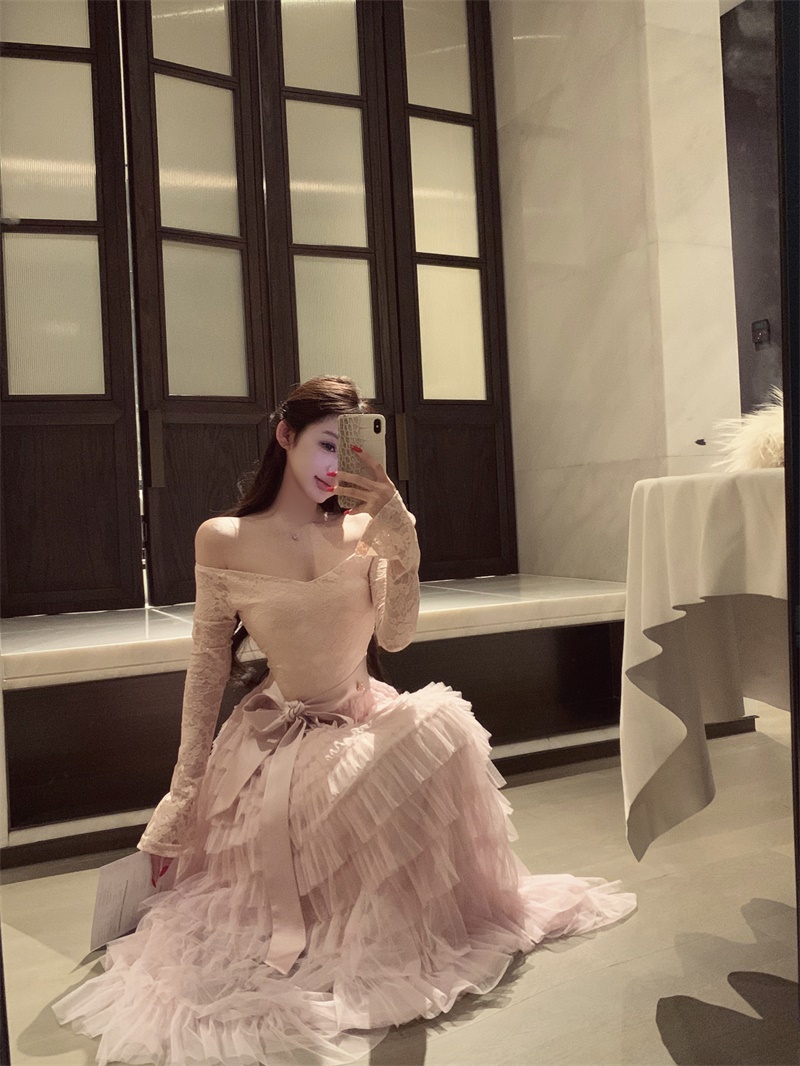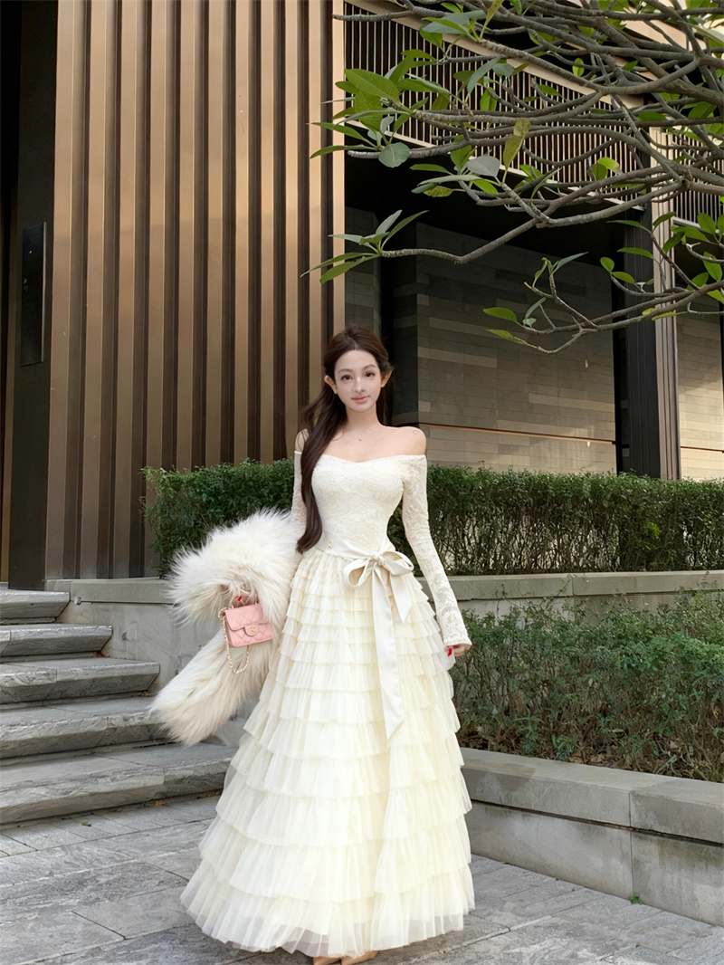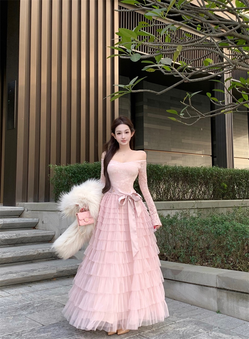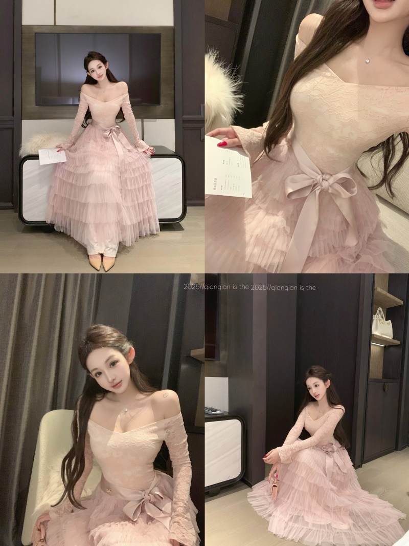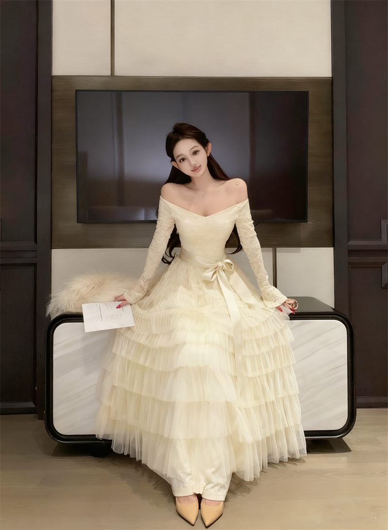 실사 정가 희미한 조명 흔들다 칼라 레이스 레이스 드레스 패션 롱 스커트