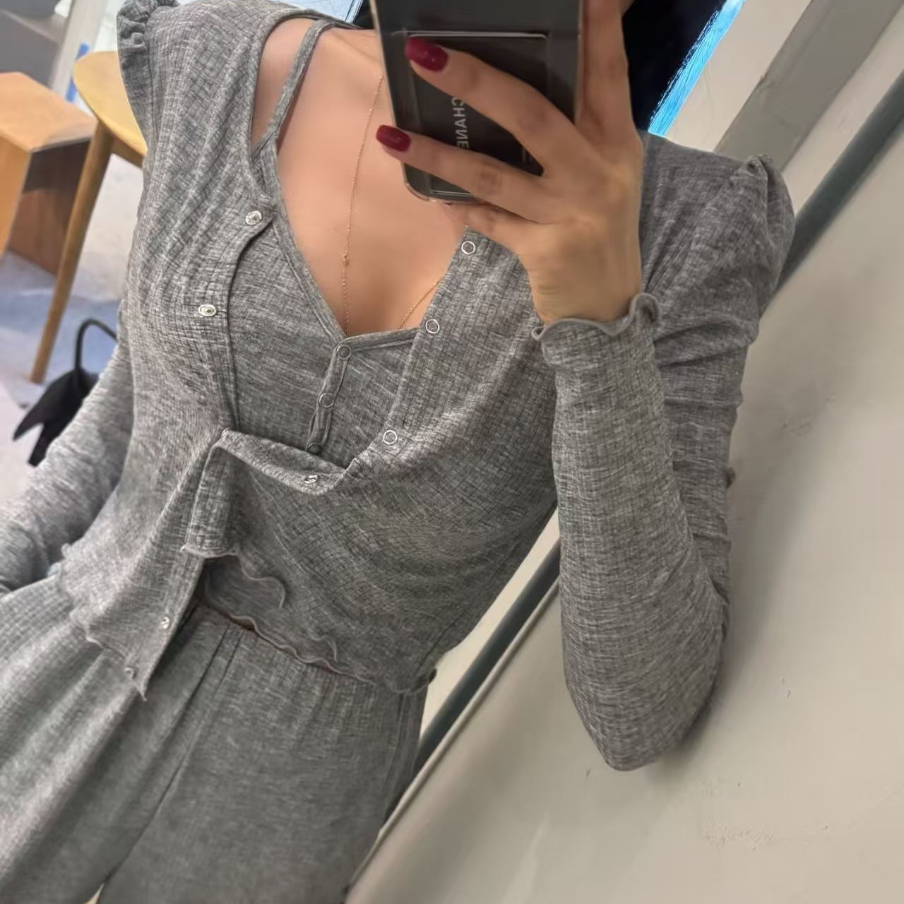 muzm 회색 니트 통기성 자카드 공예 티셔츠 슬림해 보이는 세 조각 로드 중 치마 여름 디자인 센스 세트