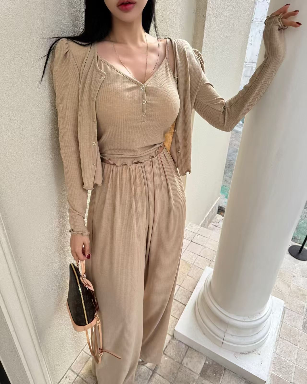 재고 있음 한국 동대문 봄 여름 달콤함 프릴 맨위 캐주얼 바지 세트