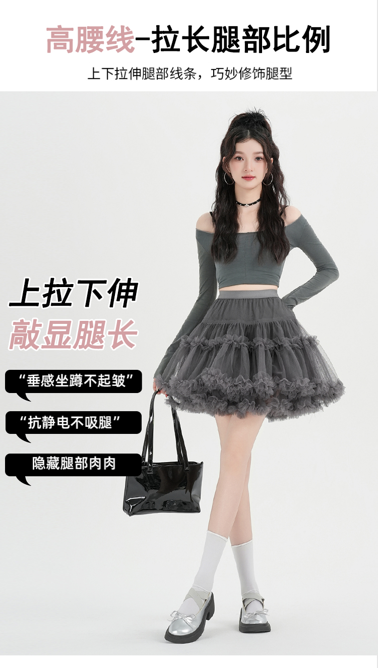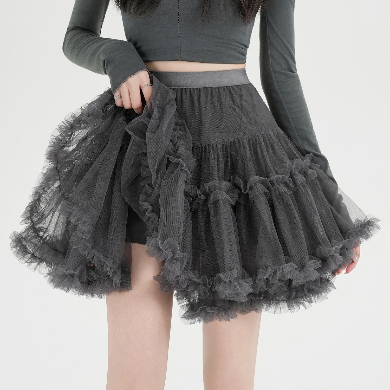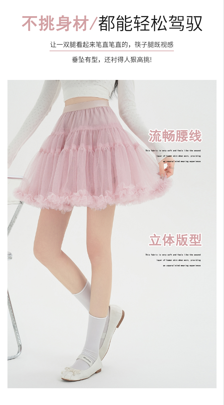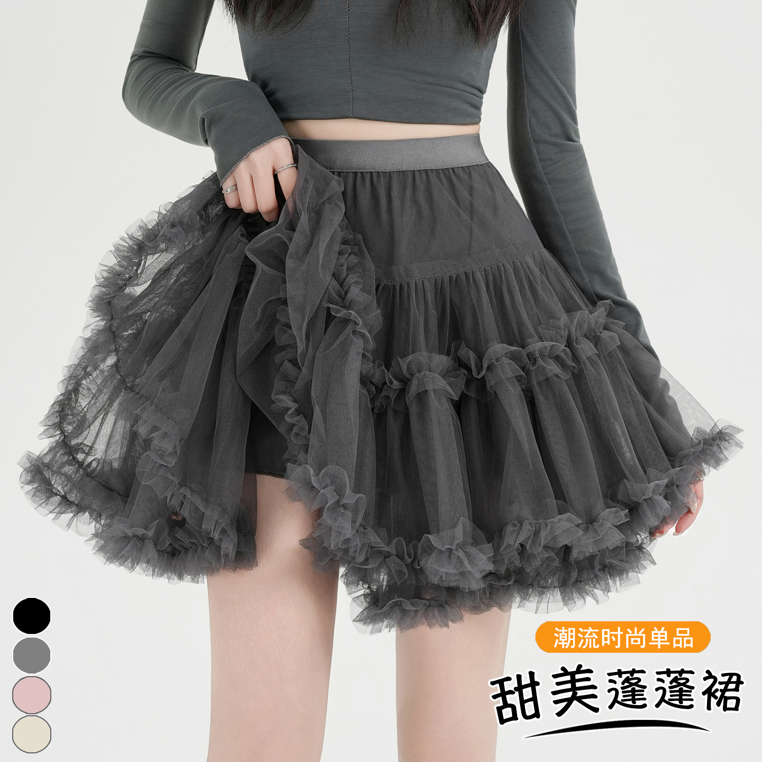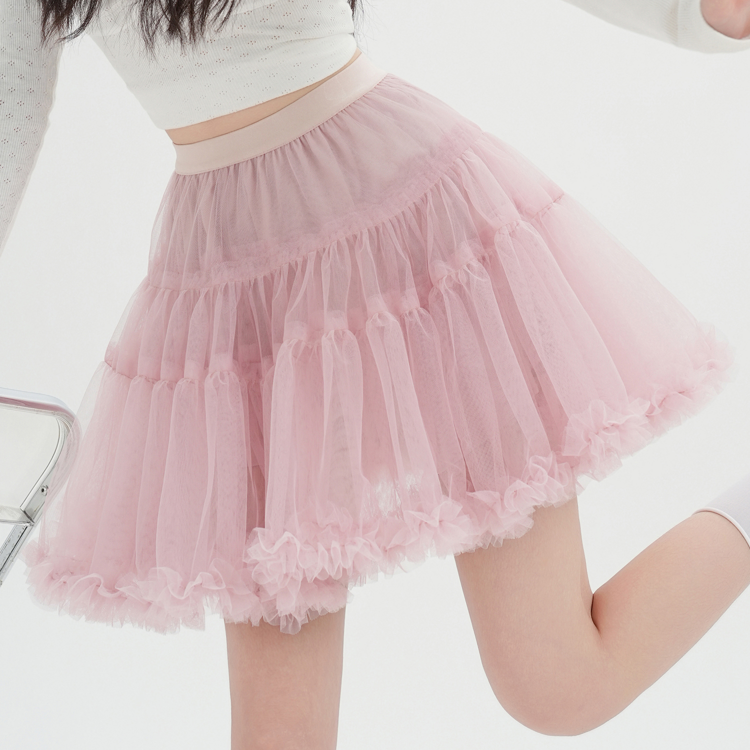 실사 2026 봄 여름 새로운 발레 바람 망사 케이크 드레스 허리밴드 퍼프 프릴 미니 스커트 A라인 스커트