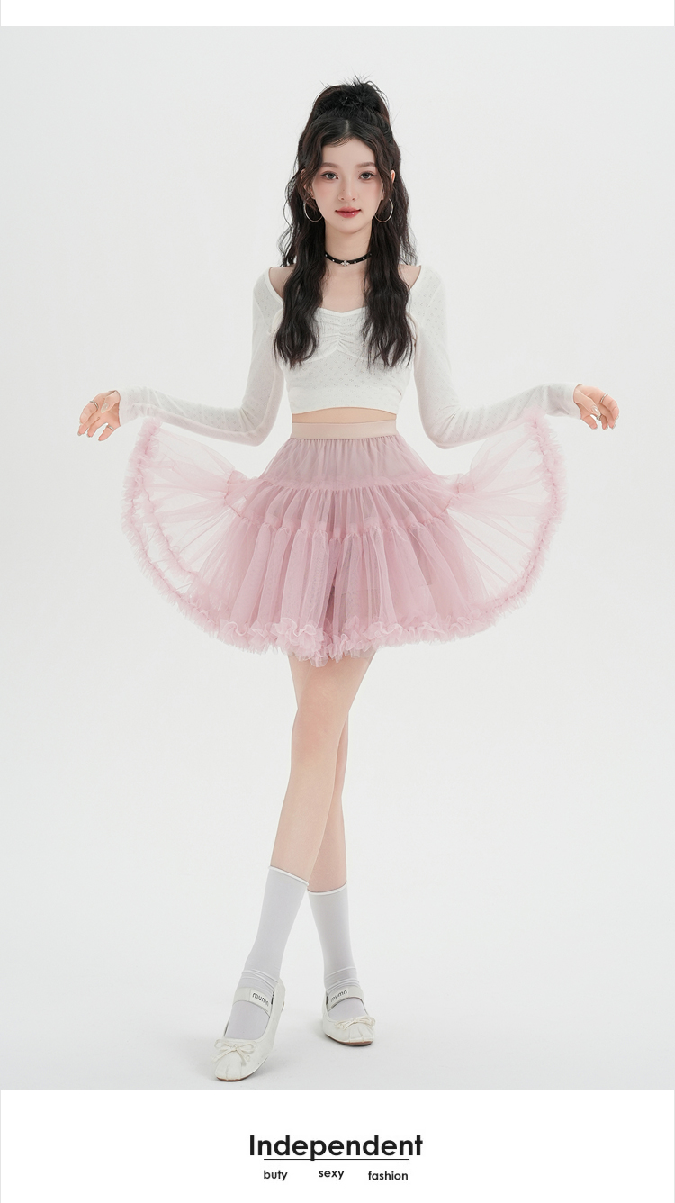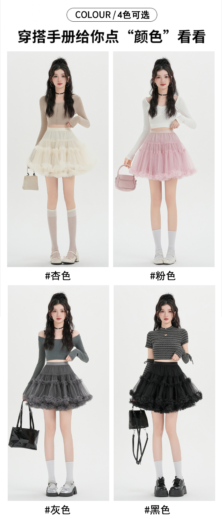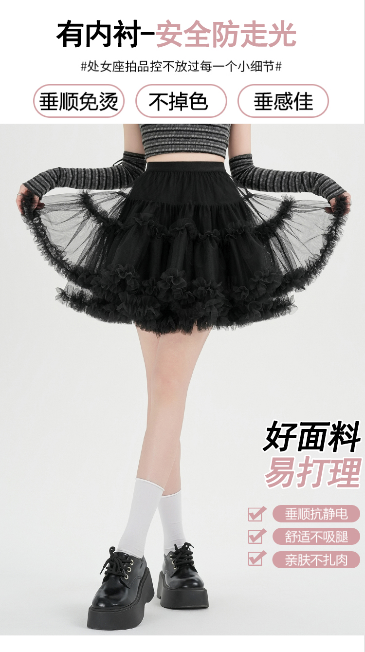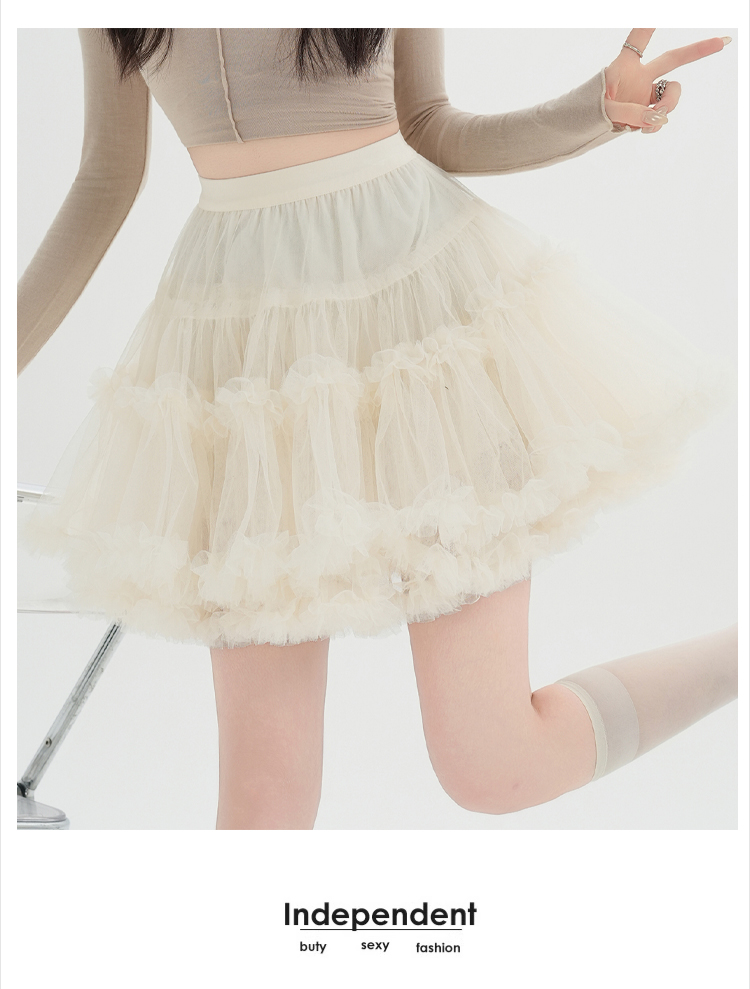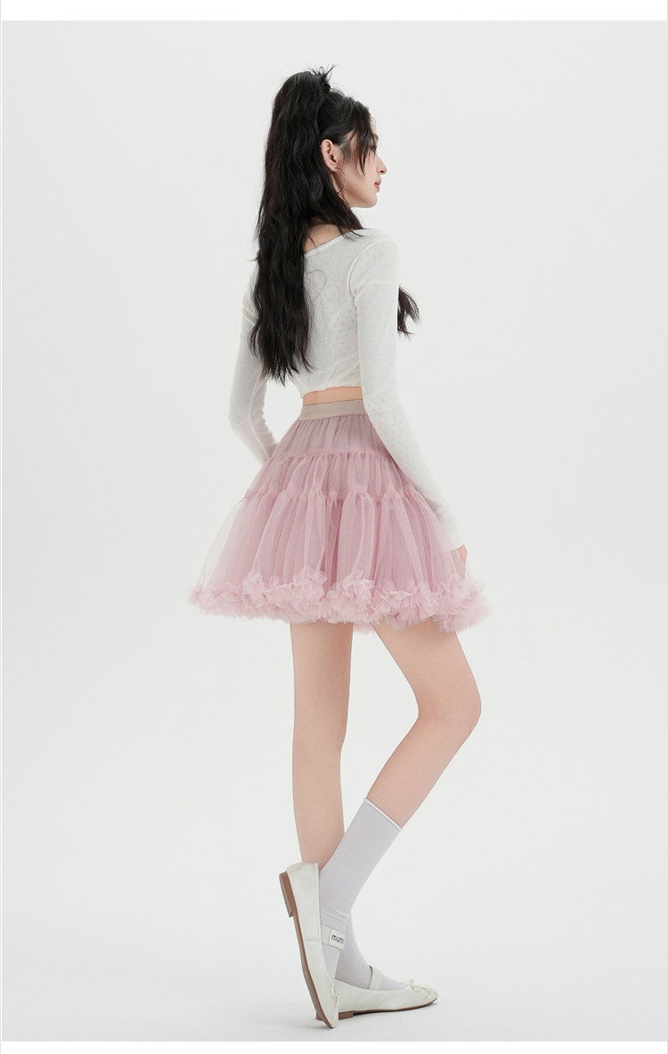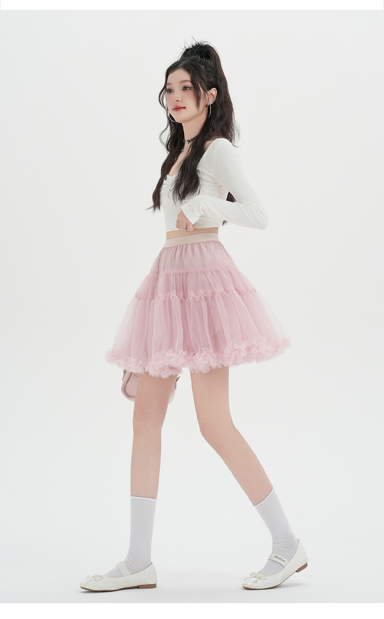 실사 2026 봄 여름 새로운 발레 바람 망사 케이크 드레스 허리밴드 퍼프 프릴 미니 스커트 A라인 스커트