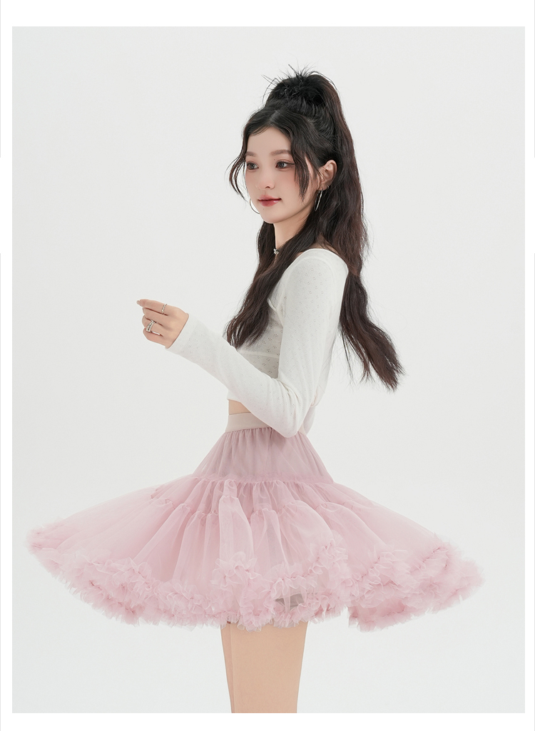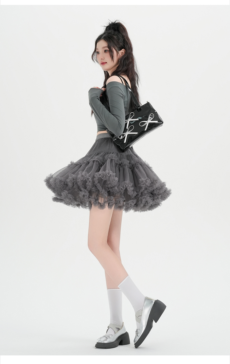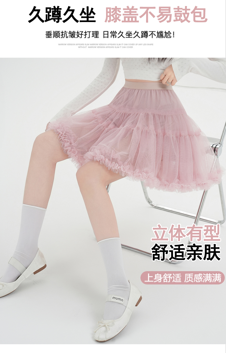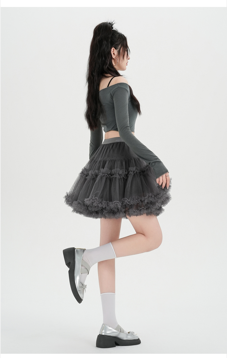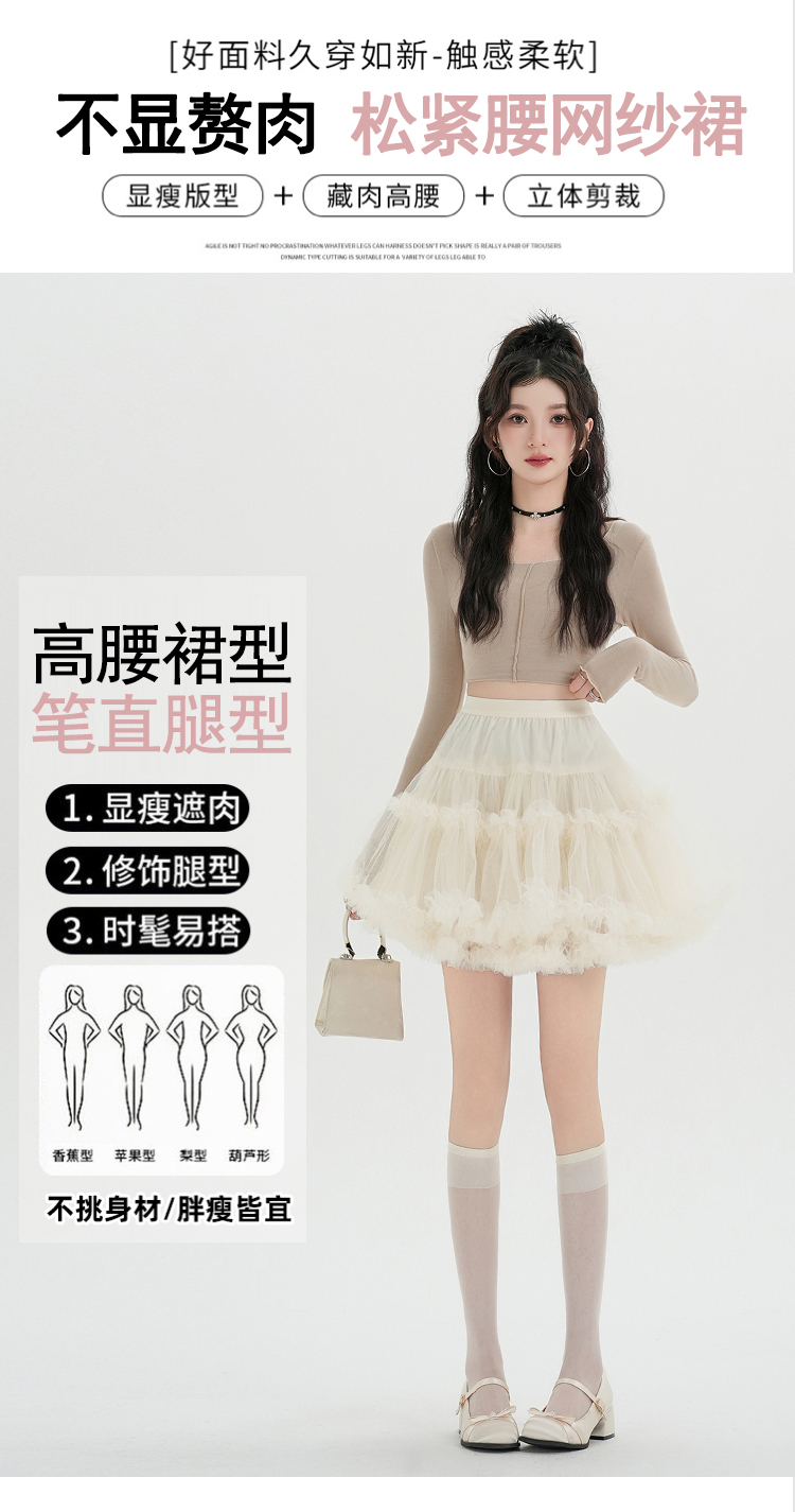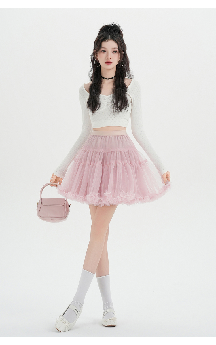 실사 2026 봄 여름 새로운 발레 바람 망사 케이크 드레스 허리밴드 퍼프 프릴 미니 스커트 A라인 스커트