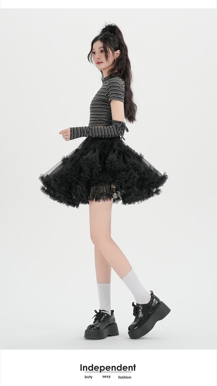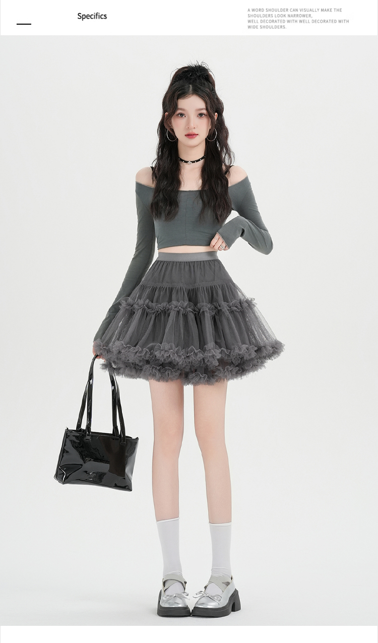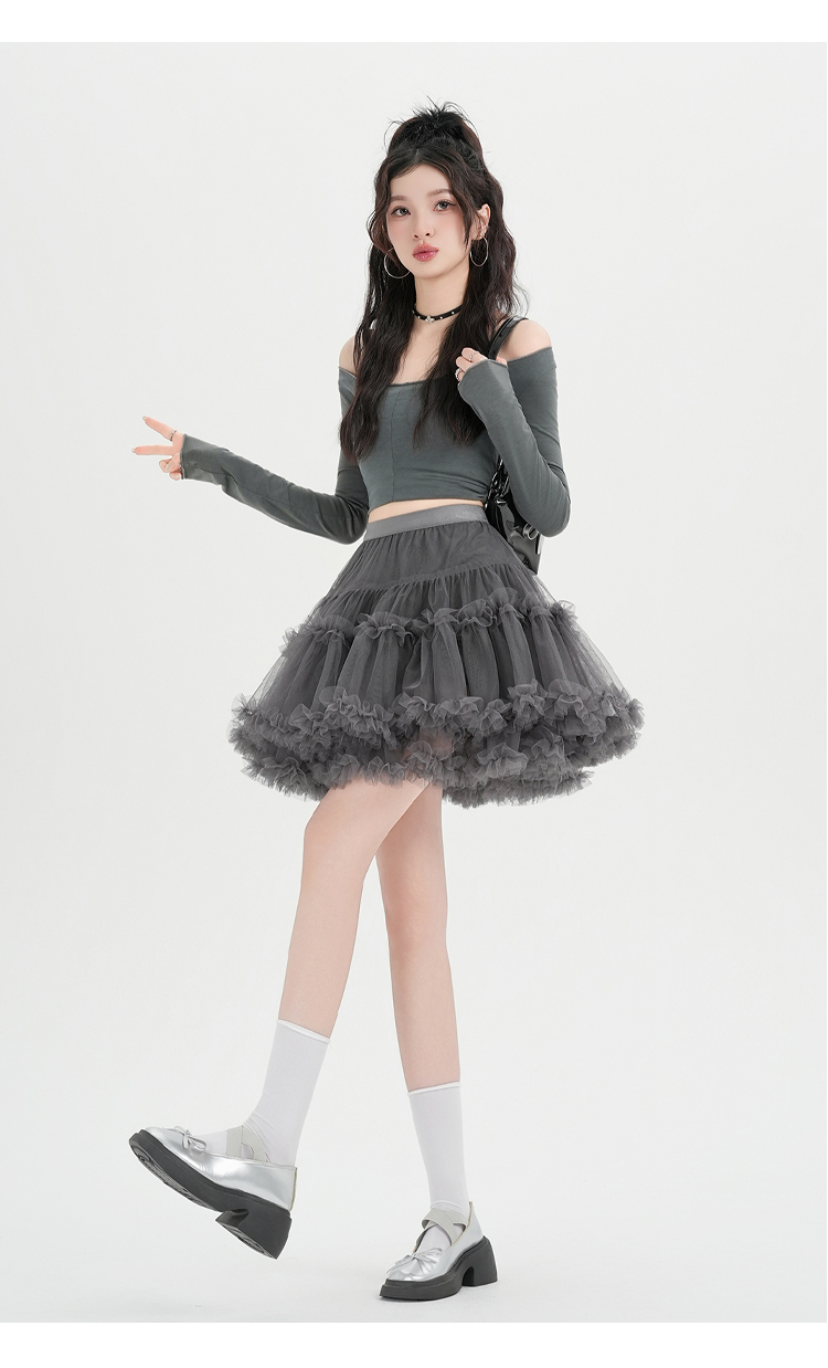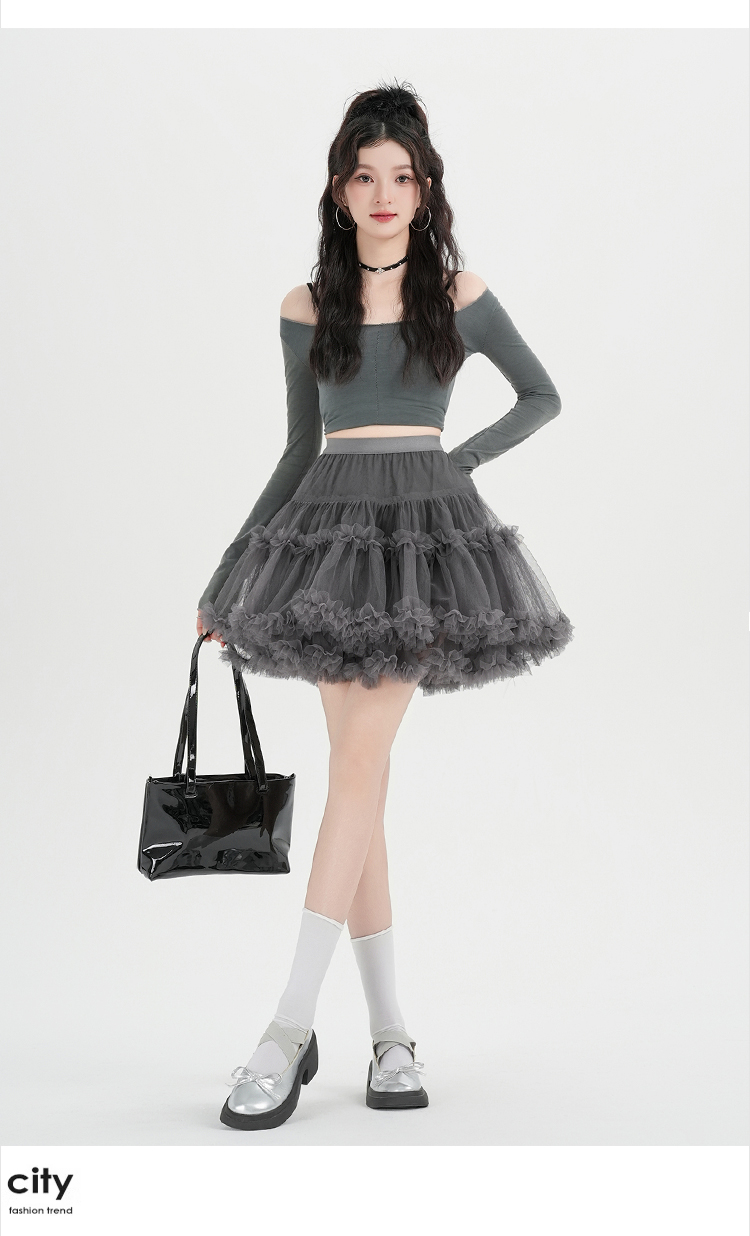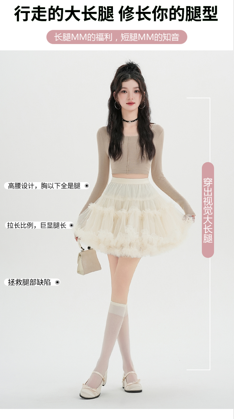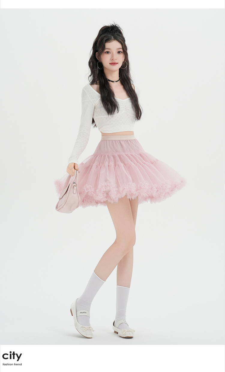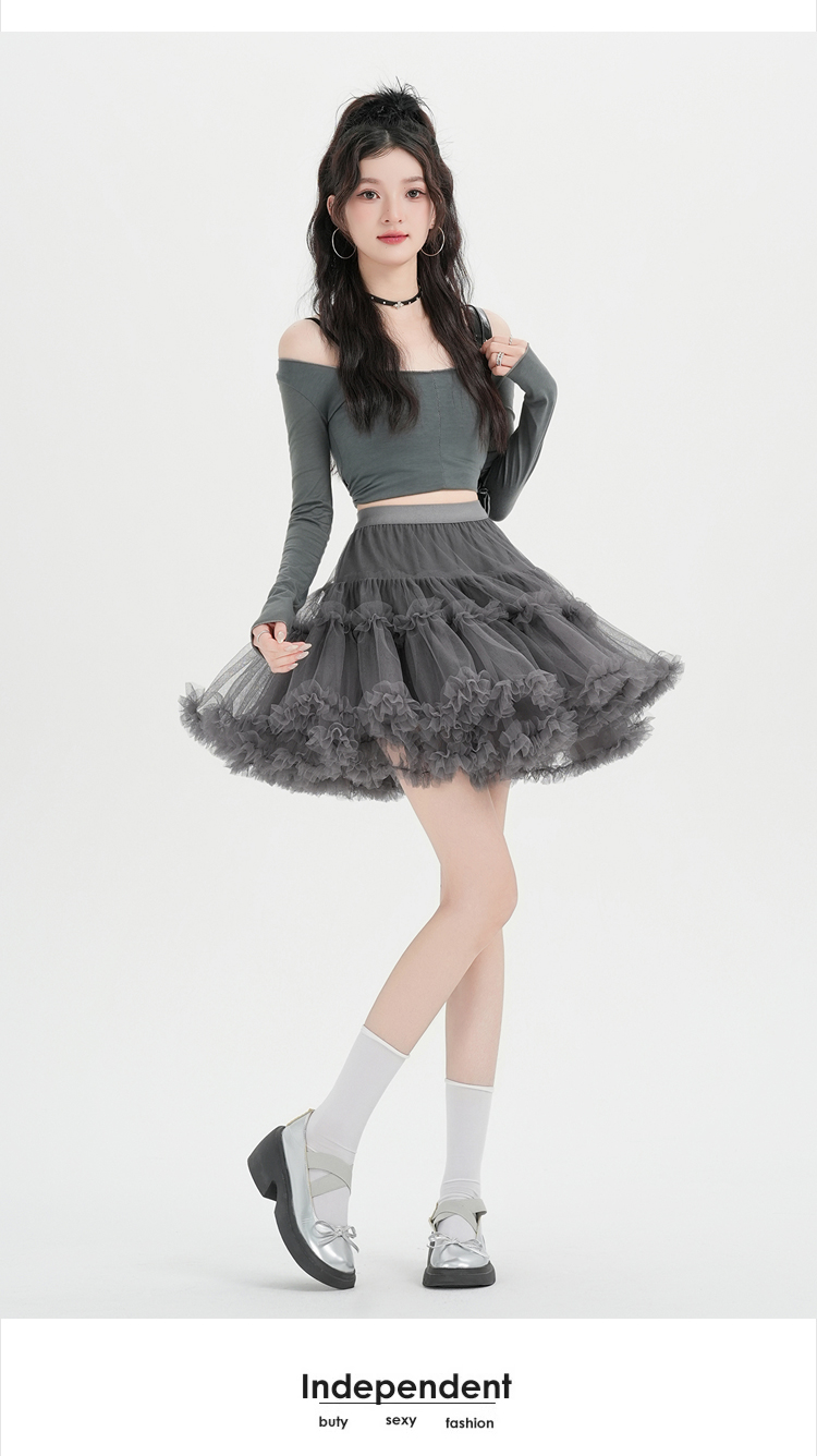 실사 2026 봄 여름 새로운 발레 바람 망사 케이크 드레스 허리밴드 퍼프 프릴 미니 스커트 A라인 스커트