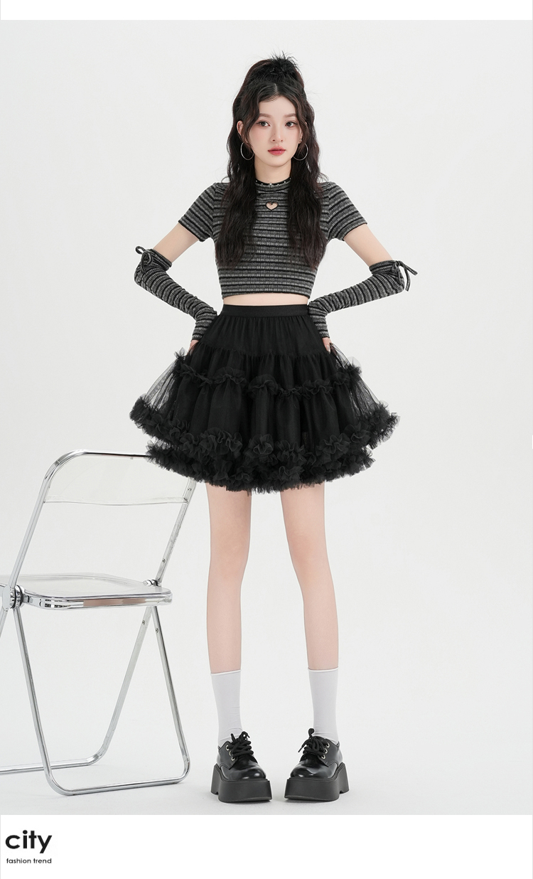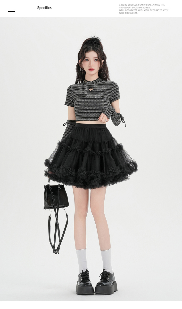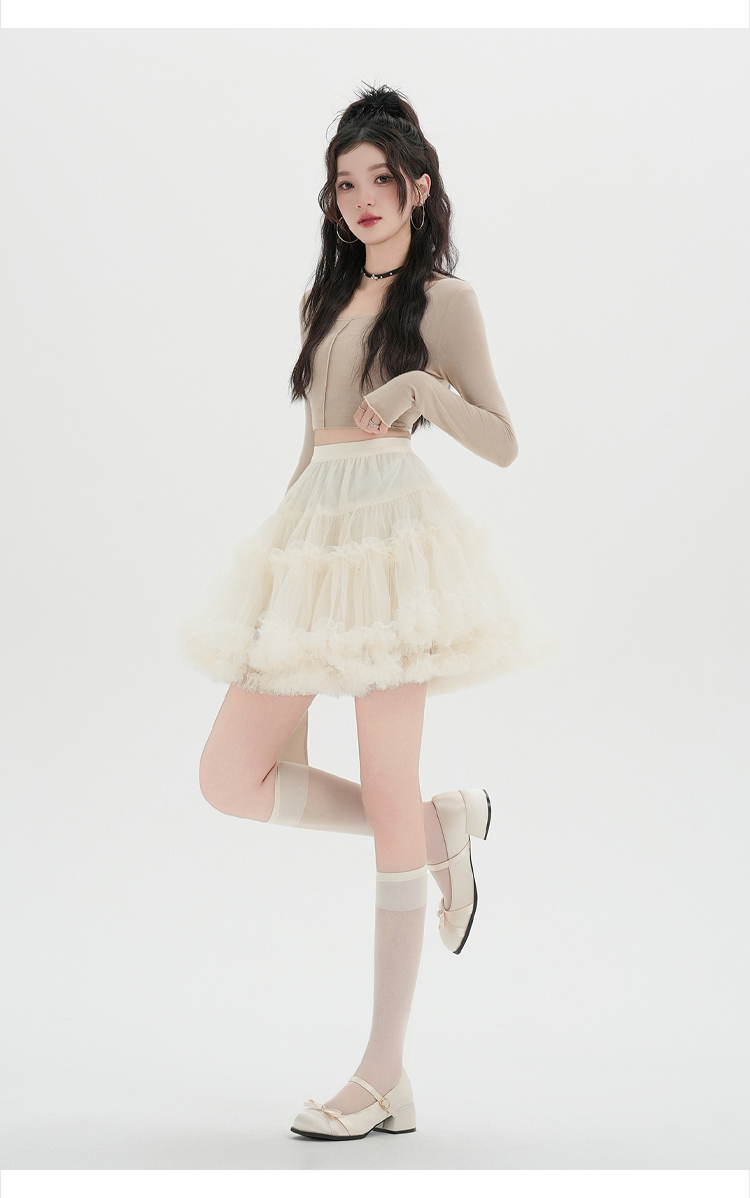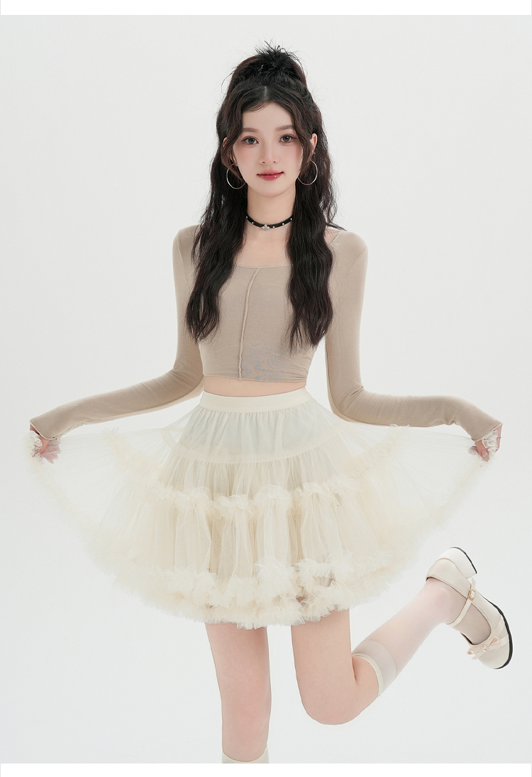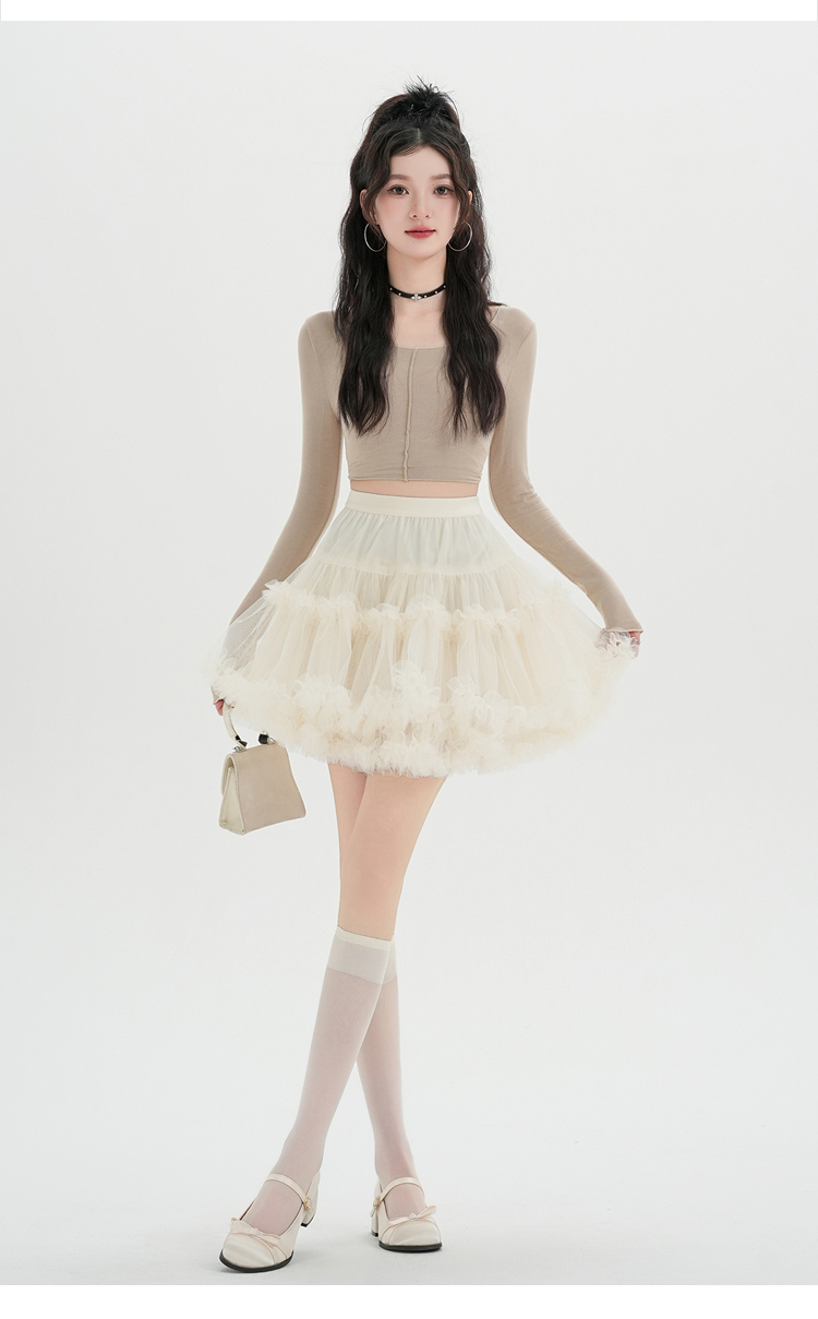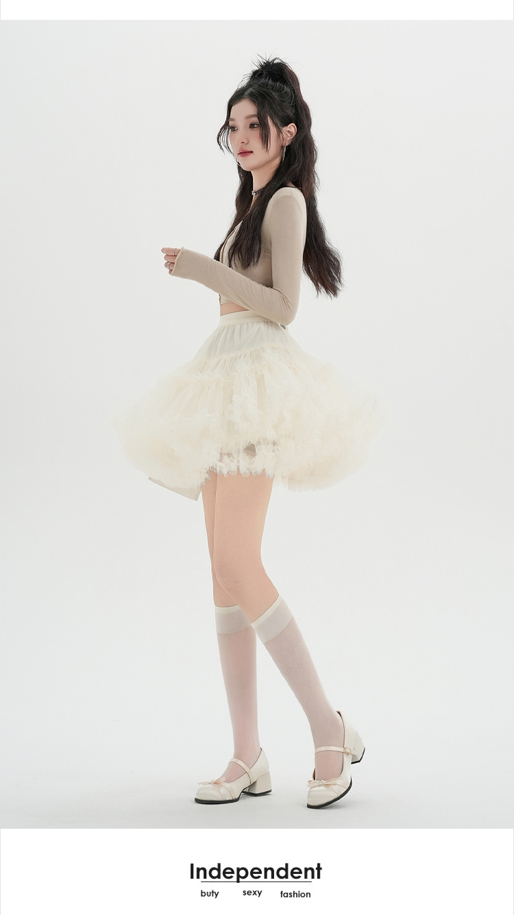 실사 2026 봄 여름 새로운 발레 바람 망사 케이크 드레스 허리밴드 퍼프 프릴 미니 스커트 A라인 스커트