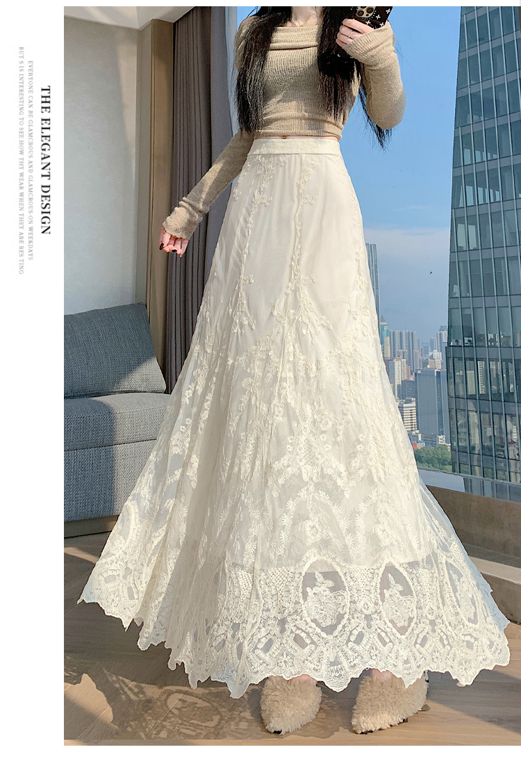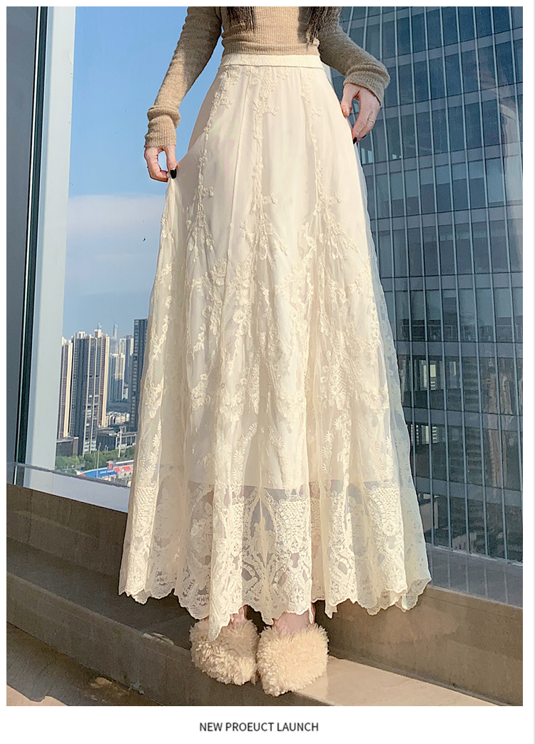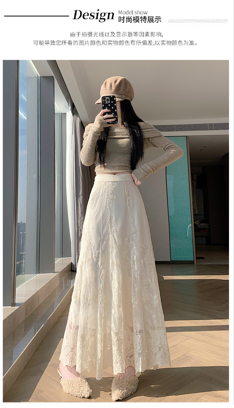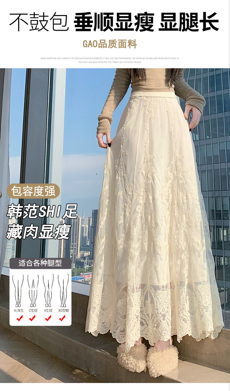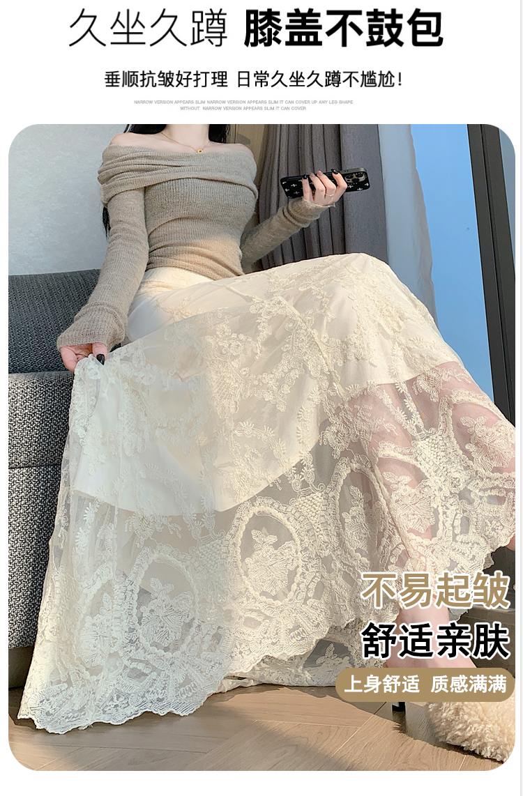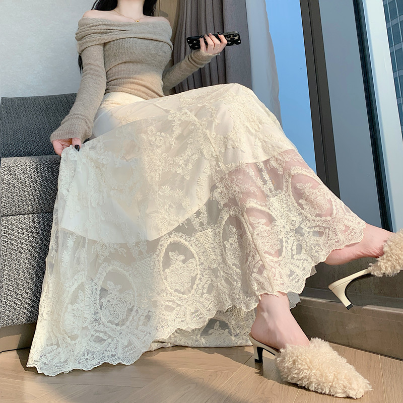 실사 가을 겨울 새로운 한국 스타일 하이웨이스트 부드러운 바람 망사 패치워크 레이스 드레스 표지 십자가 품격 빅 플레어 스커트
