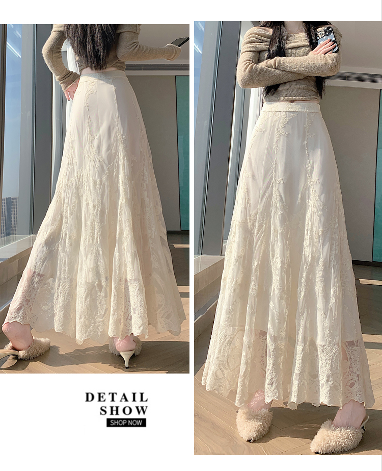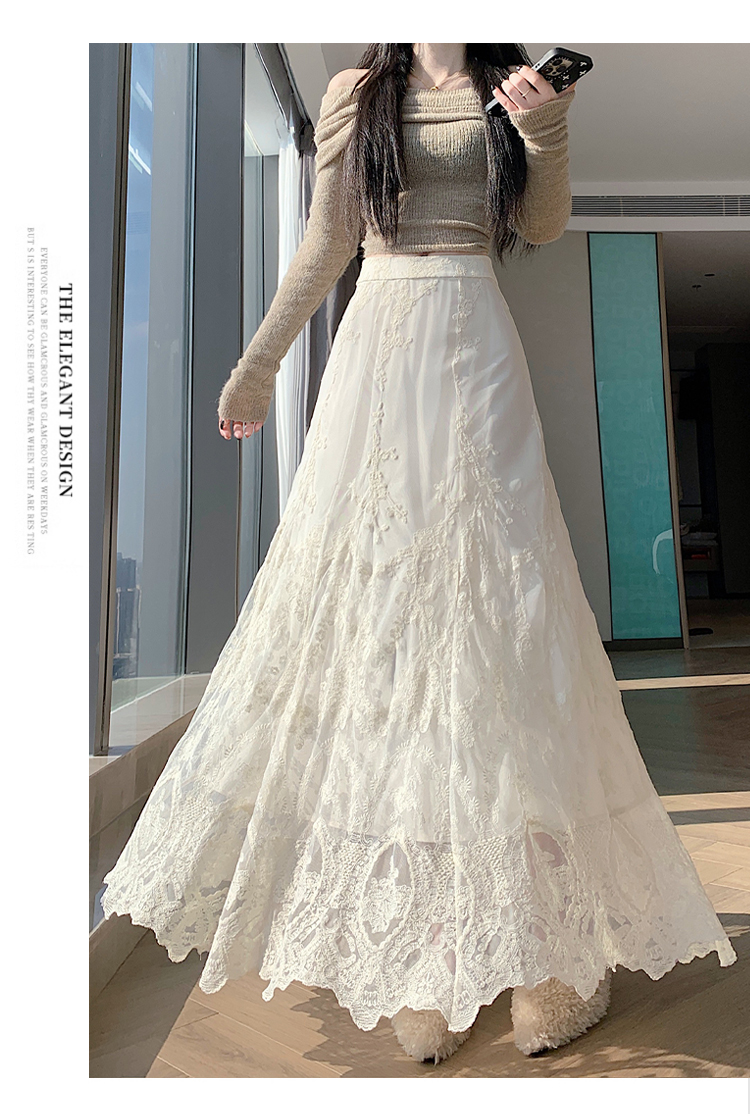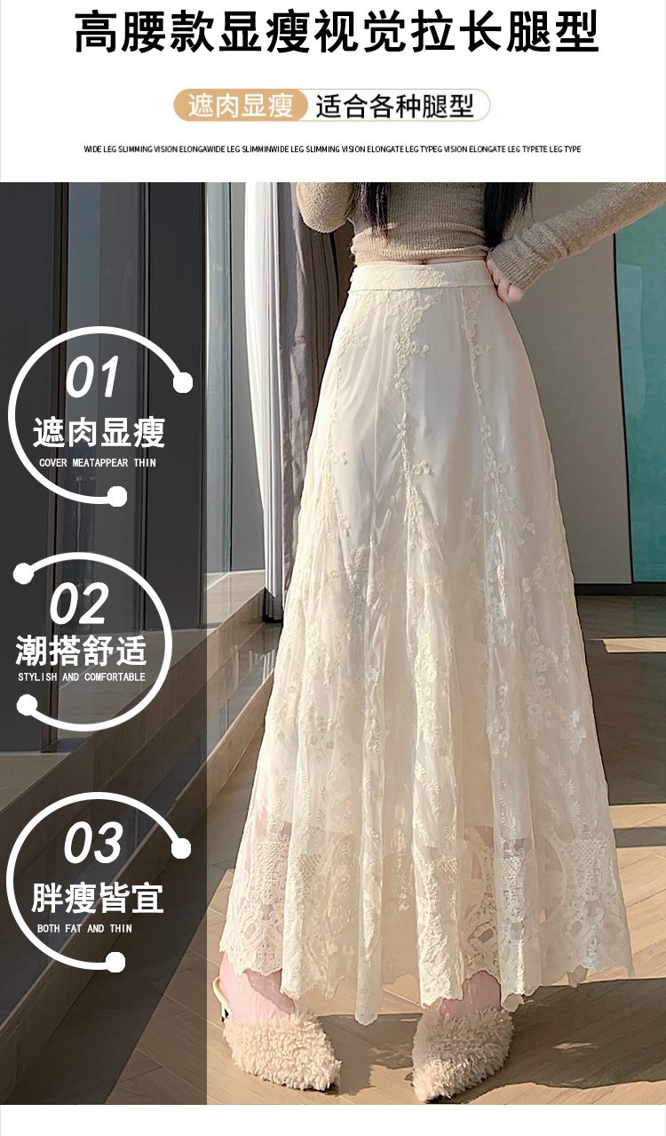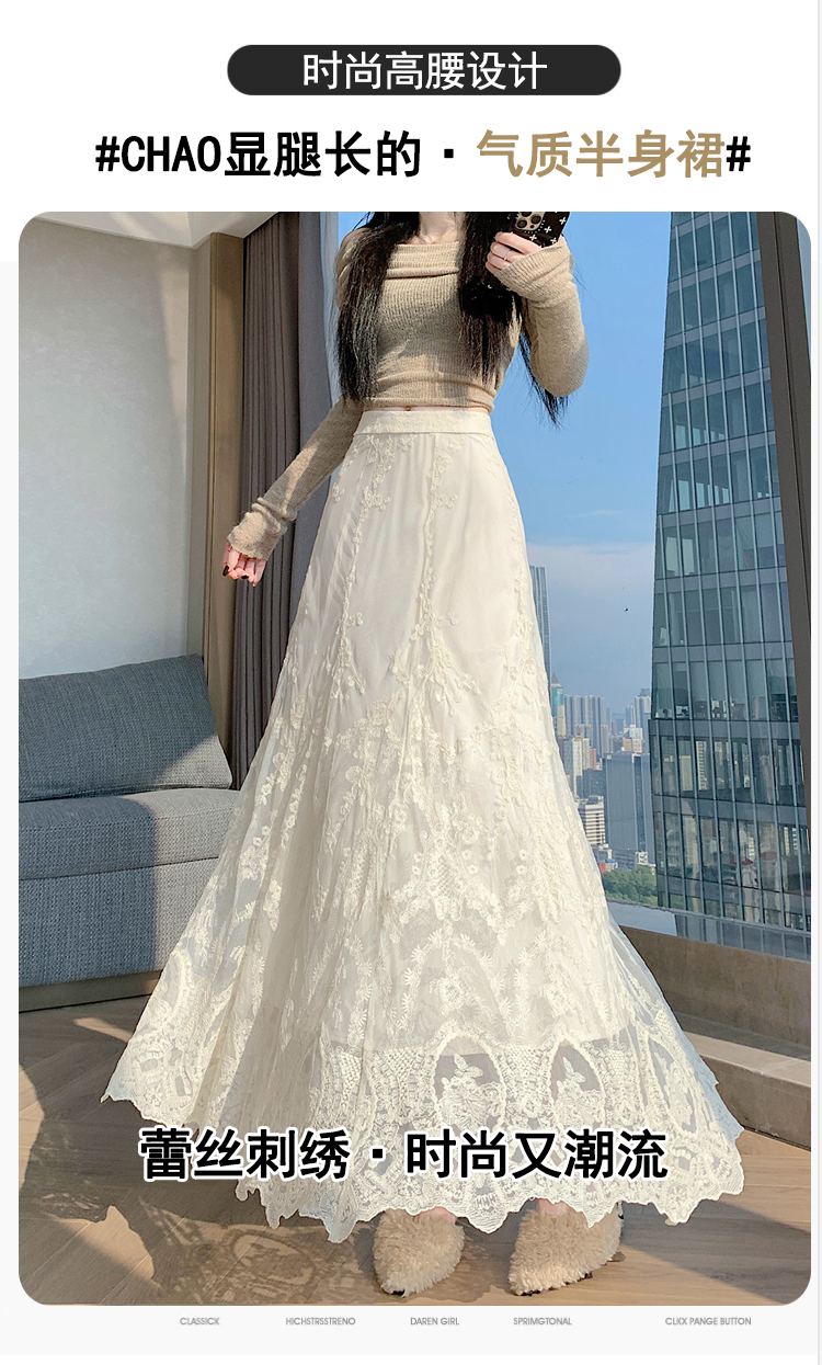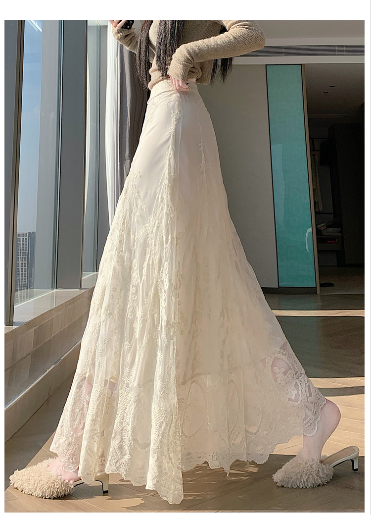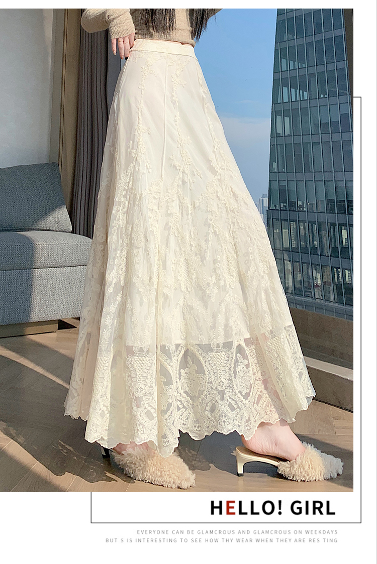 실사 가을 겨울 새로운 한국 스타일 하이웨이스트 부드러운 바람 망사 패치워크 레이스 드레스 표지 십자가 품격 빅 플레어 스커트