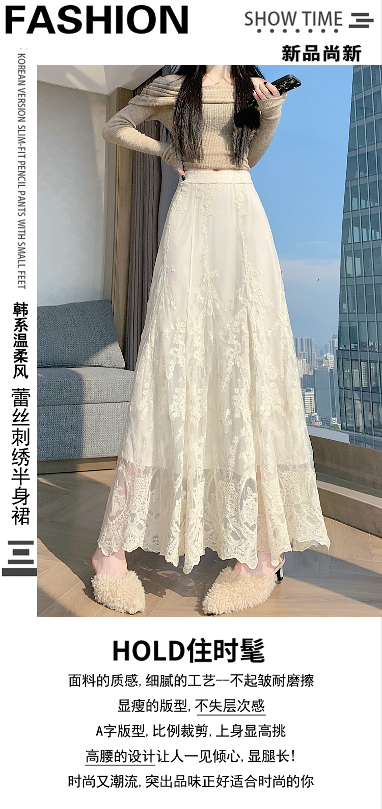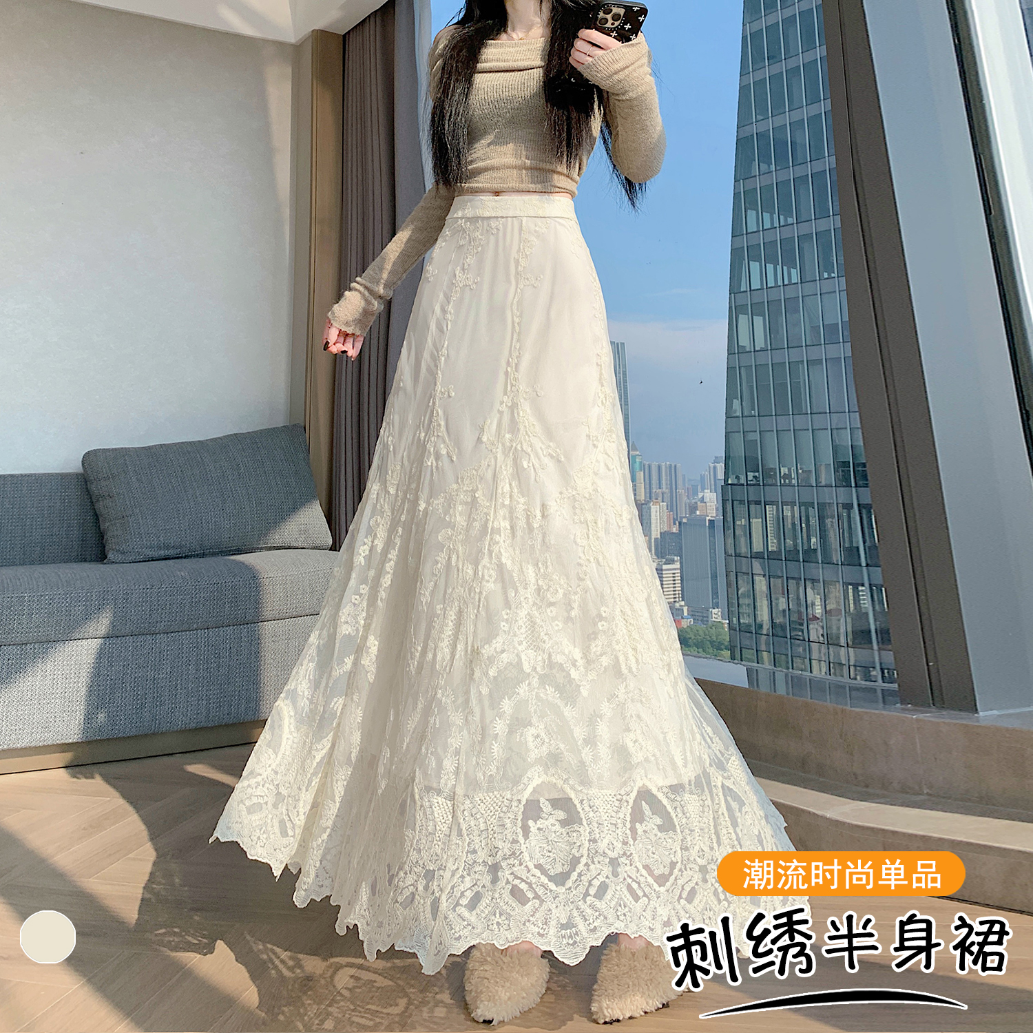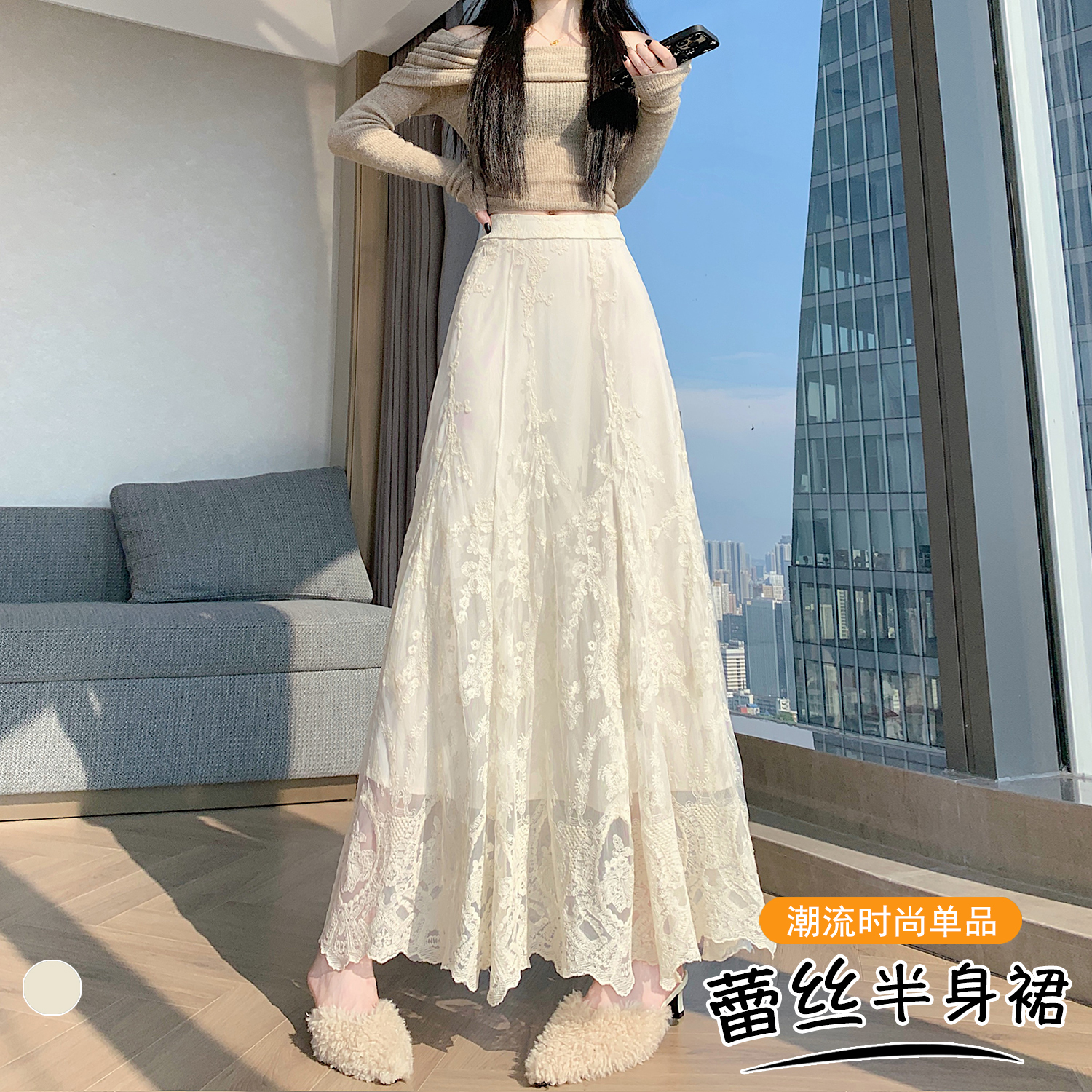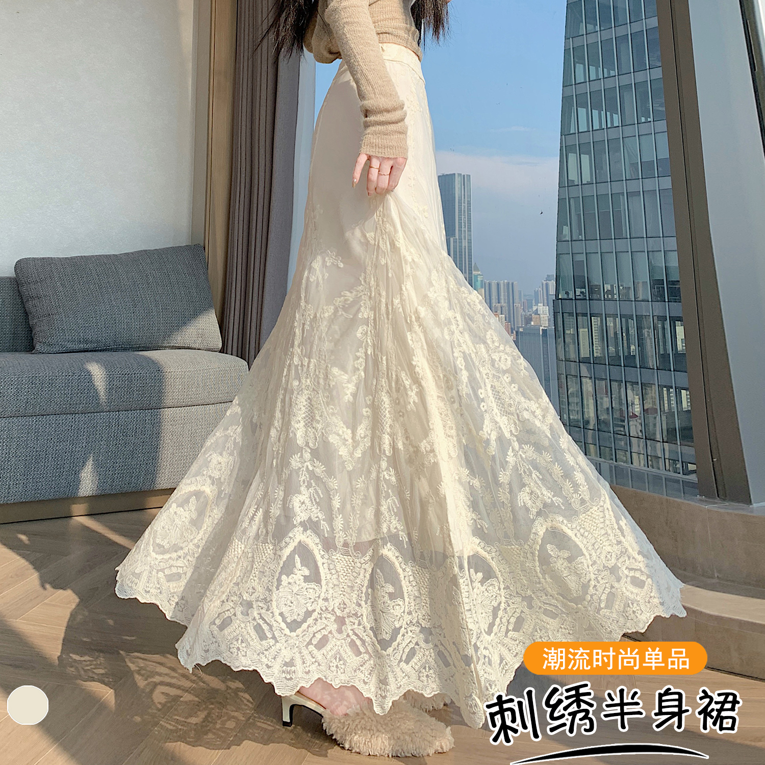 실사 가을 겨울 새로운 한국 스타일 하이웨이스트 부드러운 바람 망사 패치워크 레이스 드레스 표지 십자가 품격 빅 플레어 스커트