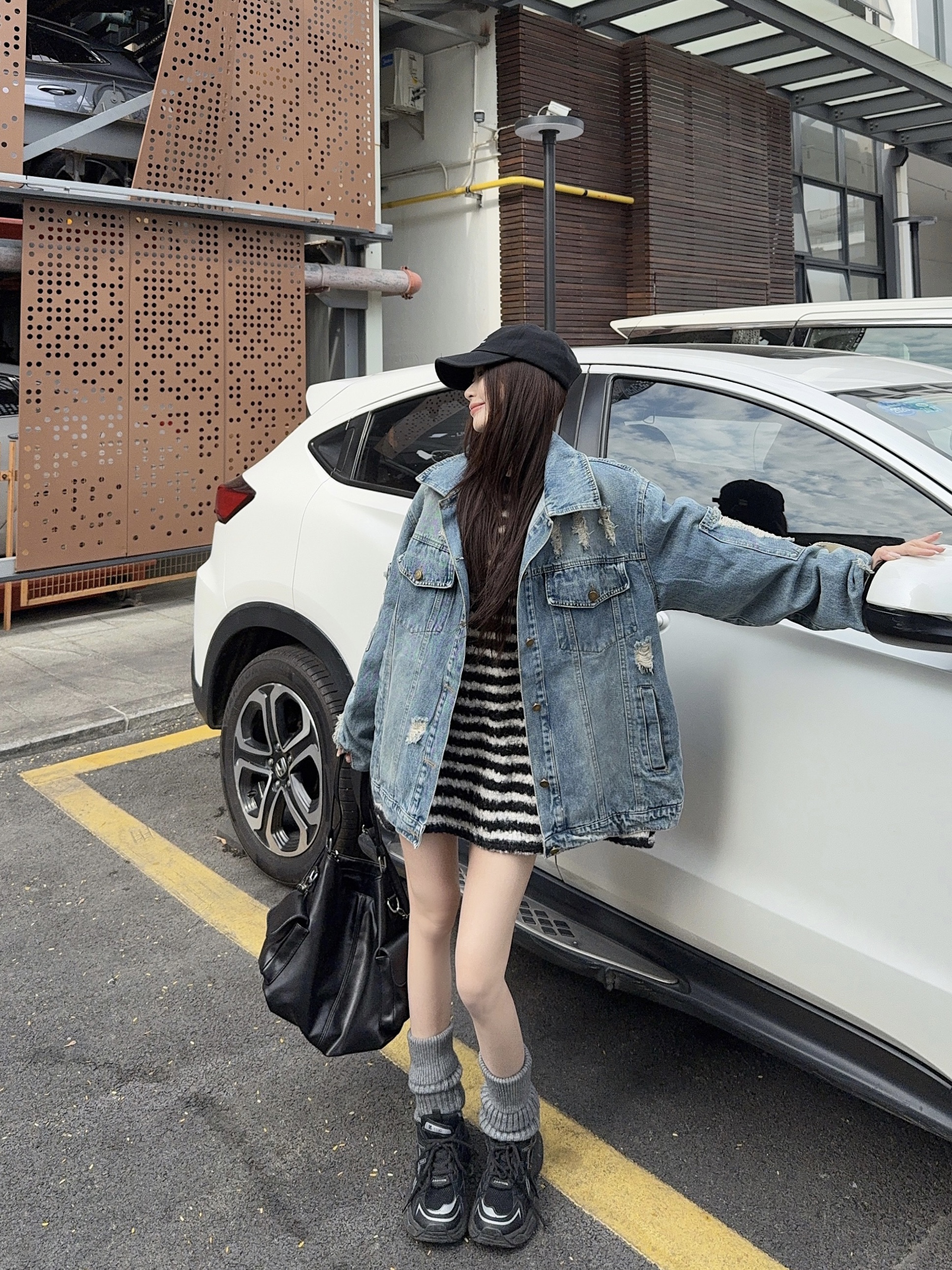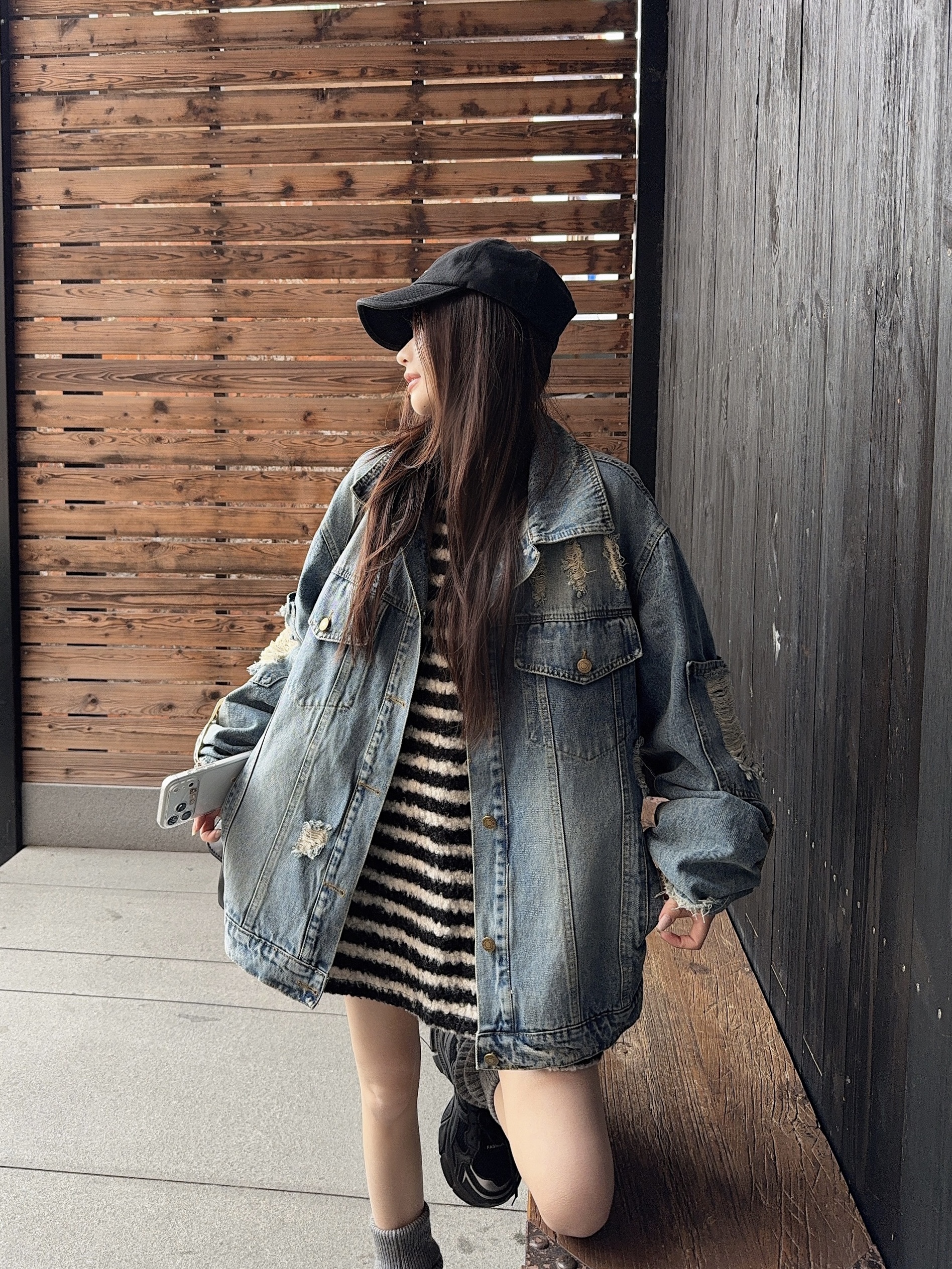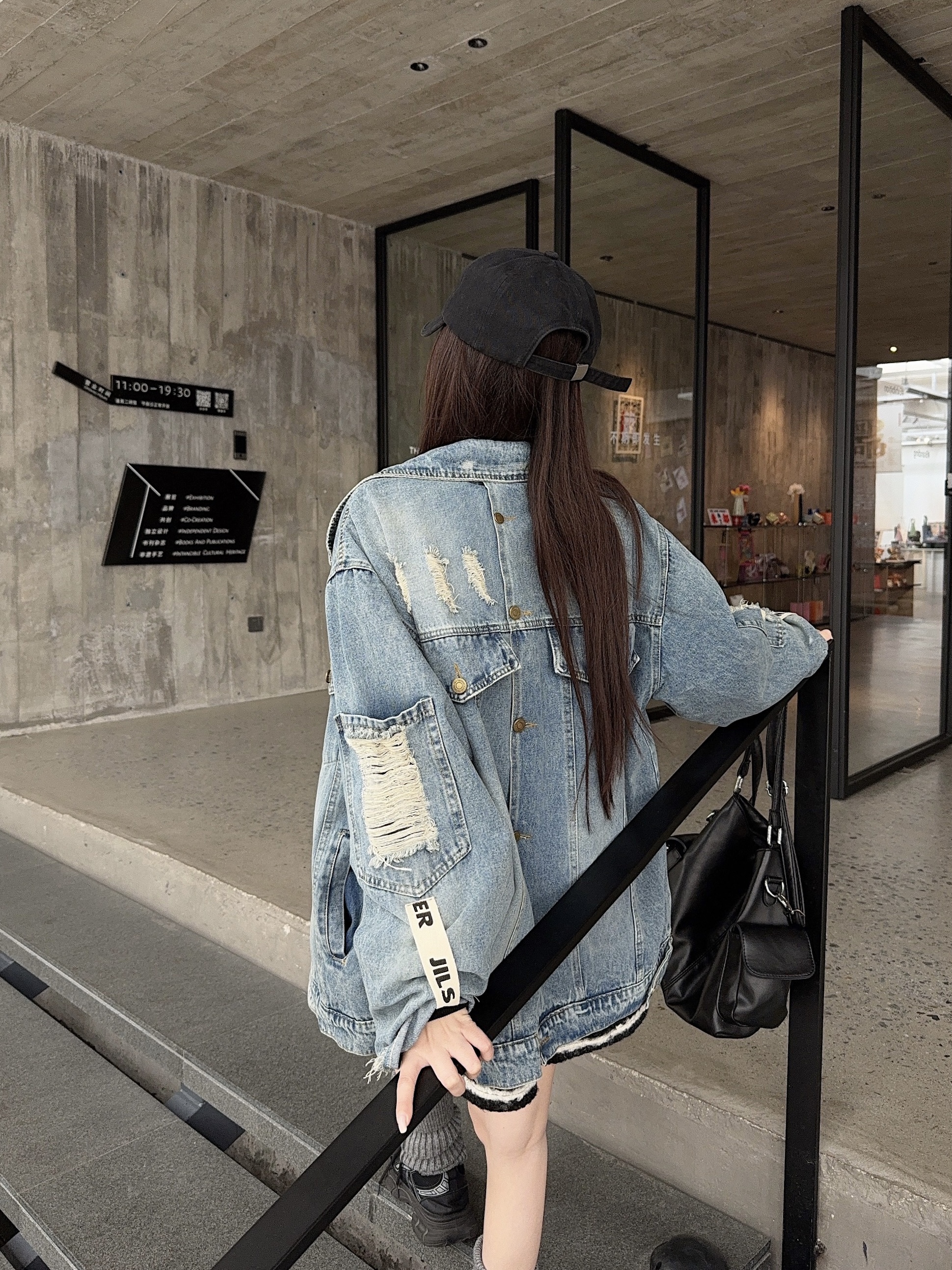 실사 정가 항구 바람 레트로 찢어진 부분 워싱 긴팔 데님 여성 코트 루즈핏 캐주얼 다용도 재킷 맨위