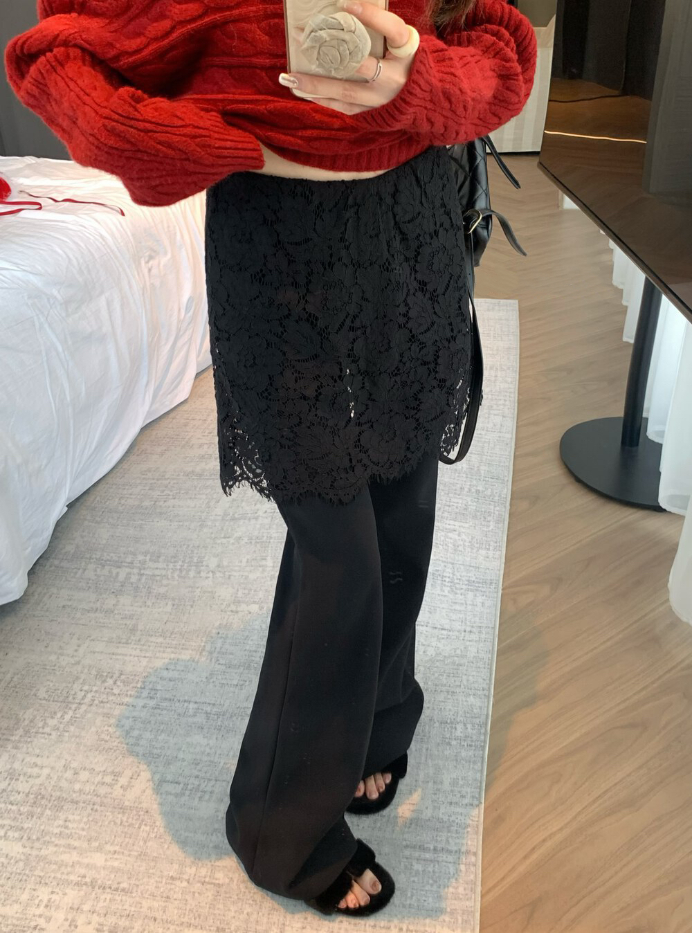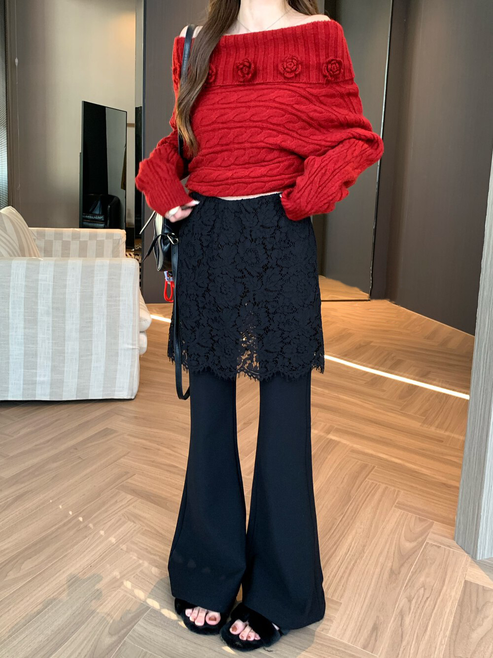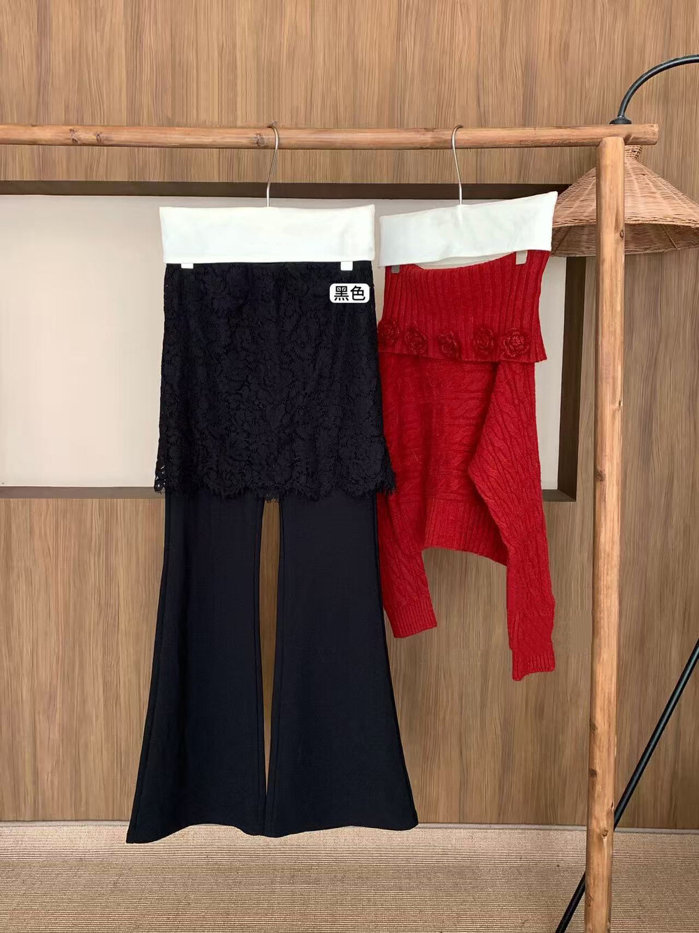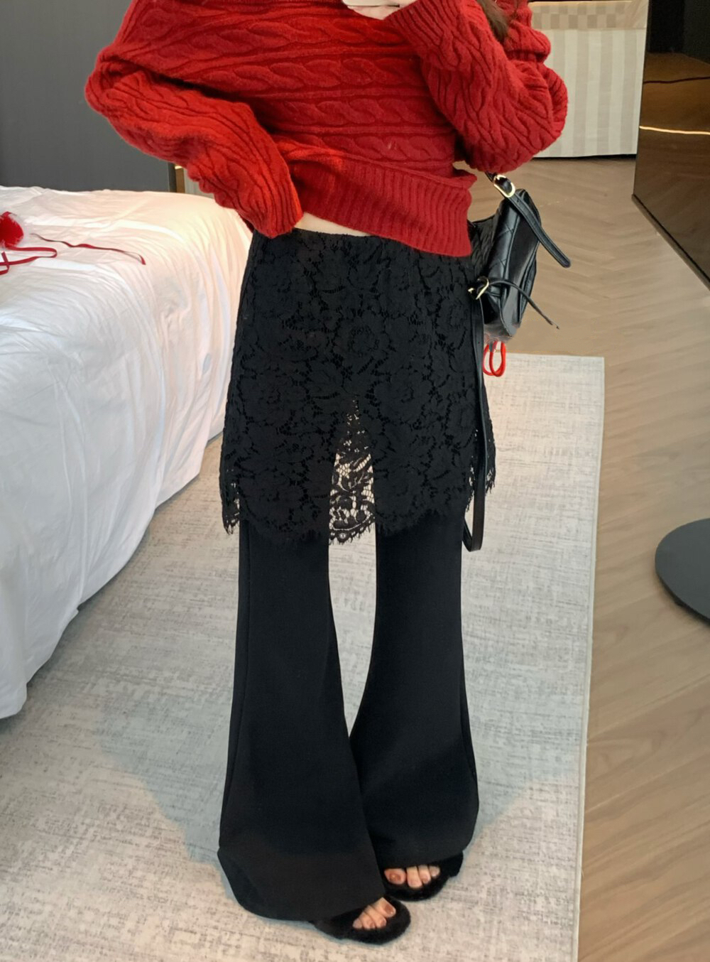 물리적 인지도 있음 업데이트 2026 봄 패션 페이크 레이어드 레이스 방귀 커튼 부츠컷 하이웨이스트 캐주얼 바지 여성 8752