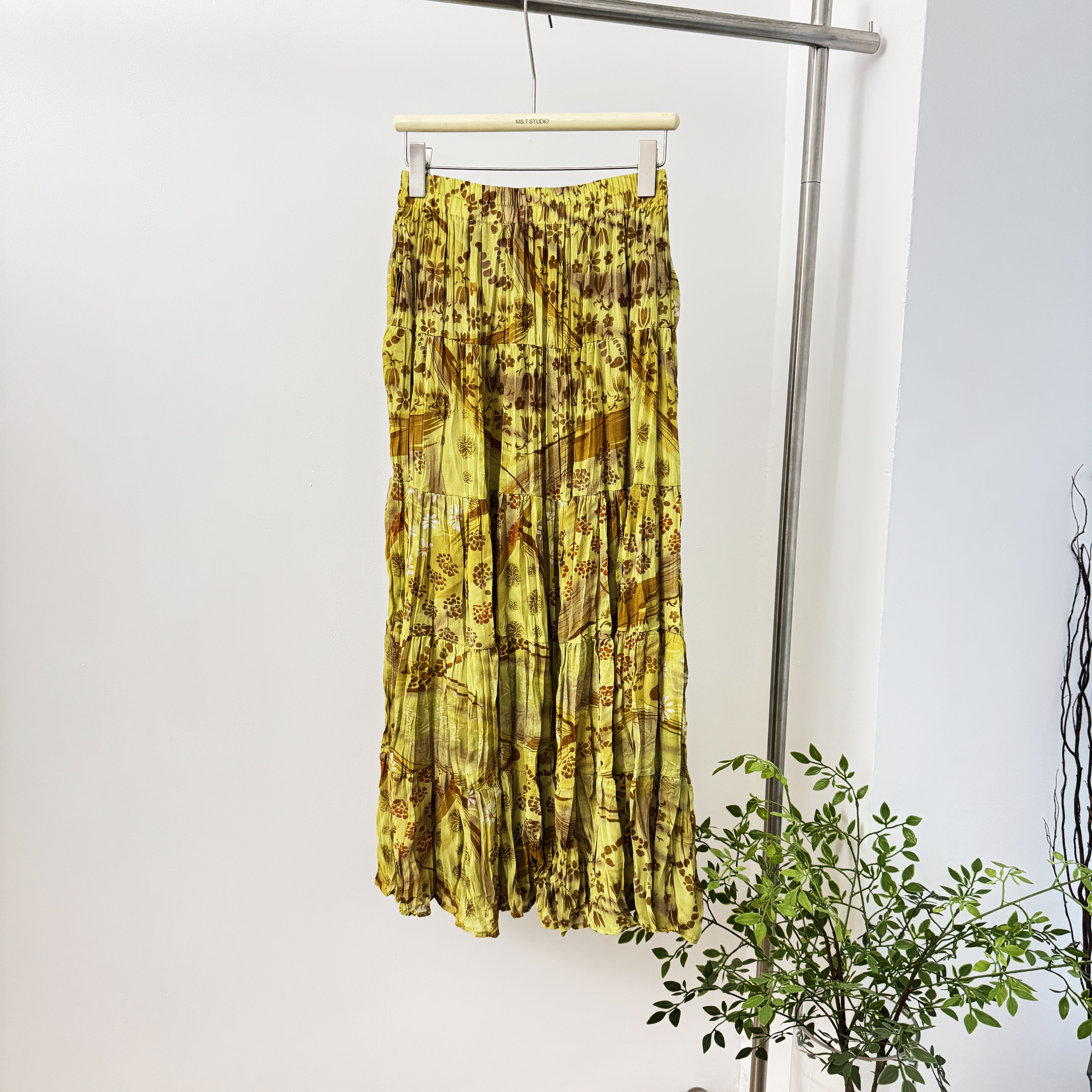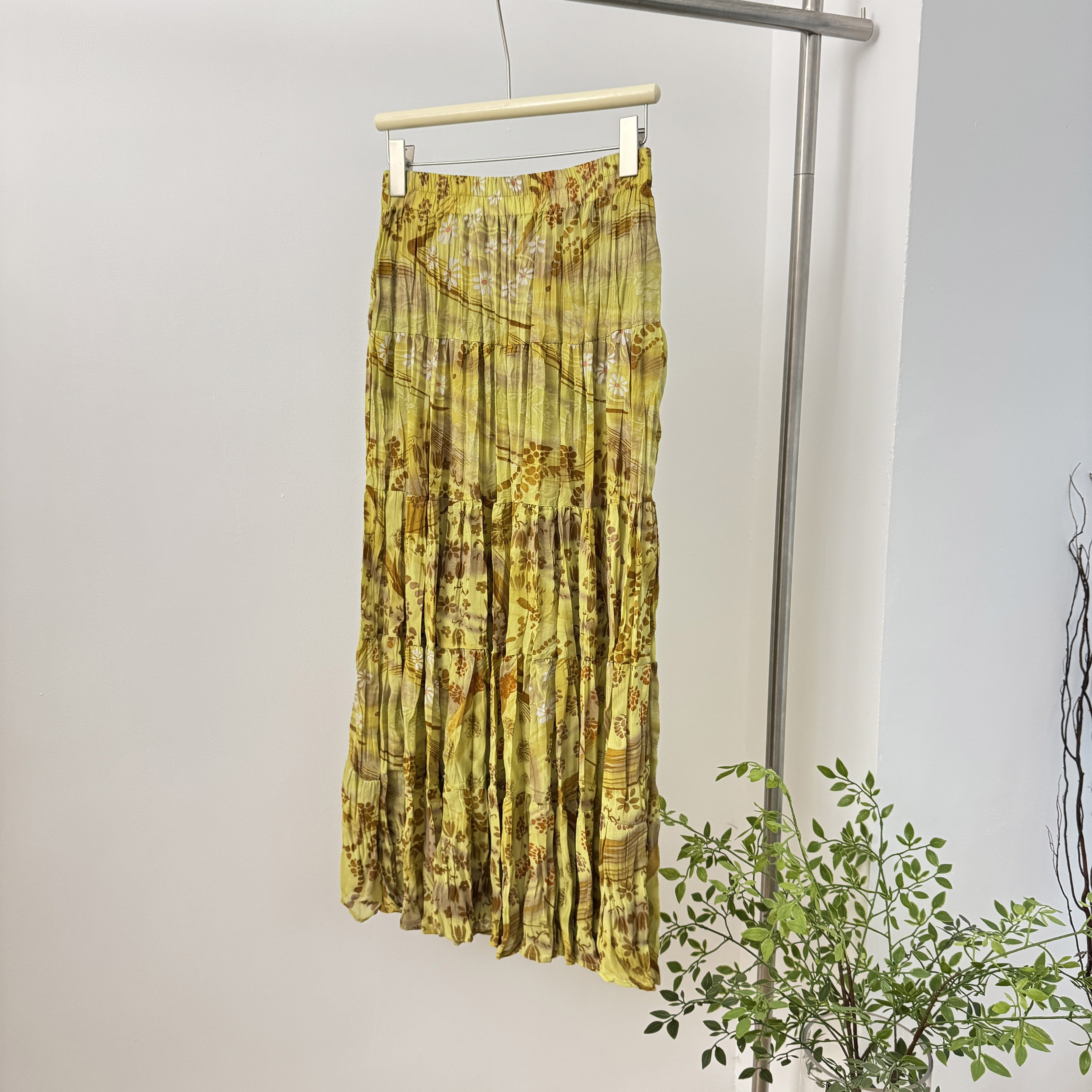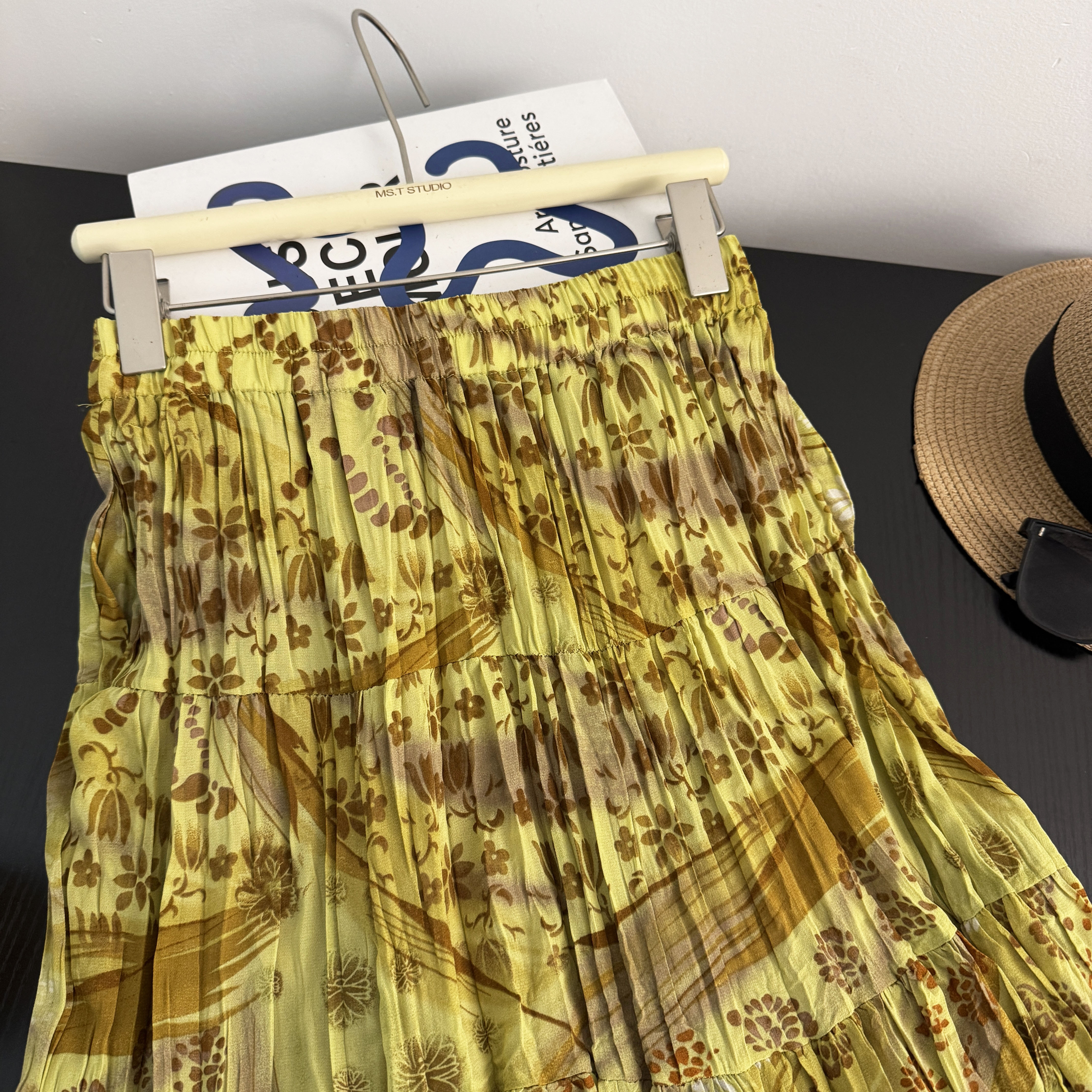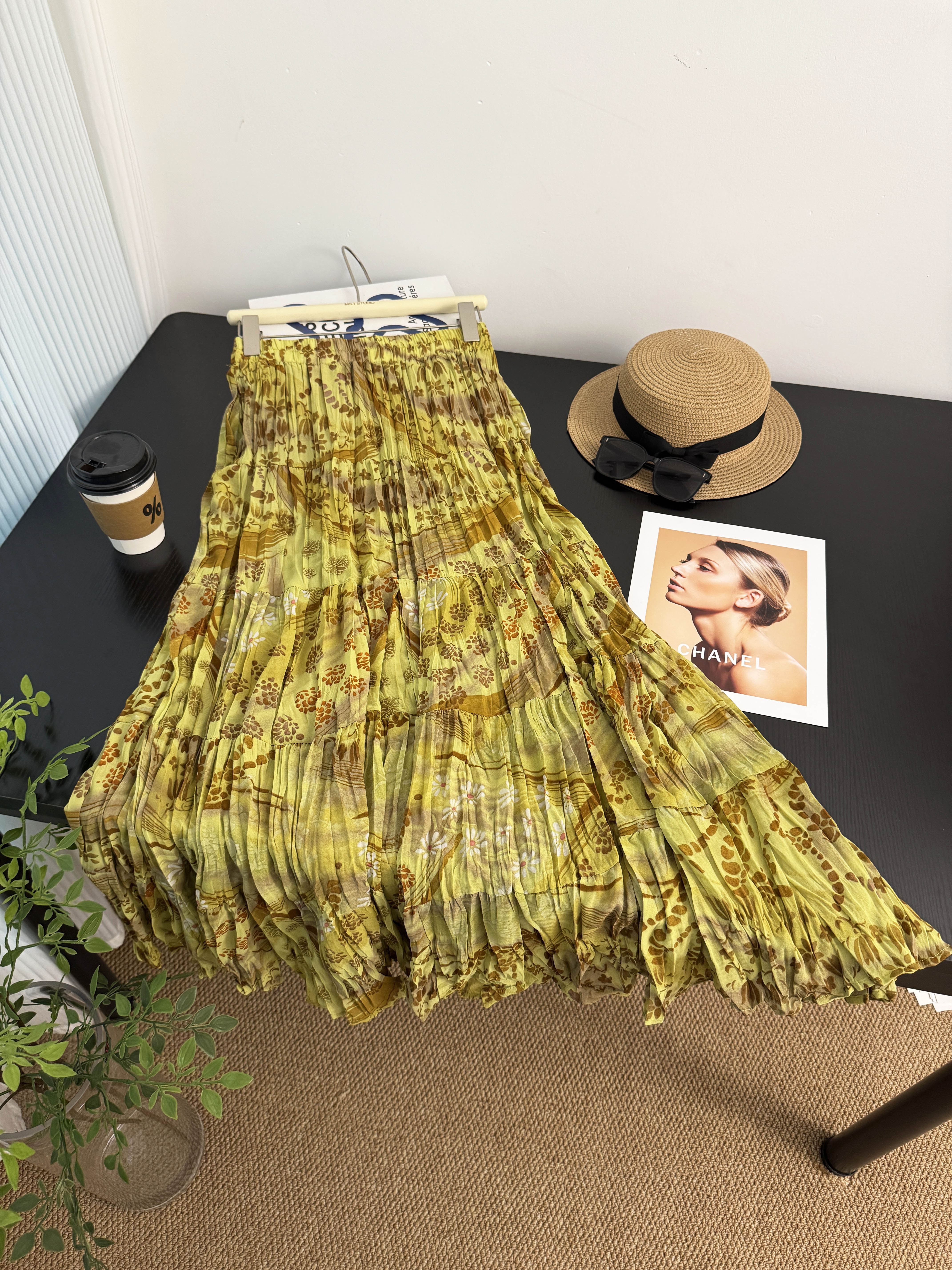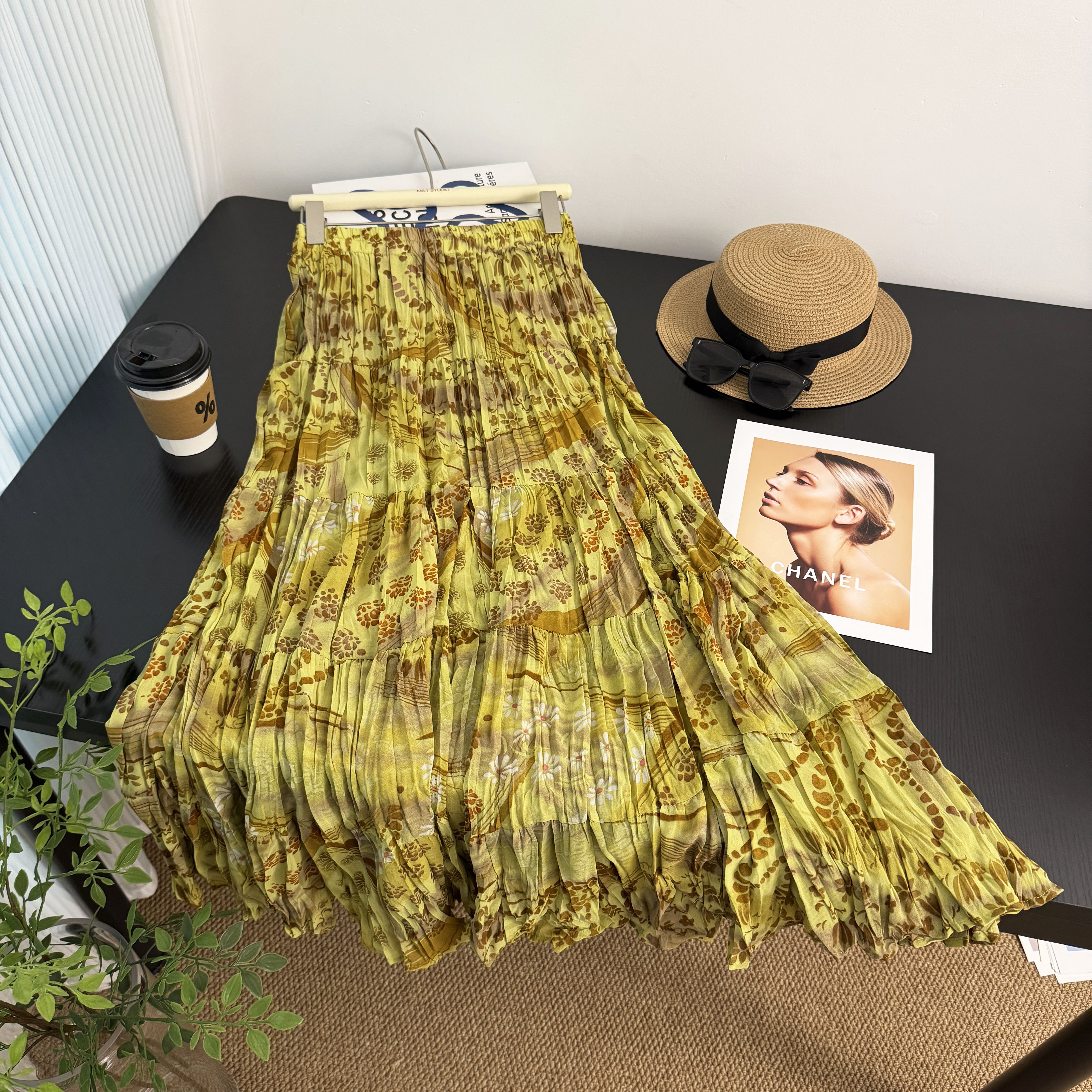 휴가 바람 프린트 쉬폰 주름 반신 스커트 여성 허리밴드 불규칙 빅 플레어 스커트 슬림해 보이는 연령 감소 꽃무늬 롱 스커트
