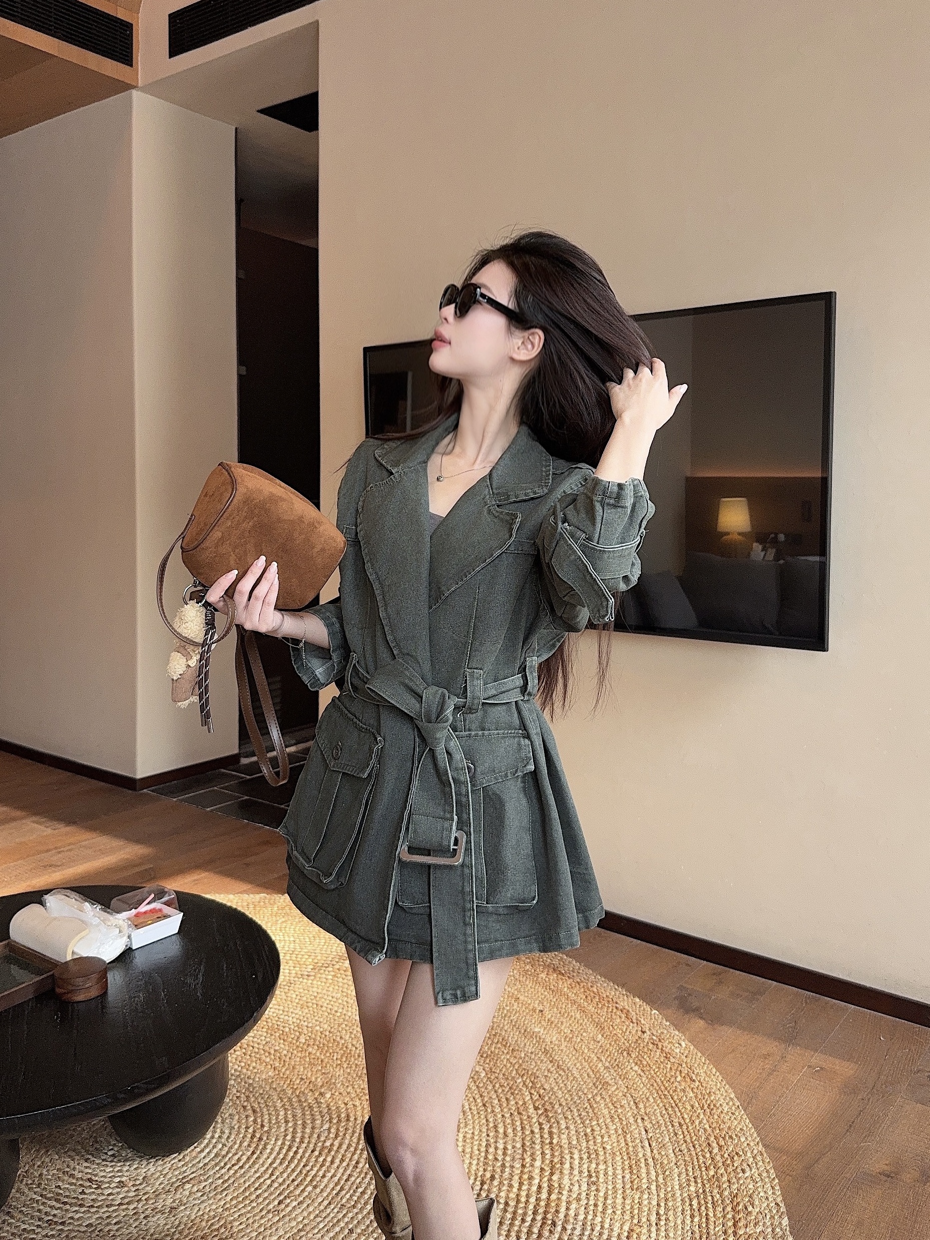 실사 정가 레트로 데님 드레스 롱 코트 홍콩 느낌 POLO 칼라 허리 수축 슬림해 보이는 봄 가을 품격 길다 치마