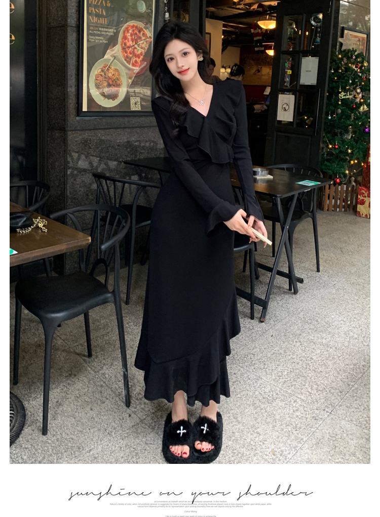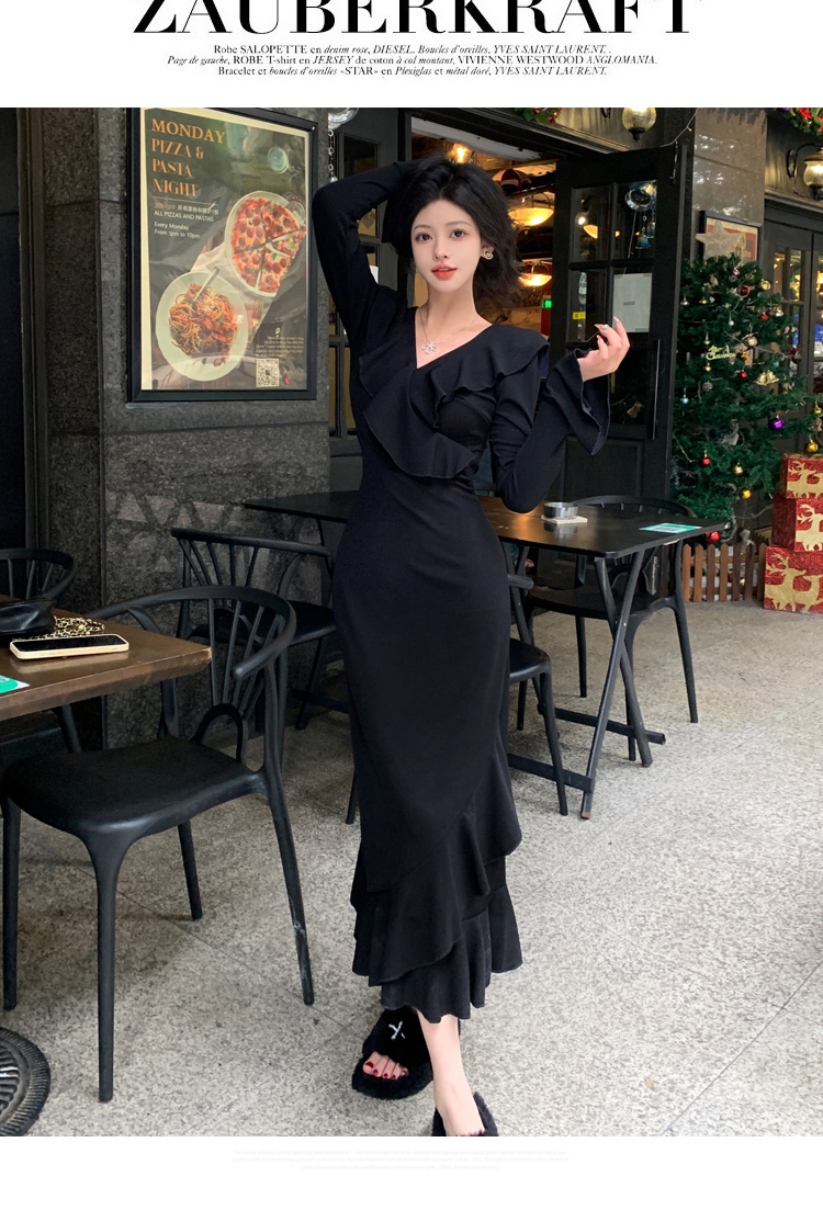 실사 빅 사이즈 봄 드레스 섹션 그는 벤 바람 검정색 V넥 드레스 고급 센스 순수한 욕망 바람 허리 수축 슬림해 보이는 인어 꼬리 스커트