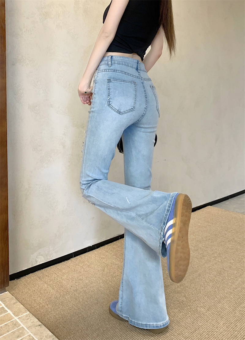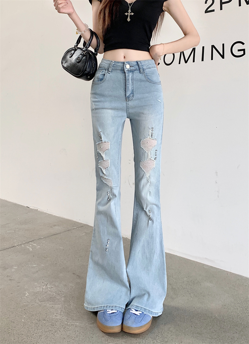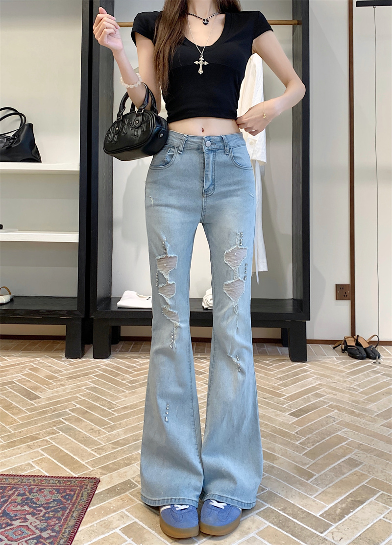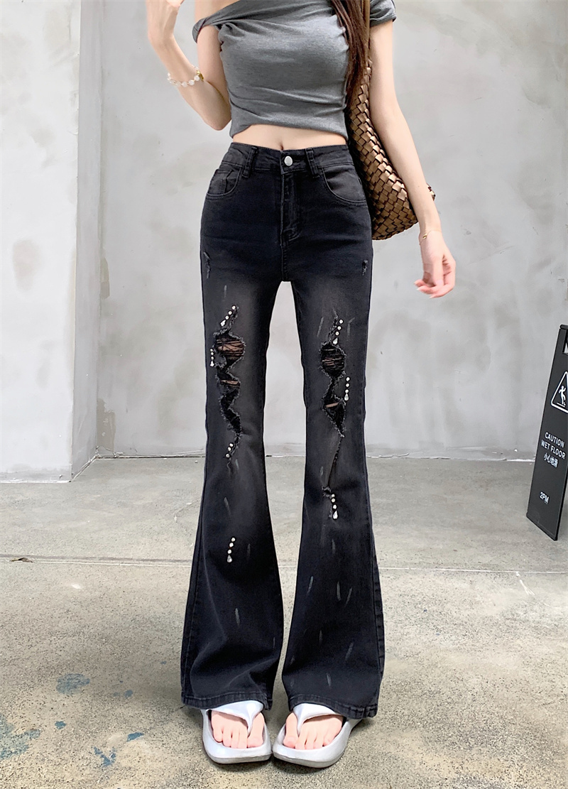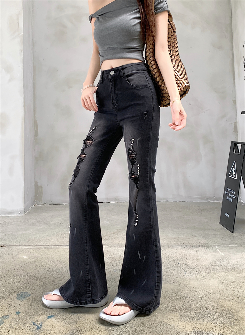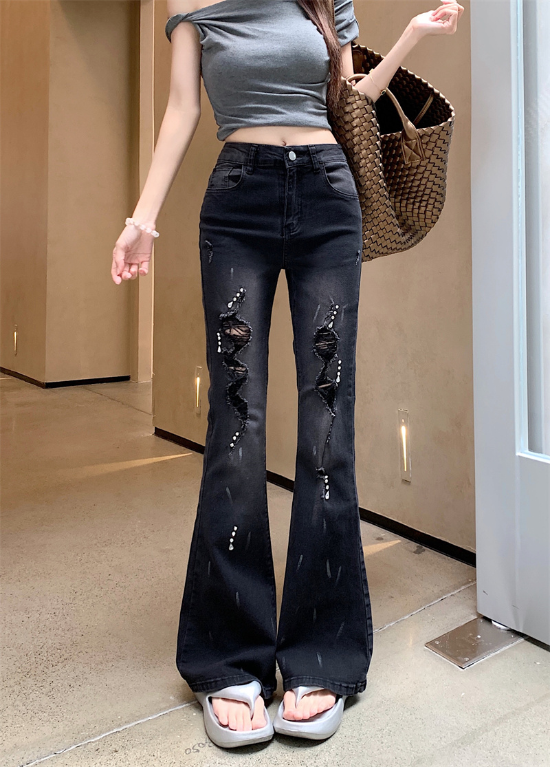 실사 정가 검정색 하이웨이스트 부츠컷 청바지 가을 폭발 핫픽스 찢어진 부분 바지 몸매 가꾸기 슬림해 보이는 나팔 바지