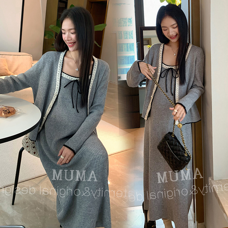 신제품 임산부 느긋한 캐주얼 세트 가을 겨울 새로운 니트 스웨터 스웨터 방귀 커튼 바지 투피스 세트 착용 가져 가라.
