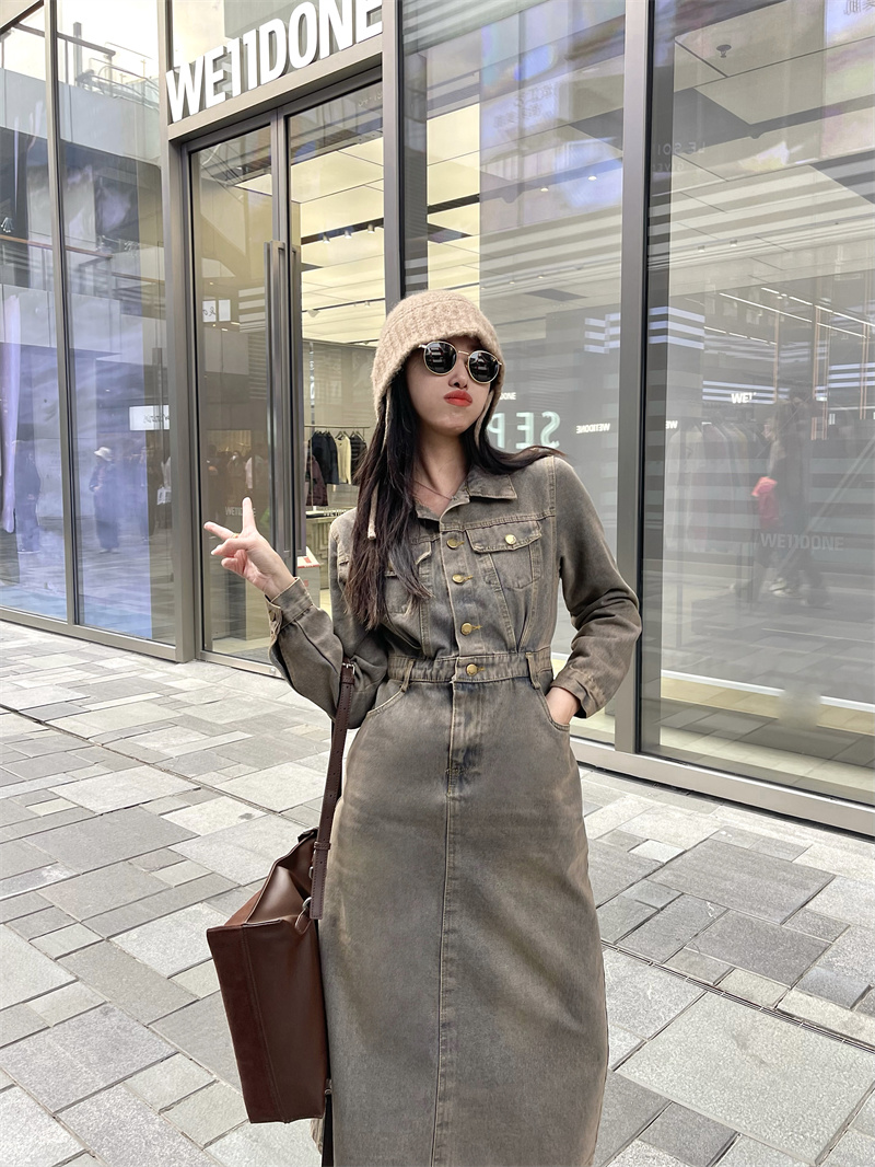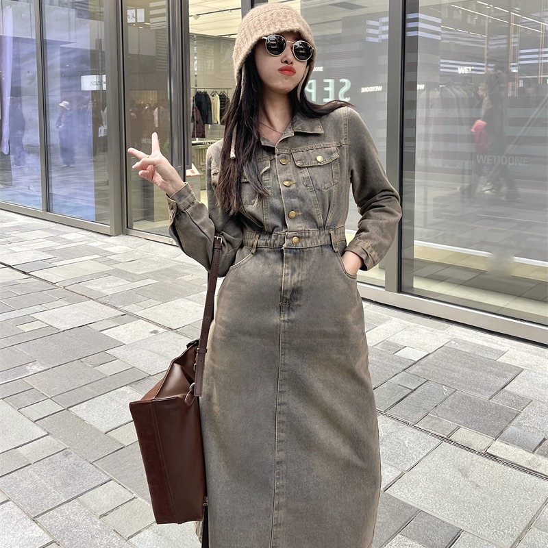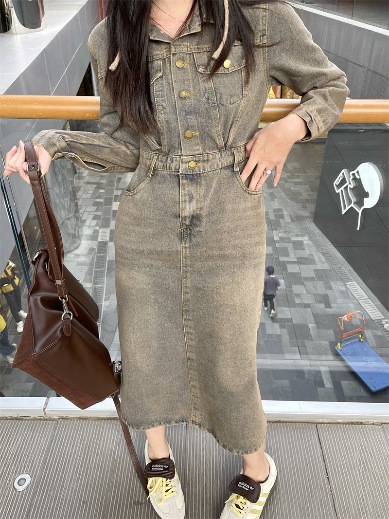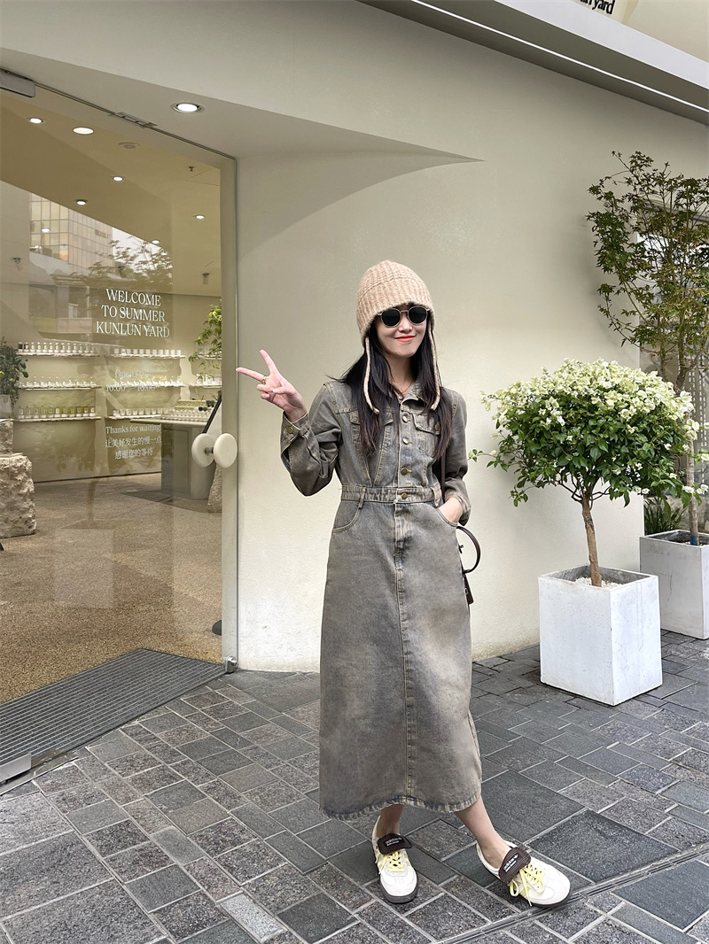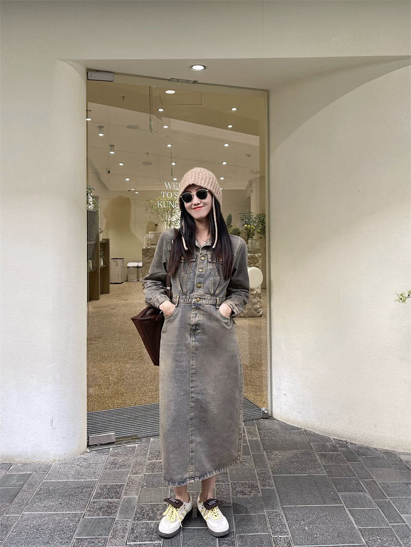 실사 정가 레트로 데님 드레스 롱 코트 홍콩 느낌 POLO 칼라 허리 수축 슬림해 보이는 봄 가을 품격 길다 치마
