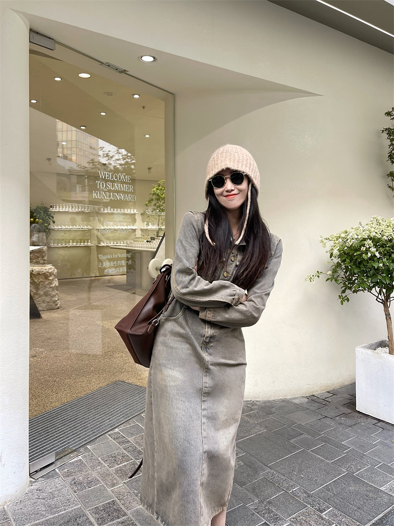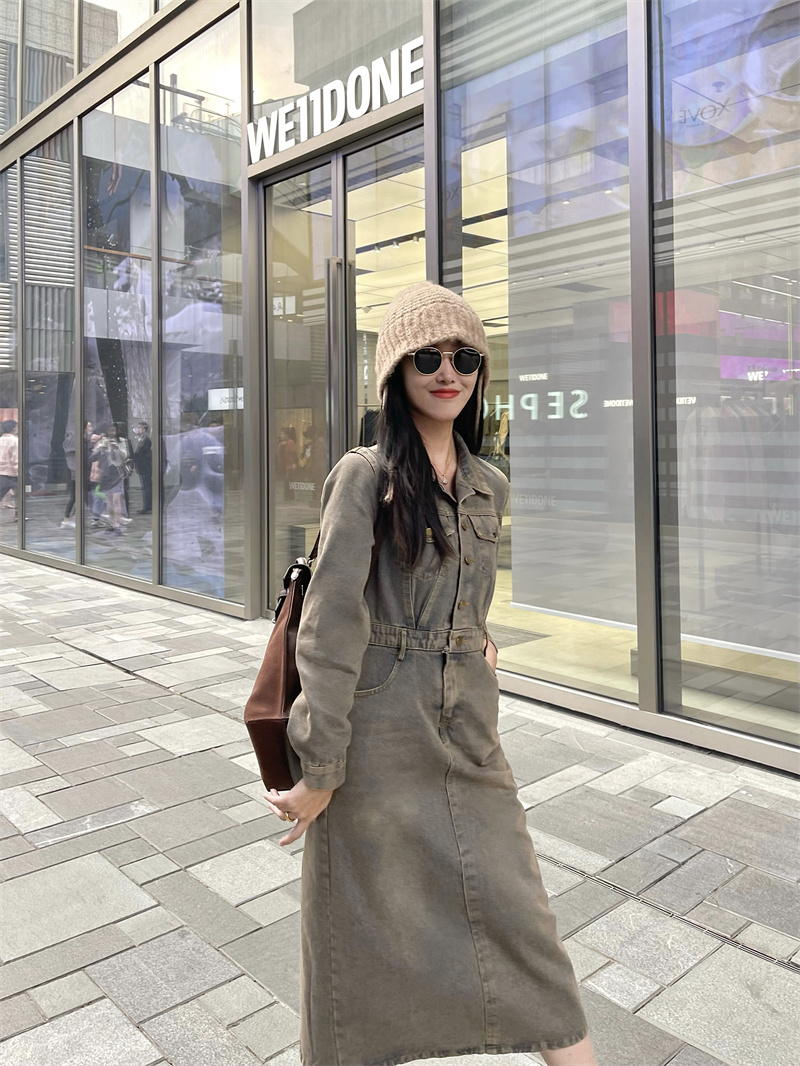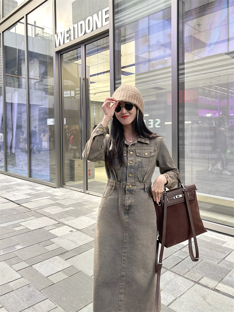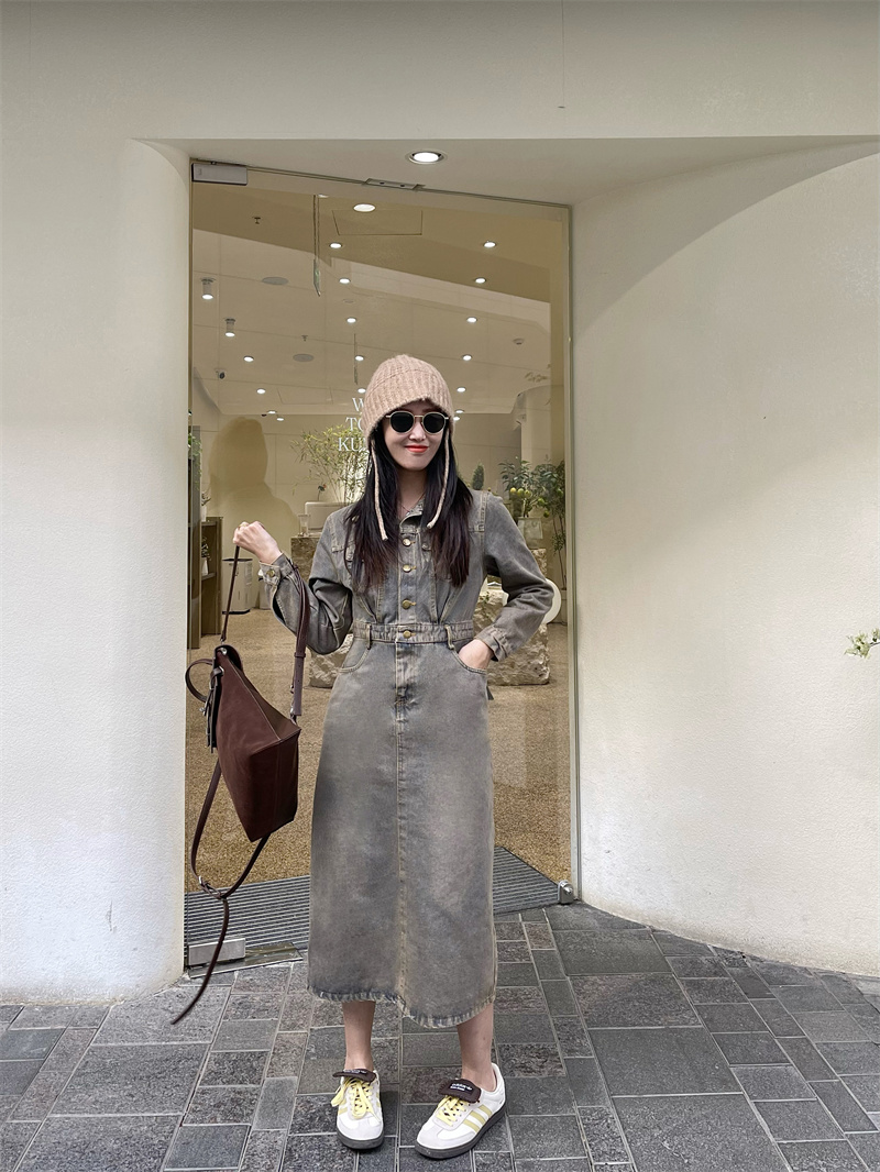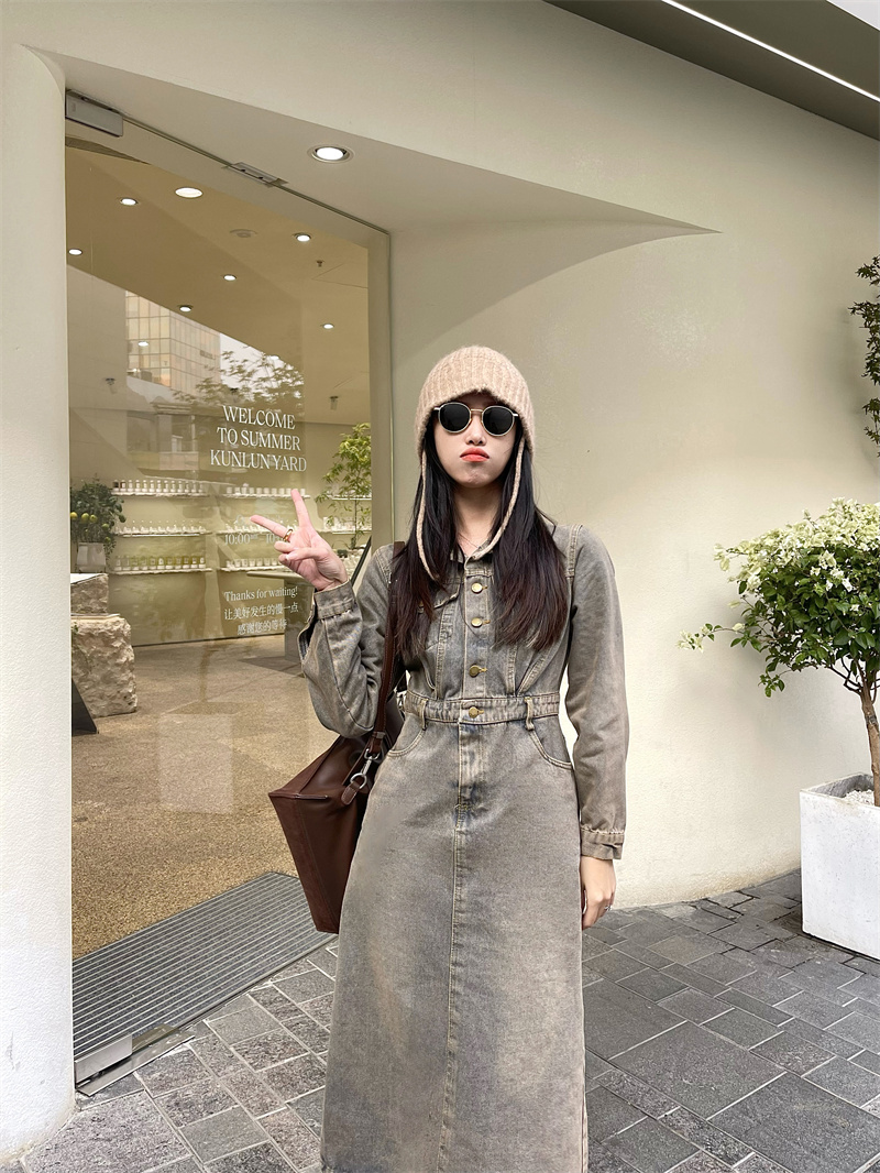실사 정가 레트로 데님 드레스 롱 코트 홍콩 느낌 POLO 칼라 허리 수축 슬림해 보이는 봄 가을 품격 길다 치마