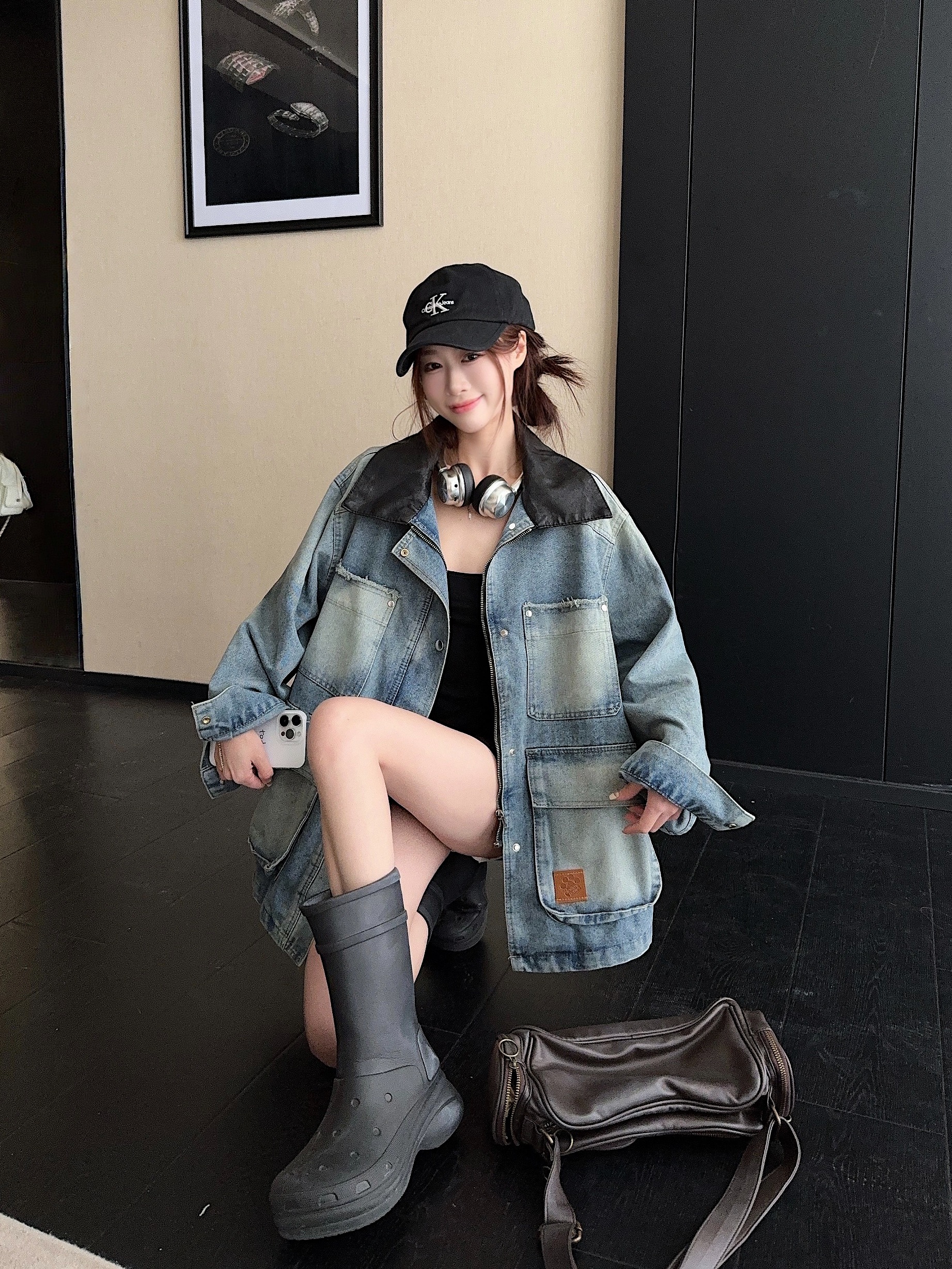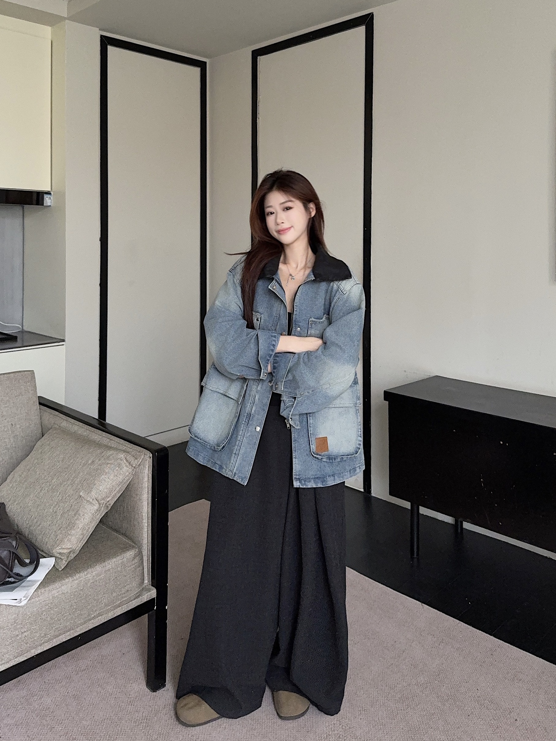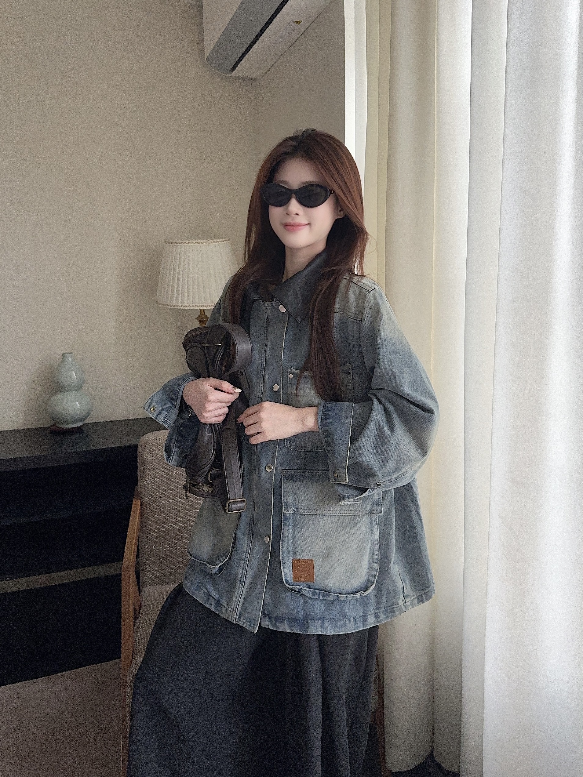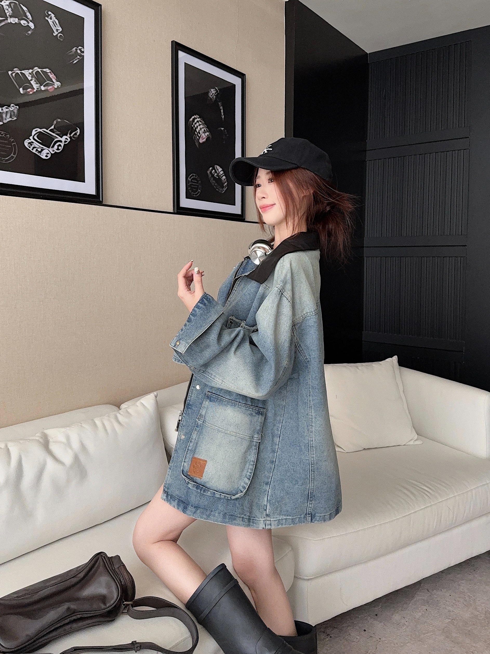 실사 정가 레트로 데님 드레스 롱 코트 홍콩 느낌 POLO 칼라 허리 수축 슬림해 보이는 봄 가을 품격 길다 치마