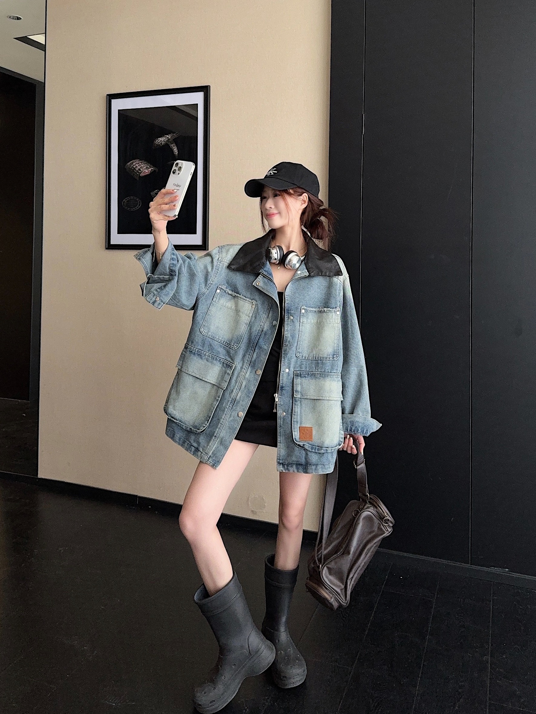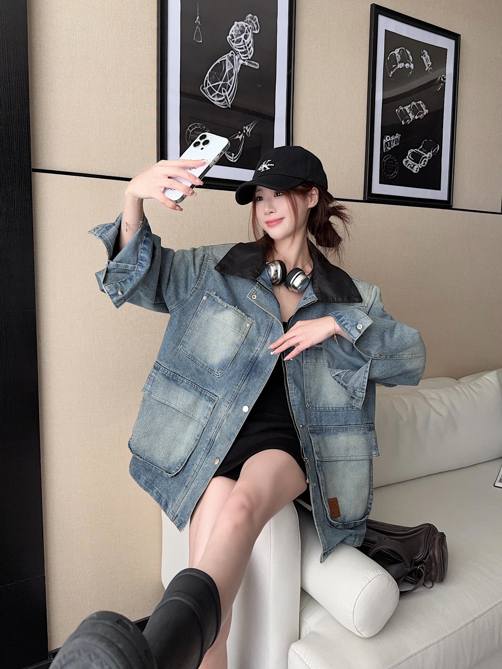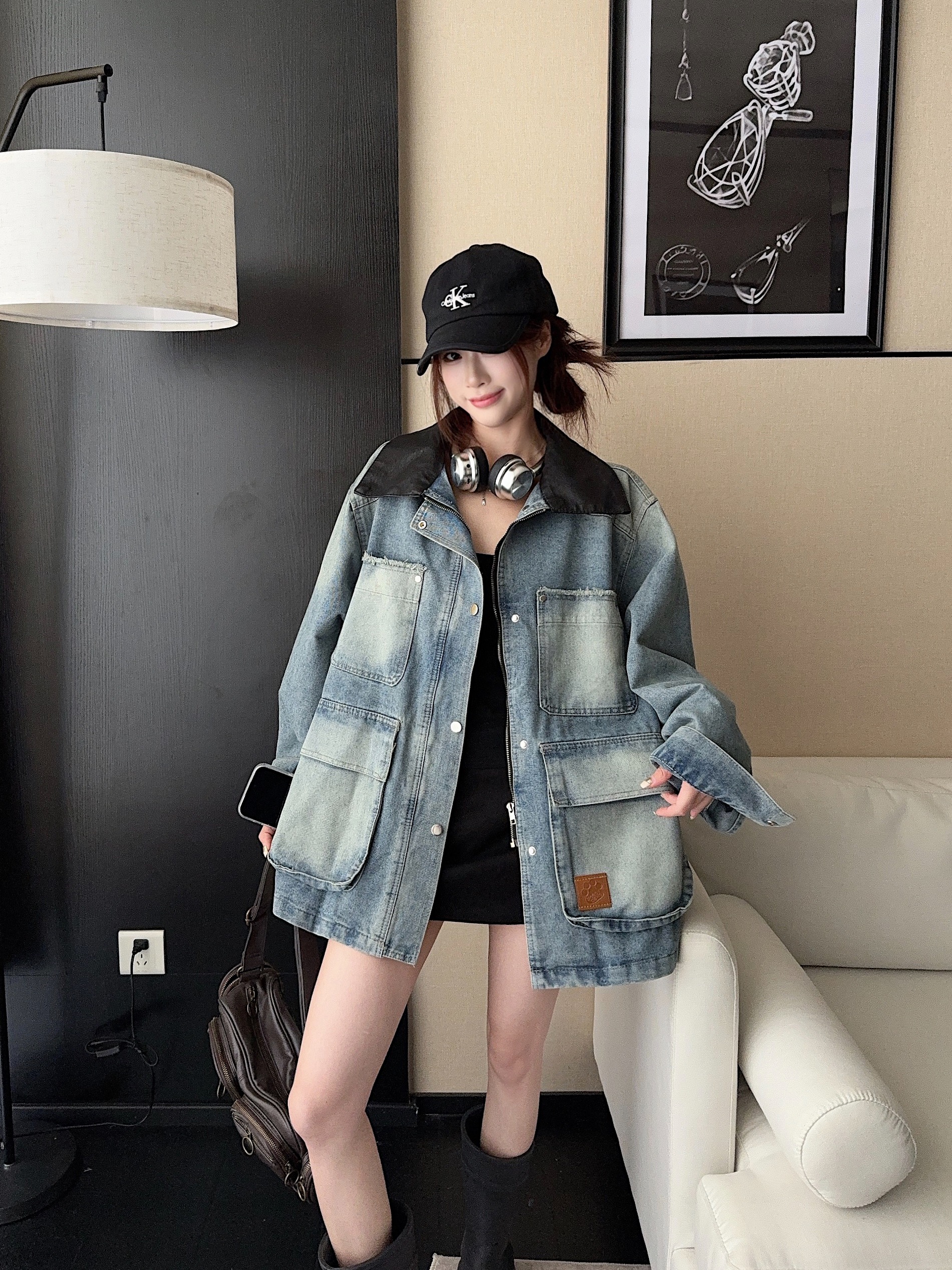 실사 정가 튀김 거리 핫걸 레트로 워시 물 마 오래된 작은 대중 다용도 트렌디 차가운 어깨 데님 쇼트 스타일 재킷