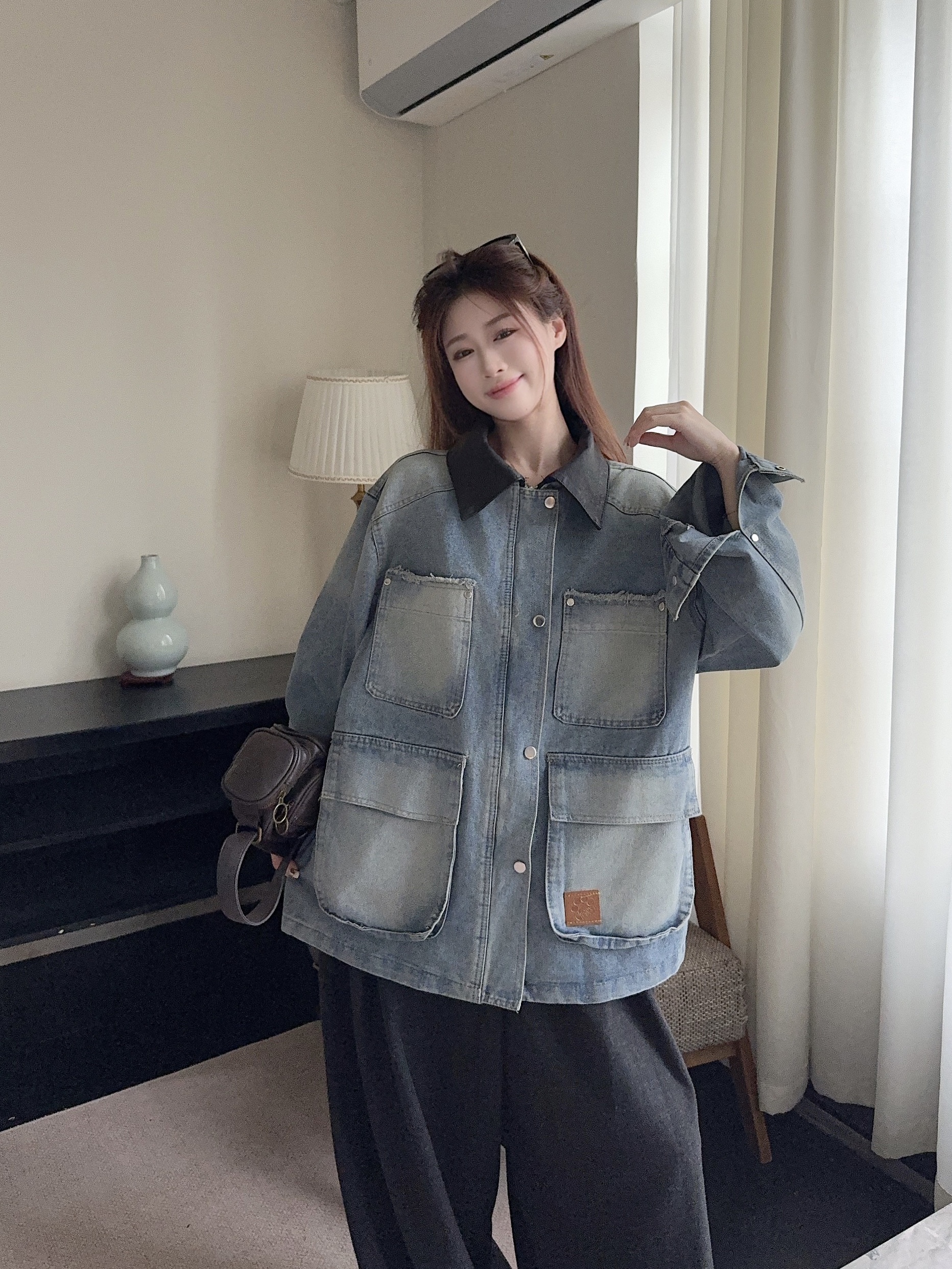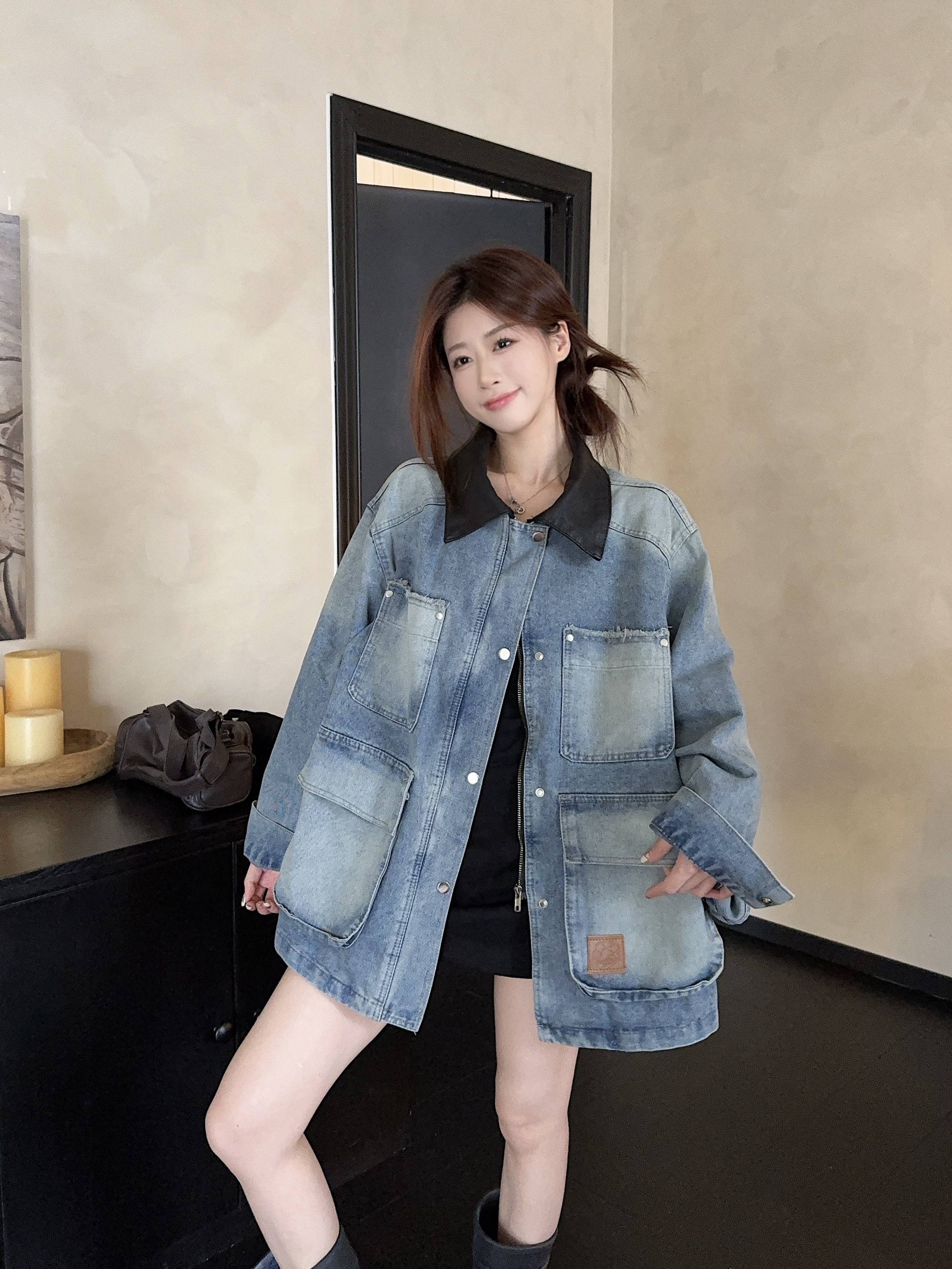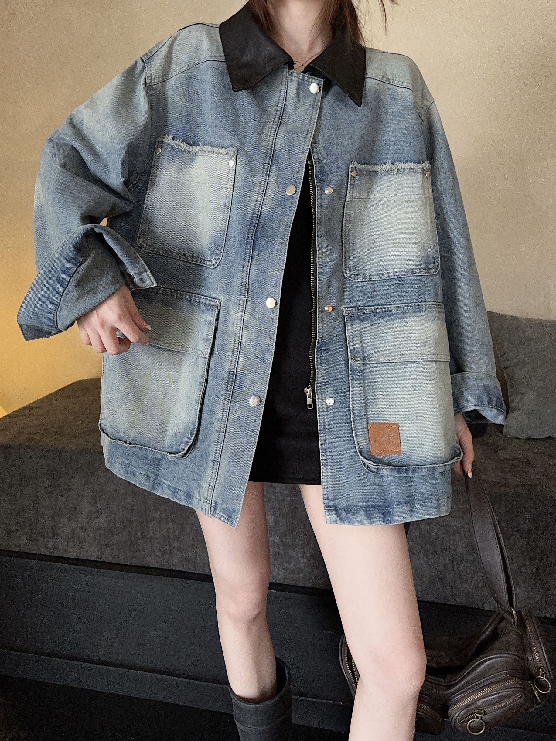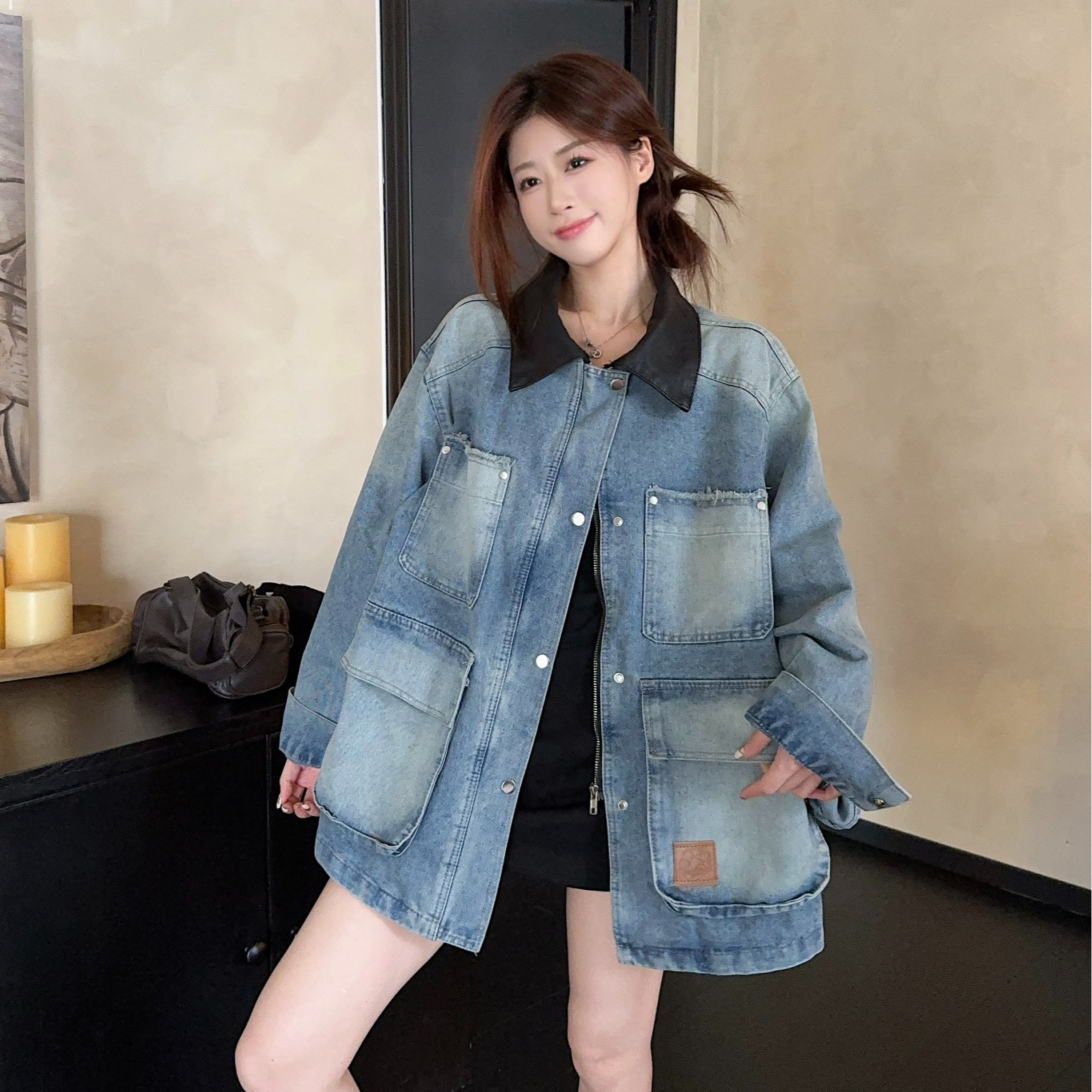 실사 정가 가을 아메리칸 레트로 쇼트 스타일 패치워크 데님 재킷 새로운 가을 작은 키 재킷 맨위 트렌디