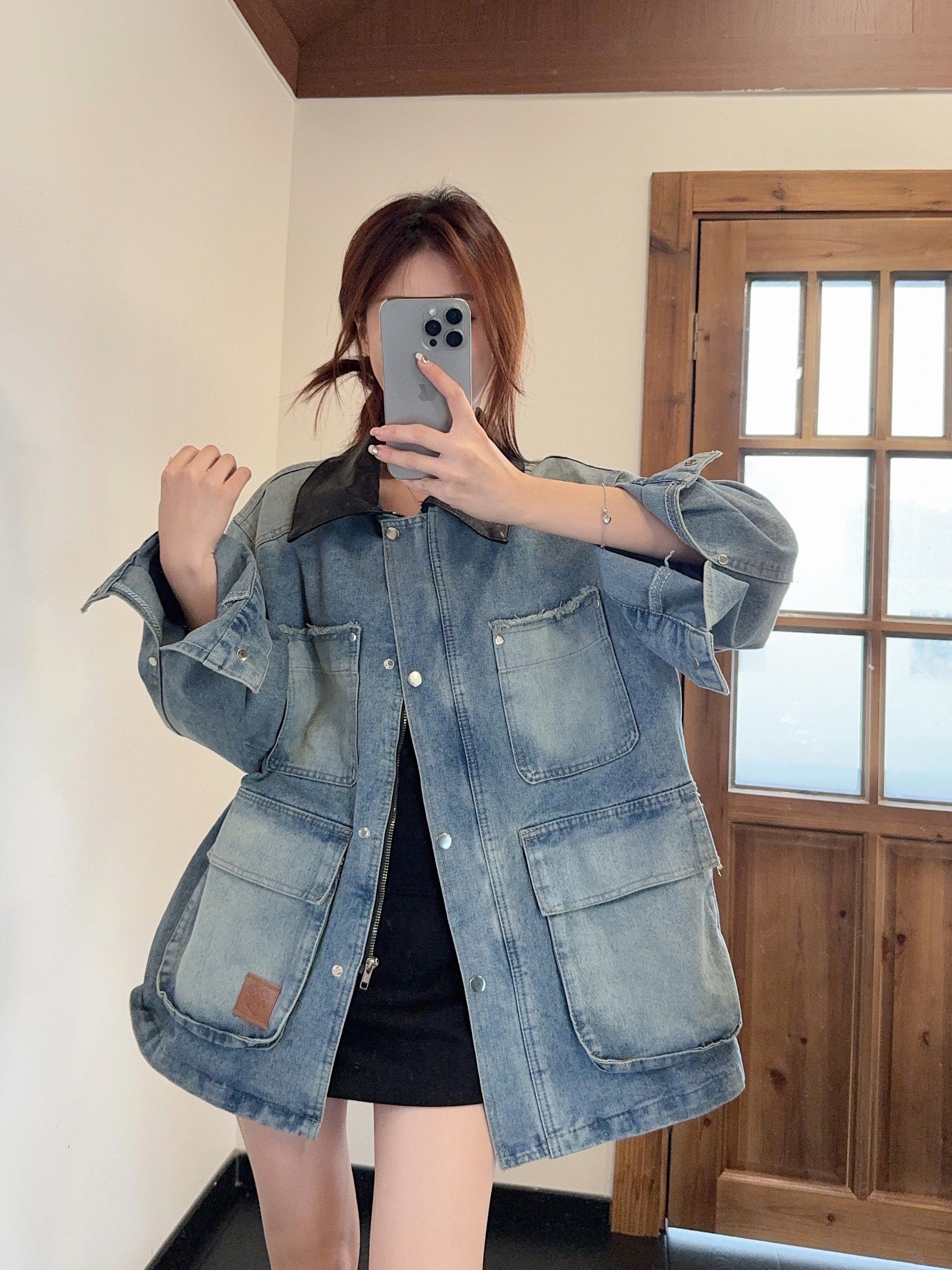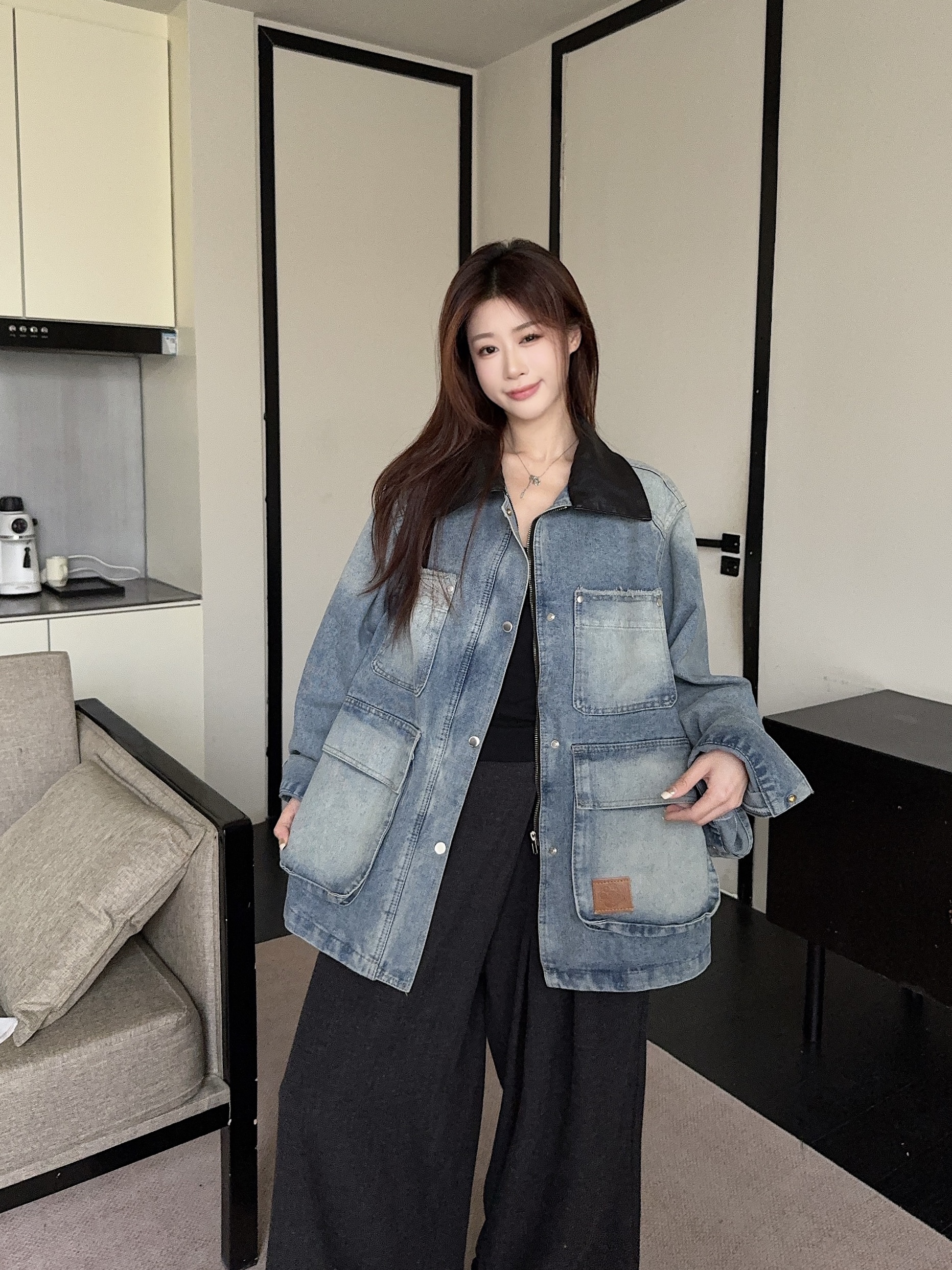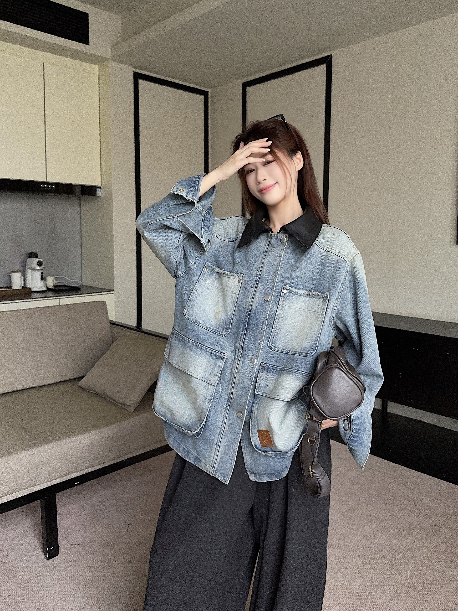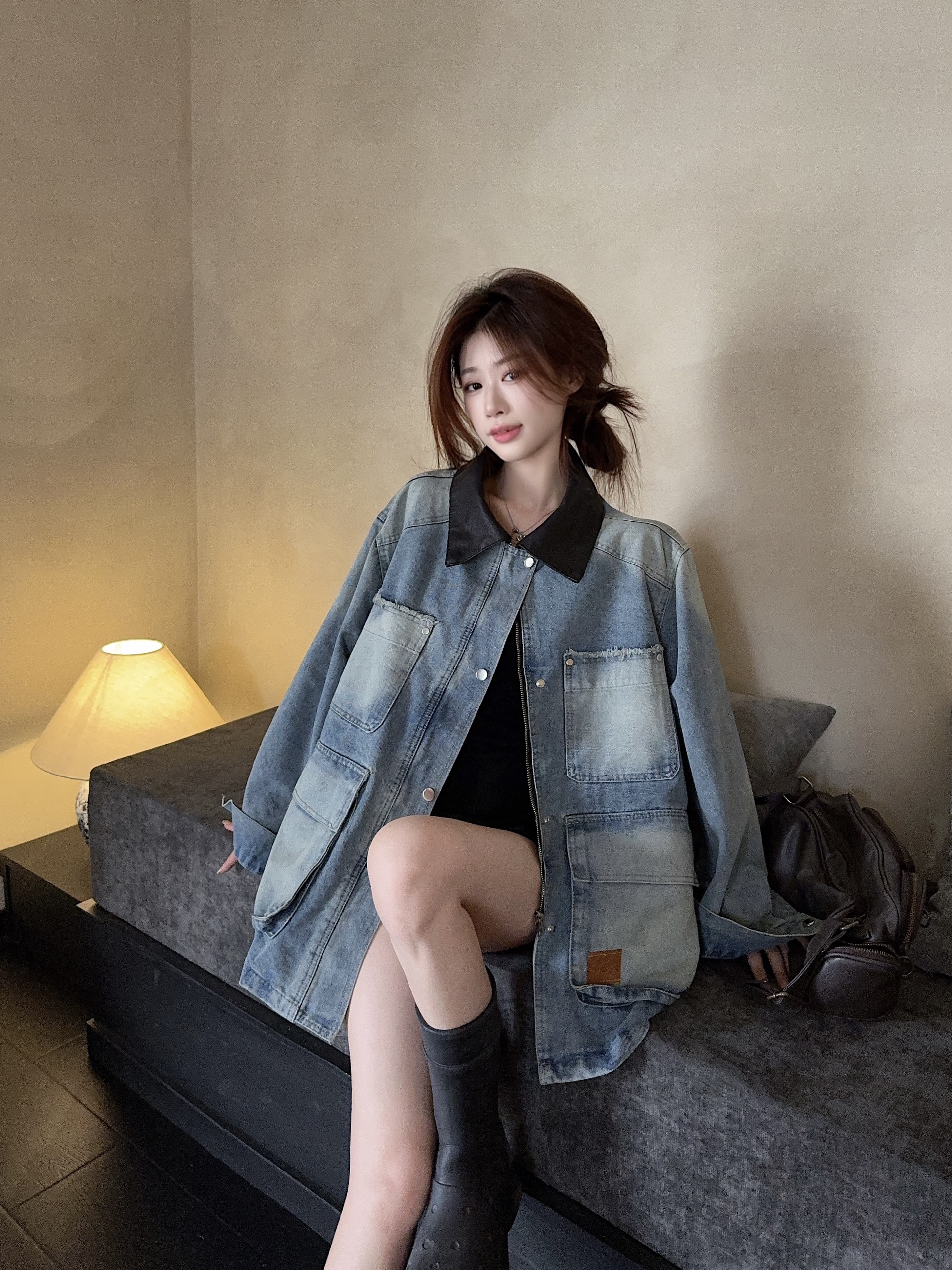 실사 정가 가을 아메리칸 레트로 쇼트 스타일 패치워크 데님 재킷 새로운 가을 작은 키 재킷 맨위 트렌디
