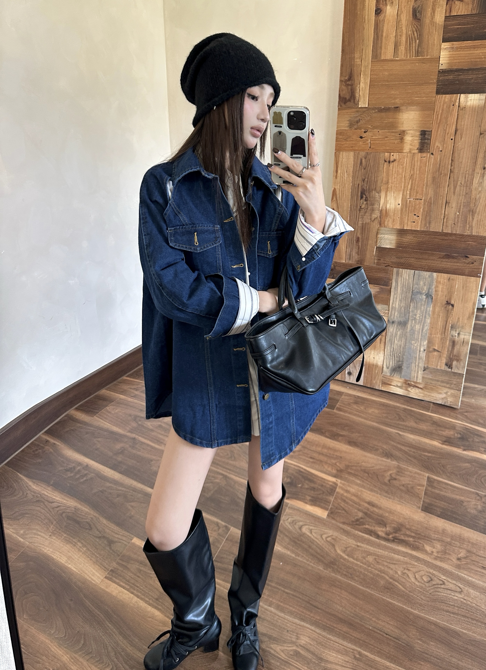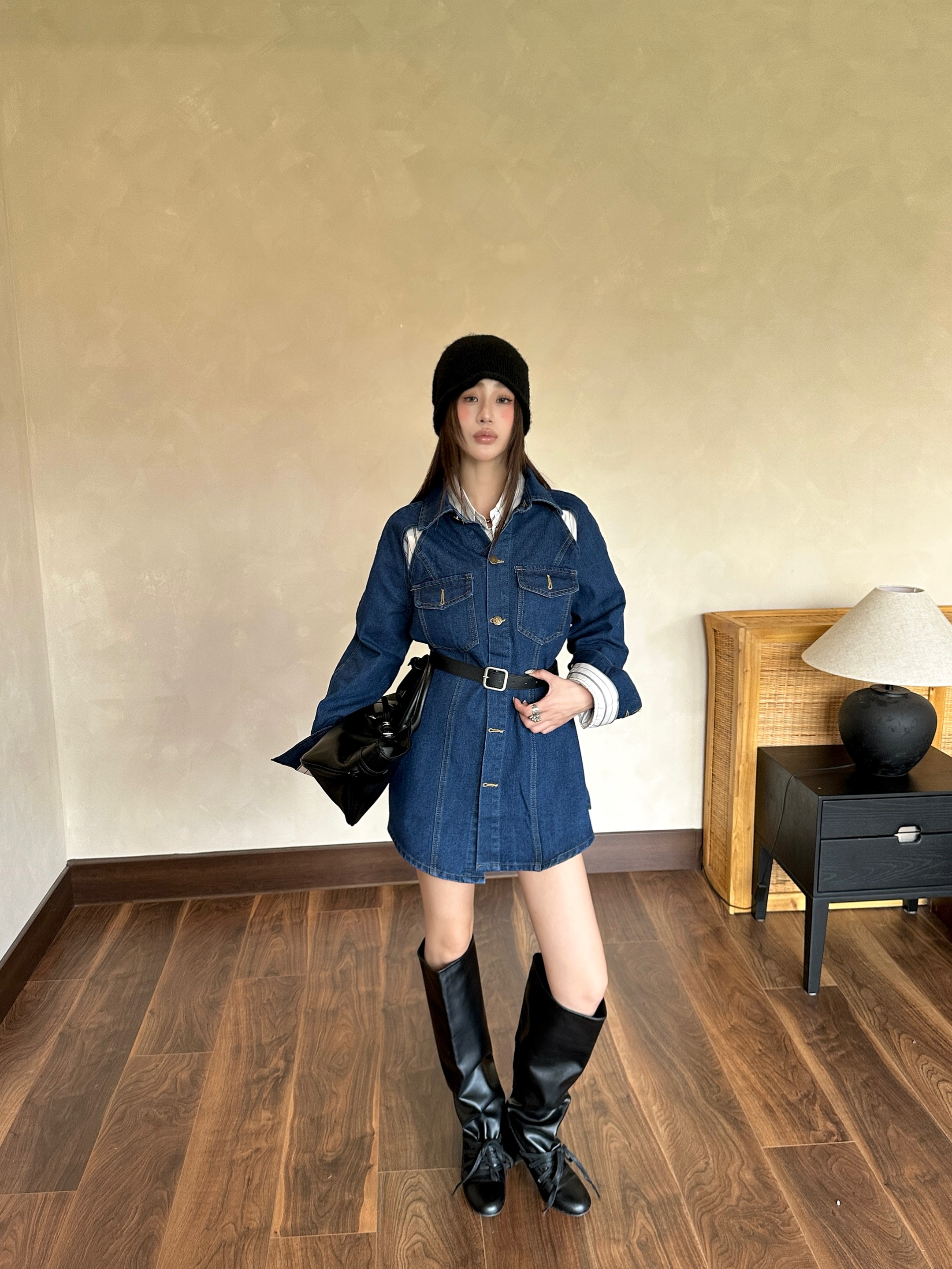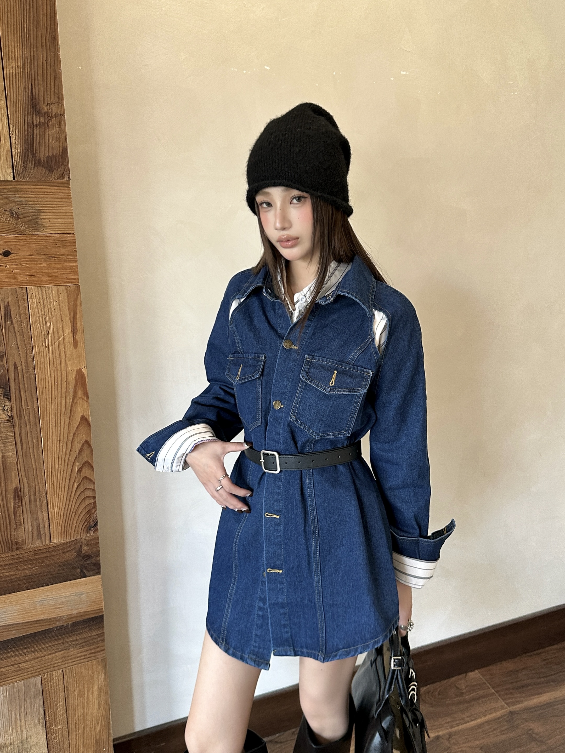 실사 정가 레트로 데님 드레스 롱 코트 홍콩 느낌 POLO 칼라 허리 수축 슬림해 보이는 봄 가을 품격 길다 치마