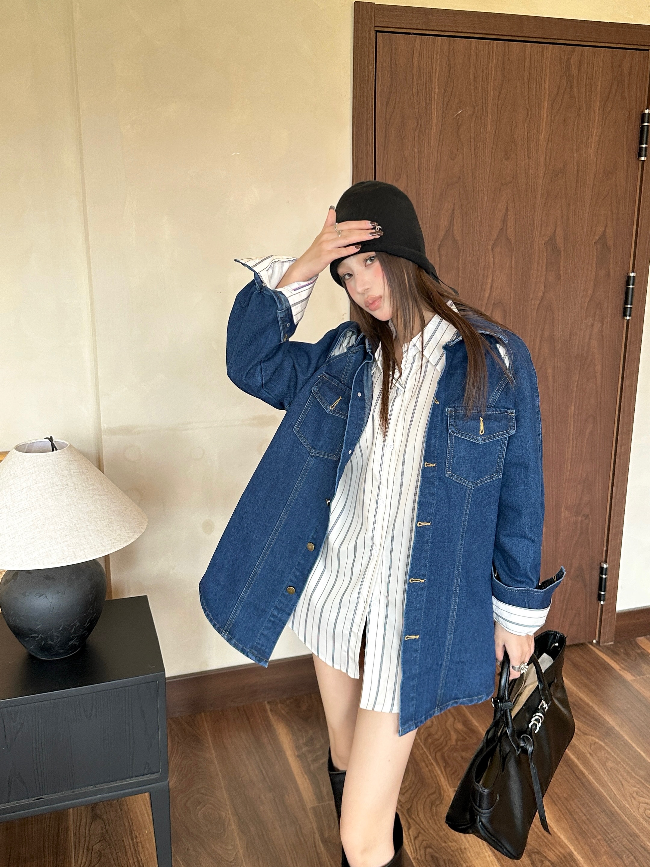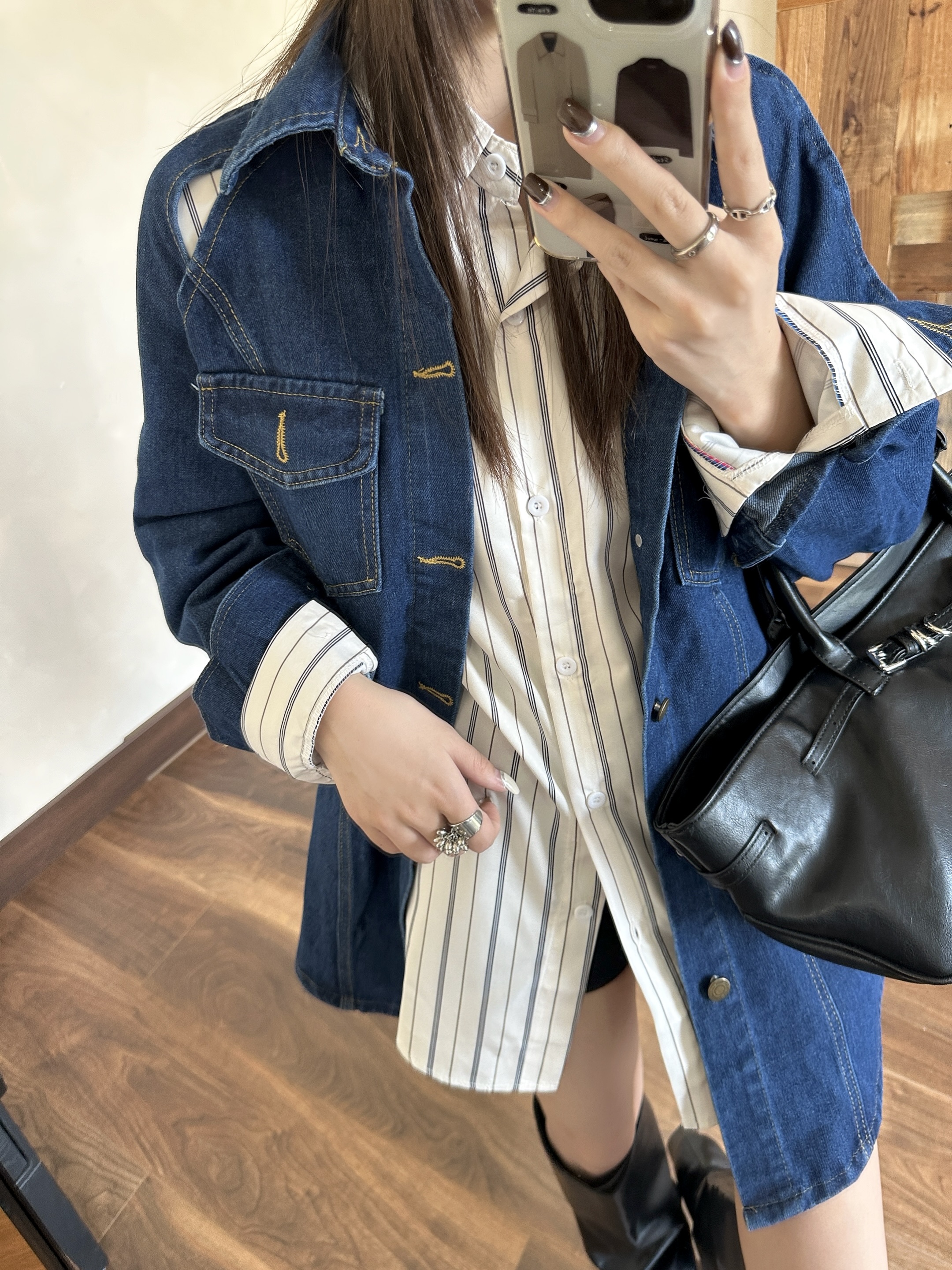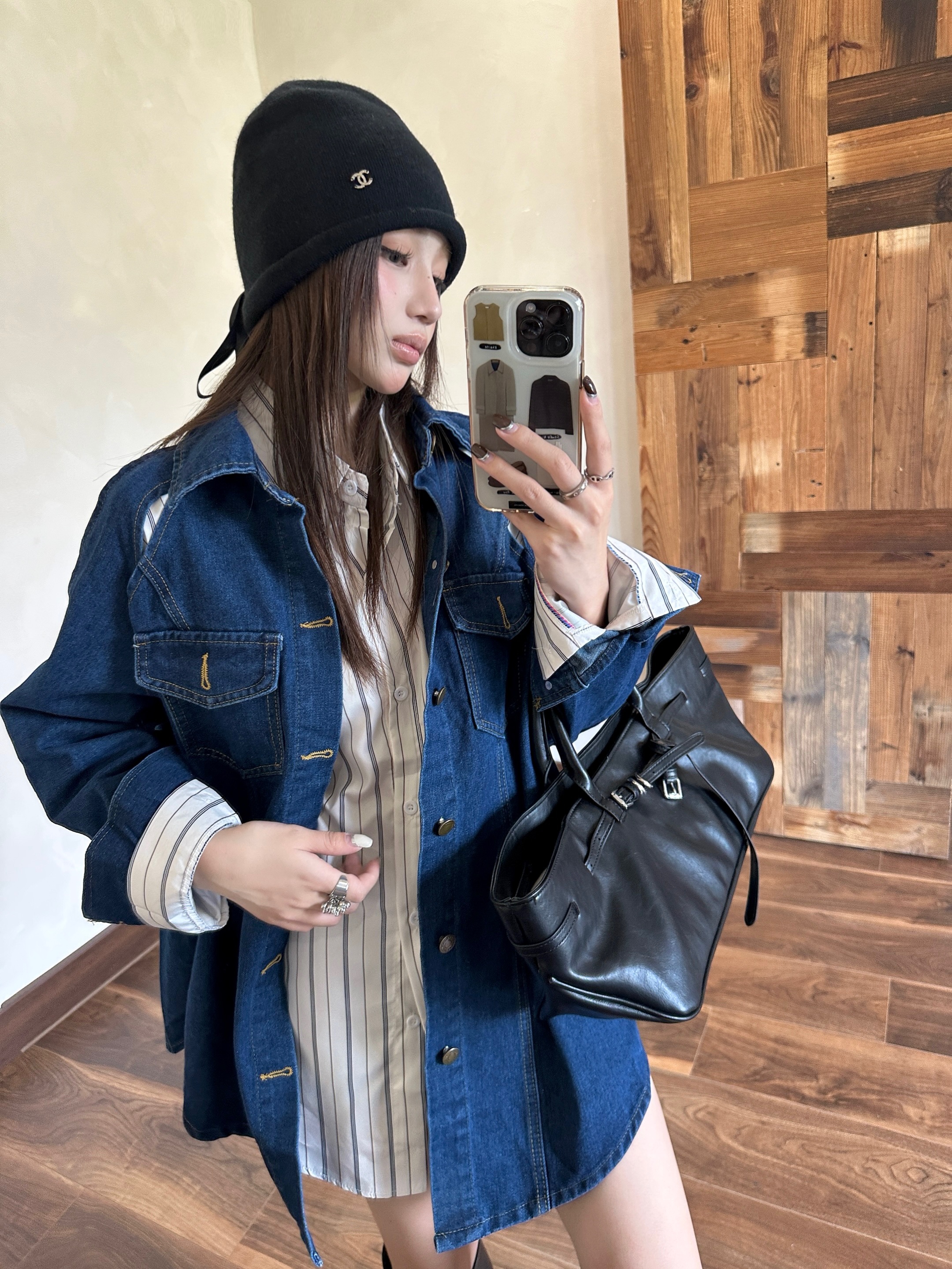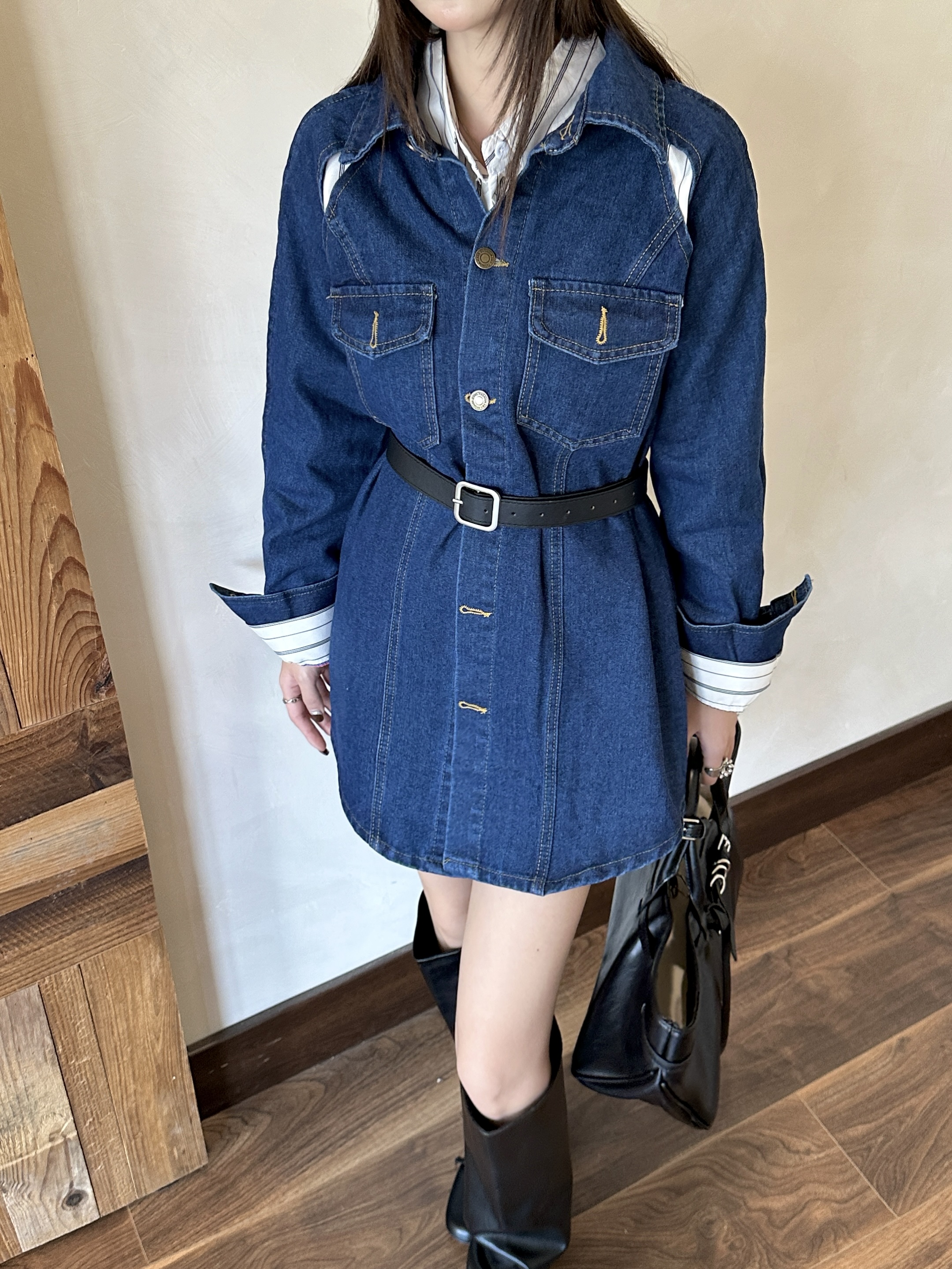 실사 정가 레트로 데님 드레스 롱 코트 홍콩 느낌 POLO 칼라 허리 수축 슬림해 보이는 봄 가을 품격 길다 치마