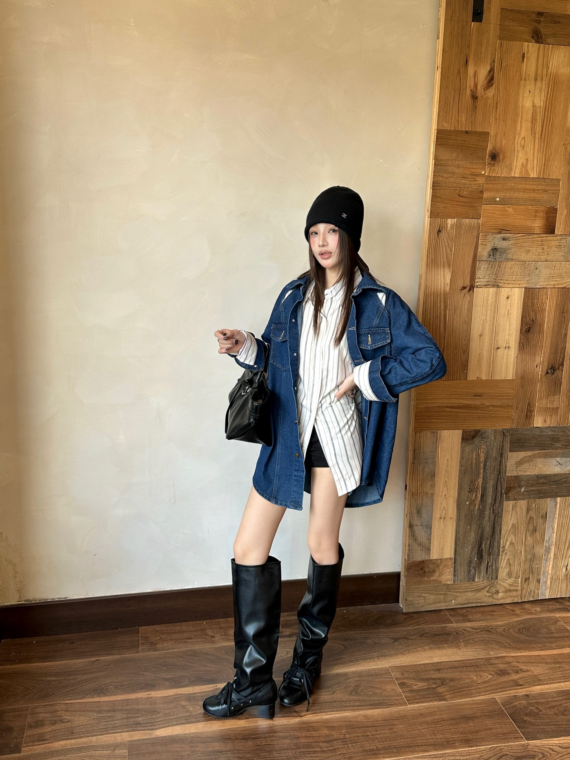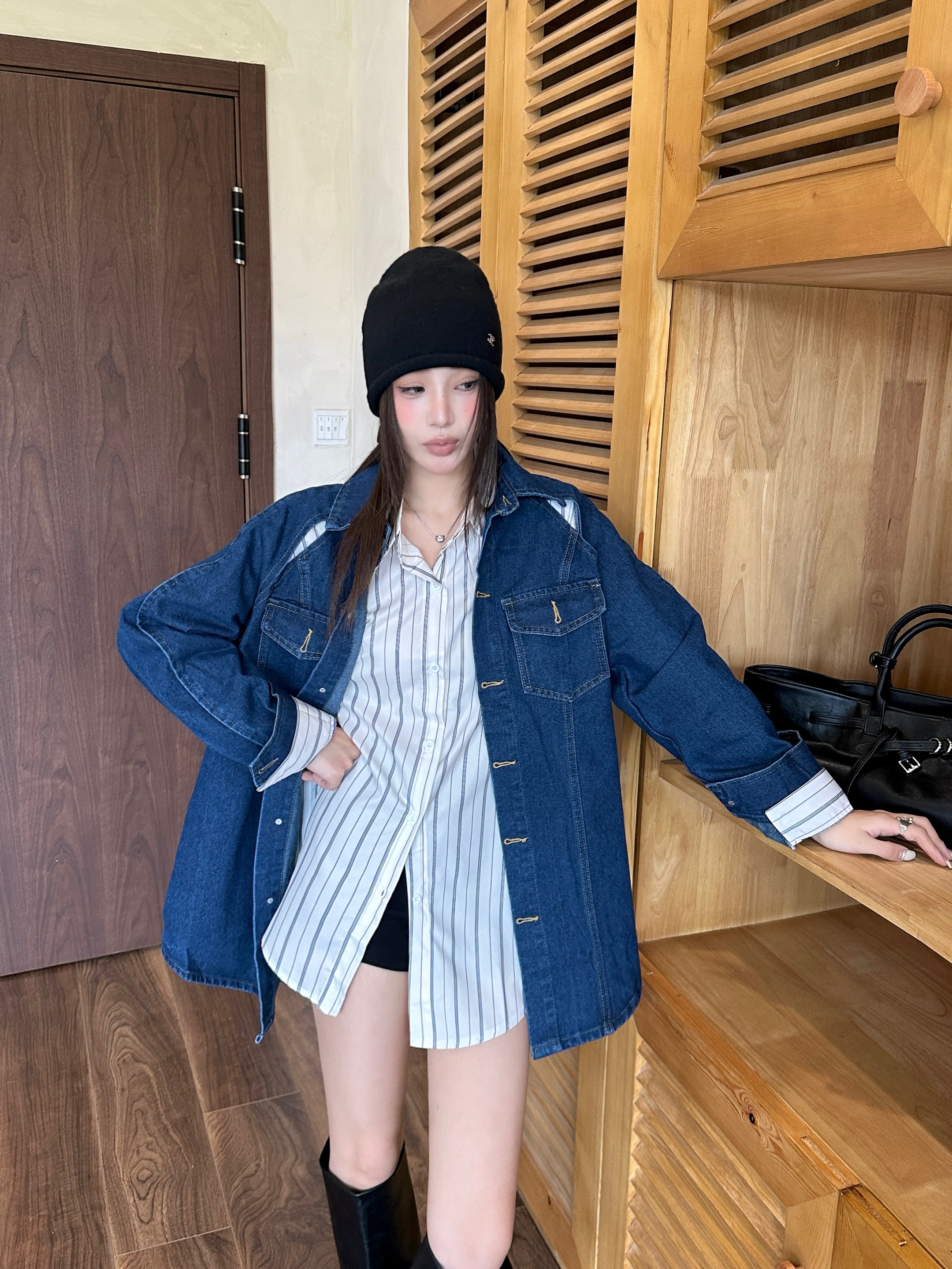 실사 정가 가을 겨울철 새로운 워싱 워크웨어 레트로 스타일 패치워크 폴로 칼라 루즈핏 데님 여성 코트