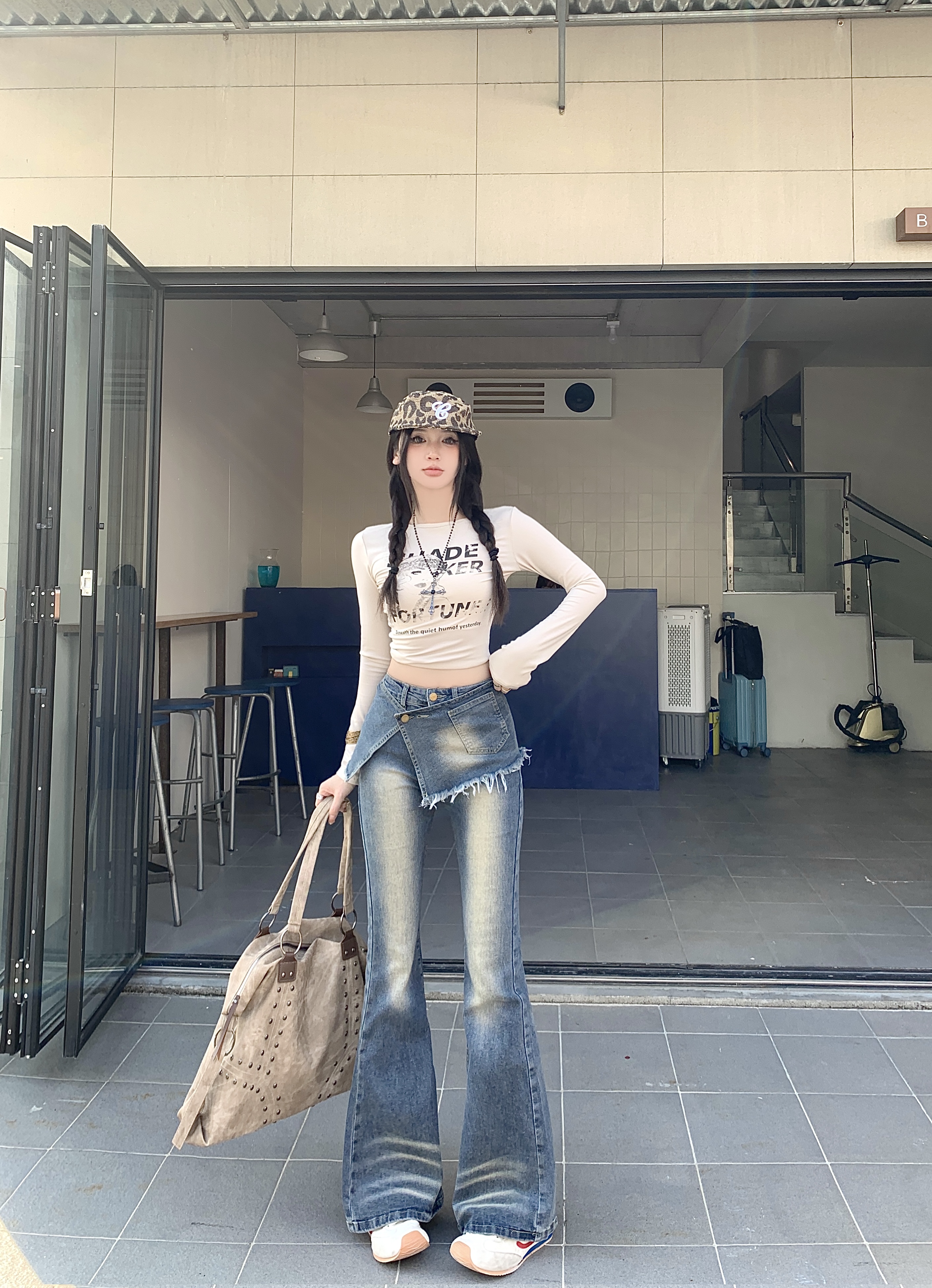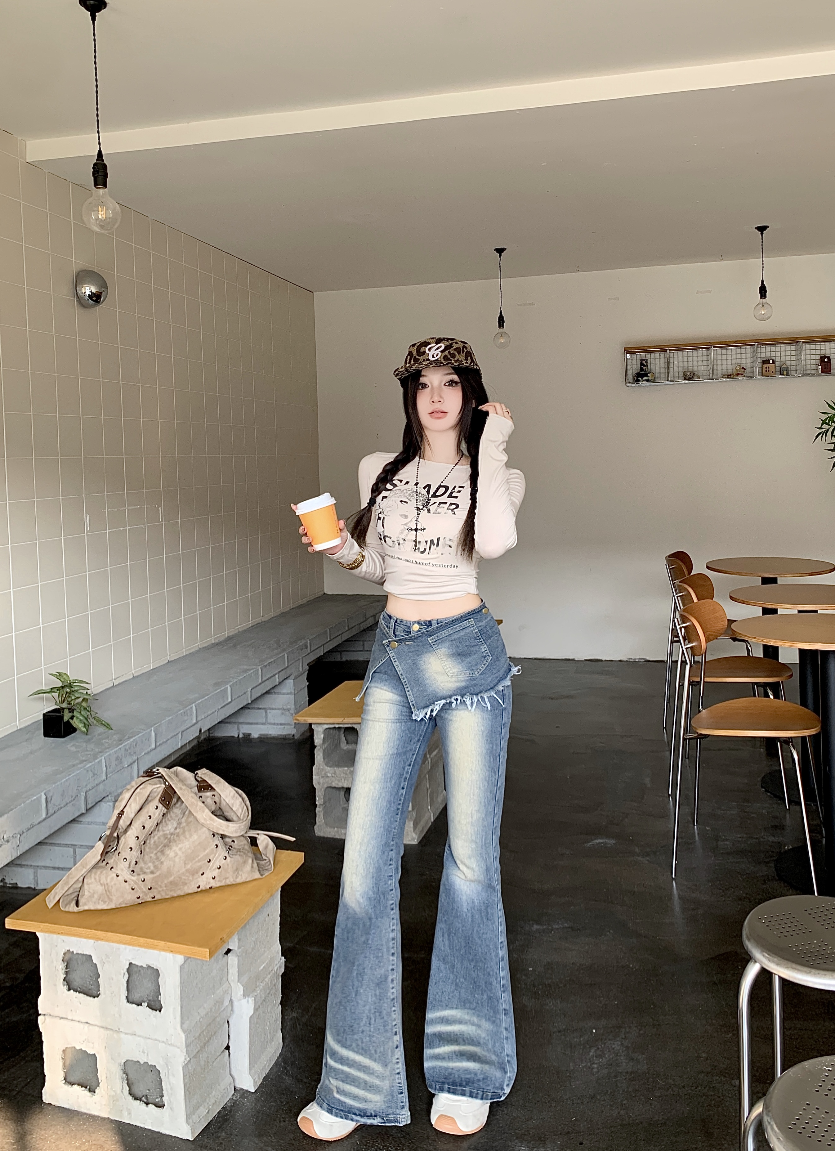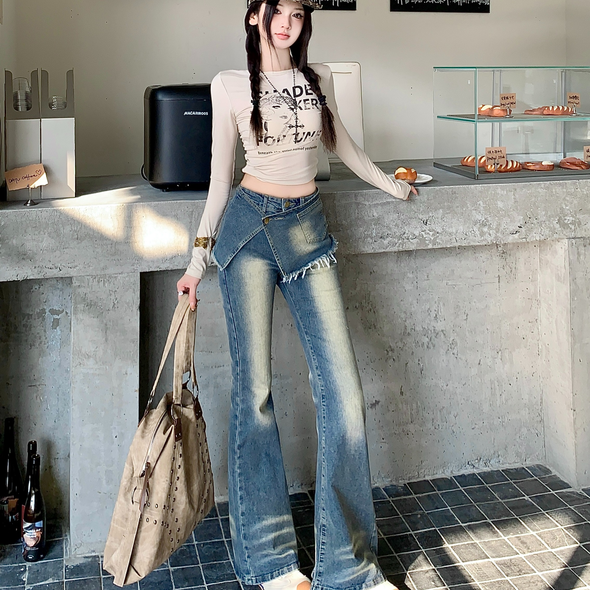 실사 정가 가을 무거운 작업 압력 훈련 하이웨이스트 레트로 바닥 청소 바지 청바지 페이크 레이어드 방귀 커튼 스트레이트 팬츠 여성