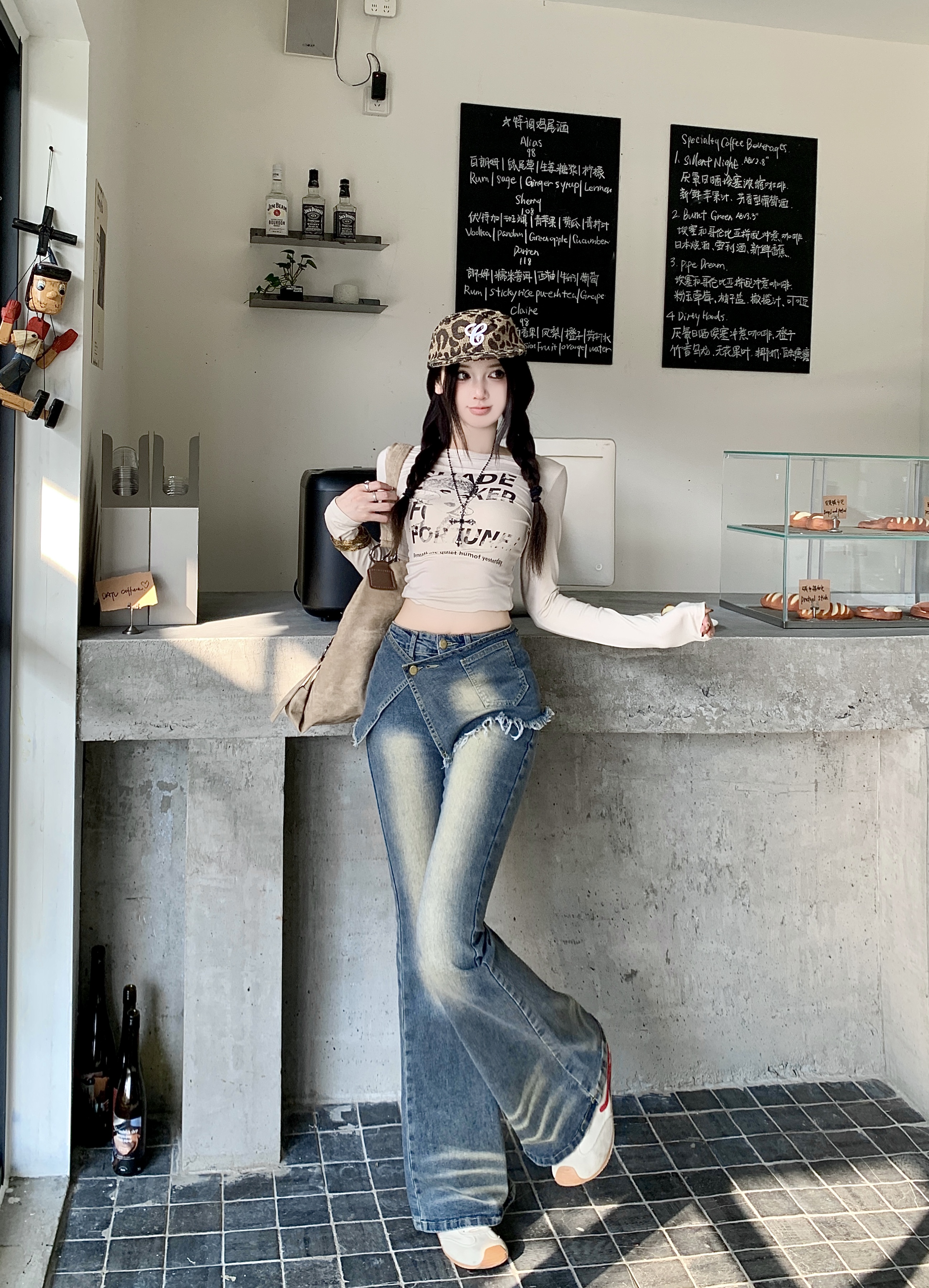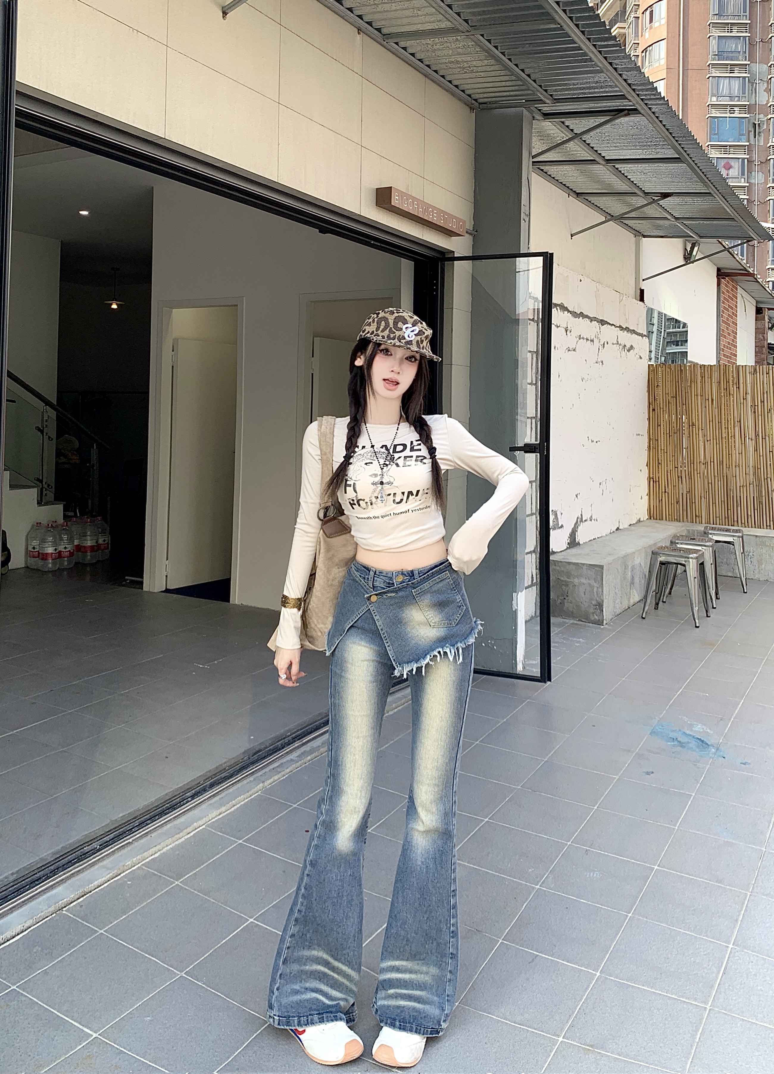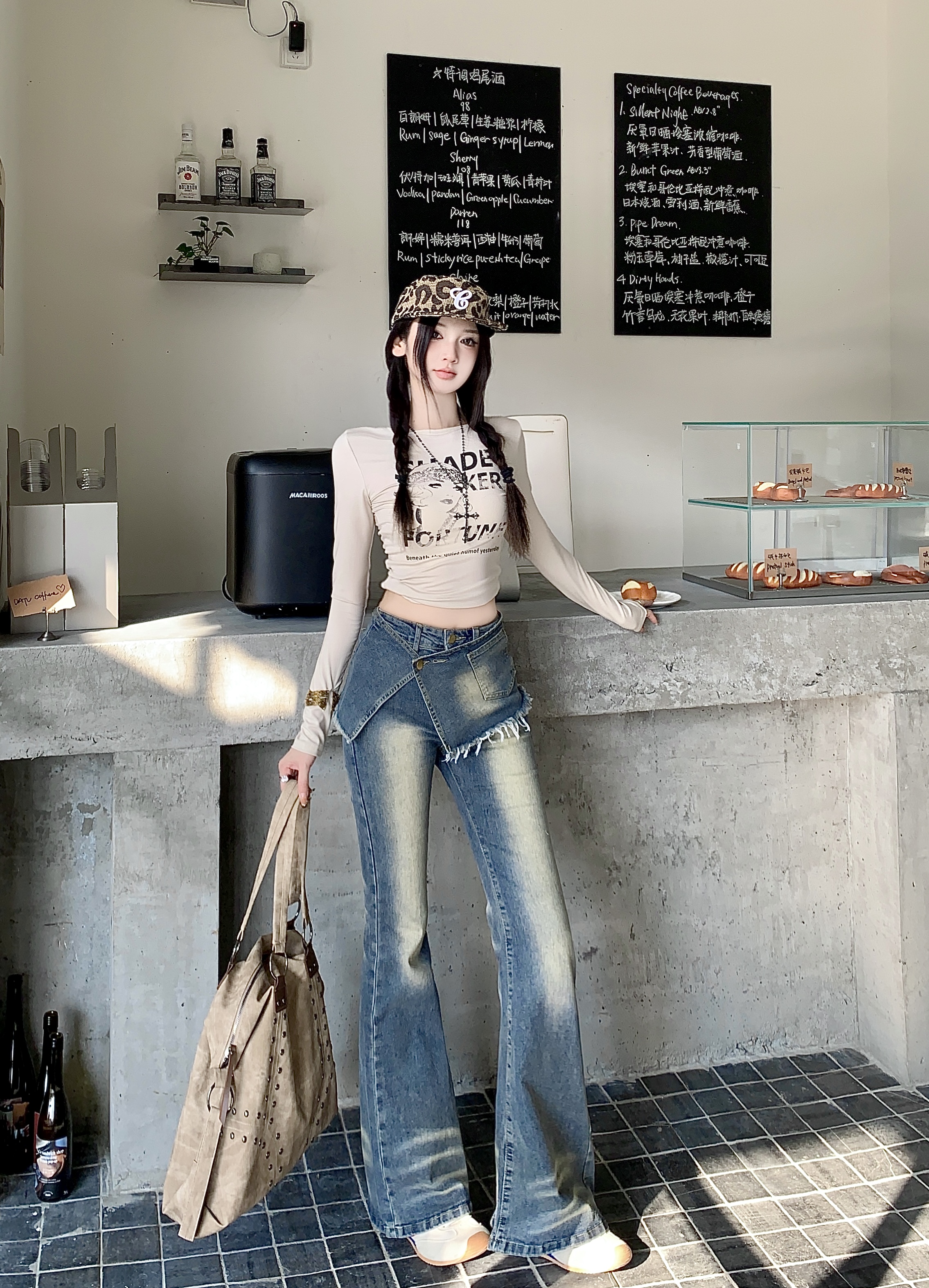 실사 정가 가을 무거운 작업 압력 훈련 하이웨이스트 레트로 바닥 청소 바지 청바지 페이크 레이어드 방귀 커튼 스트레이트 팬츠 여성