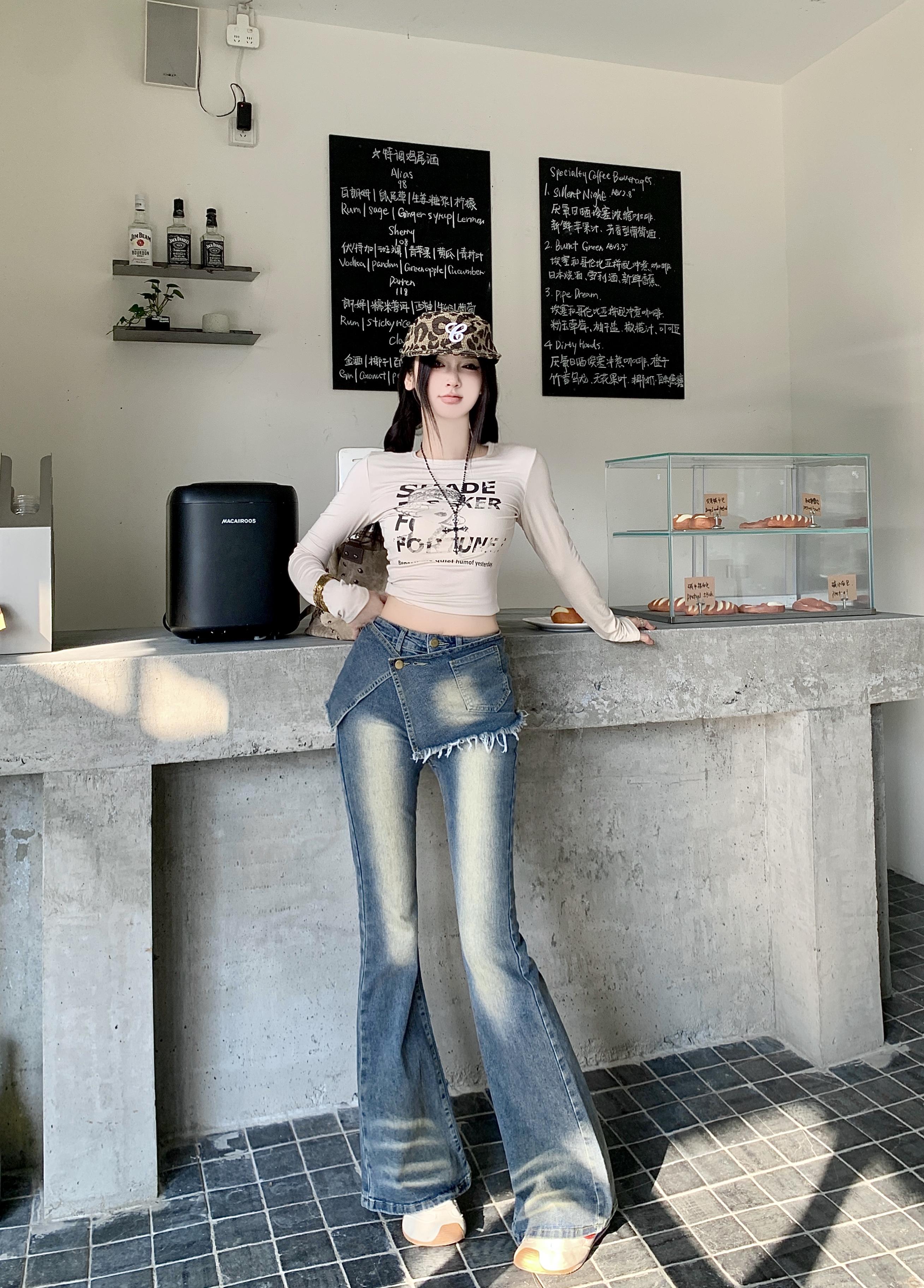 실사 정가 페이크 레이어드 데님 패치워크 긴팔 후드티 가을 새로운 작은 대중 외국 가스 디자인 오프숄더 맨위 트렌디