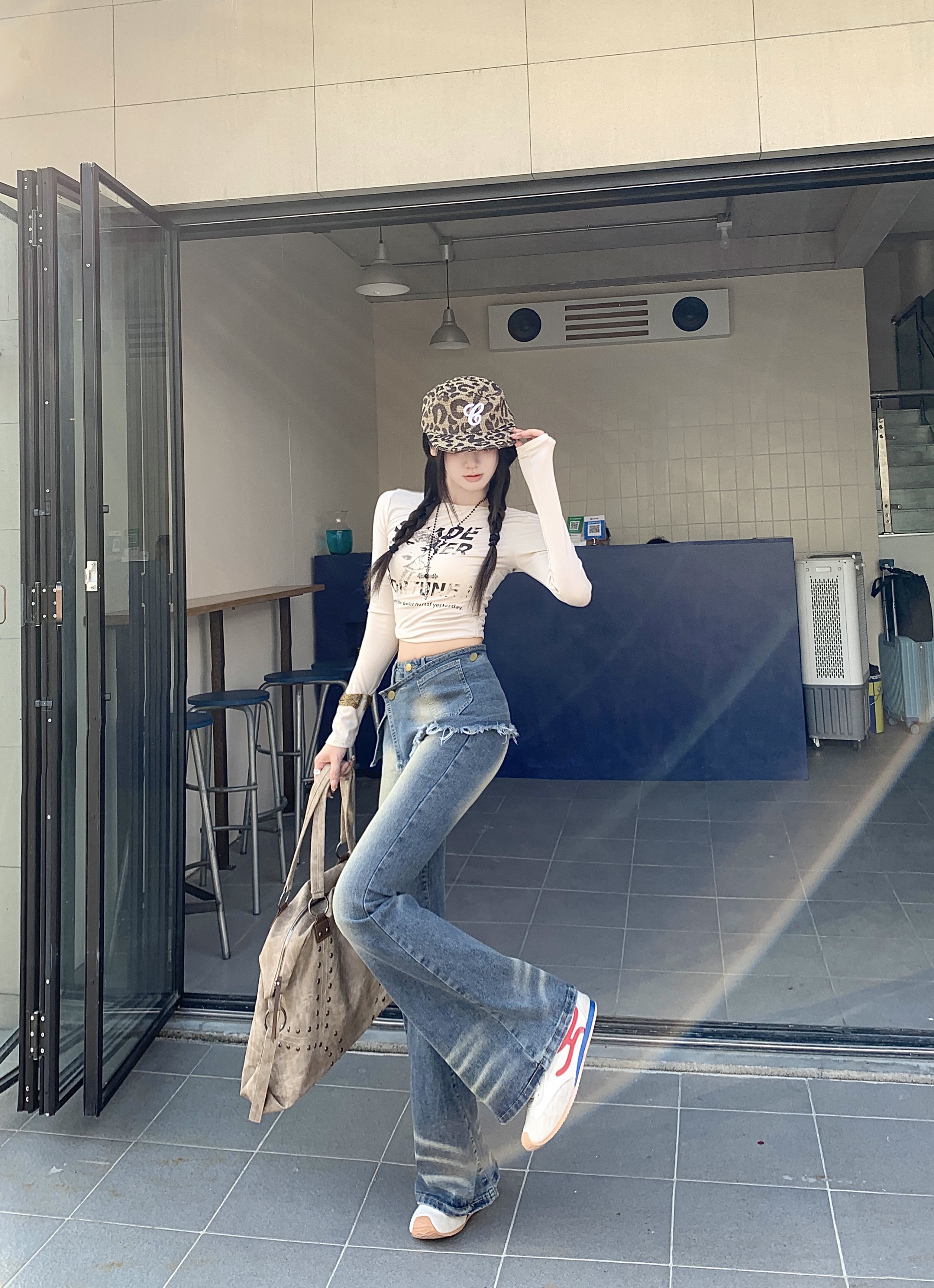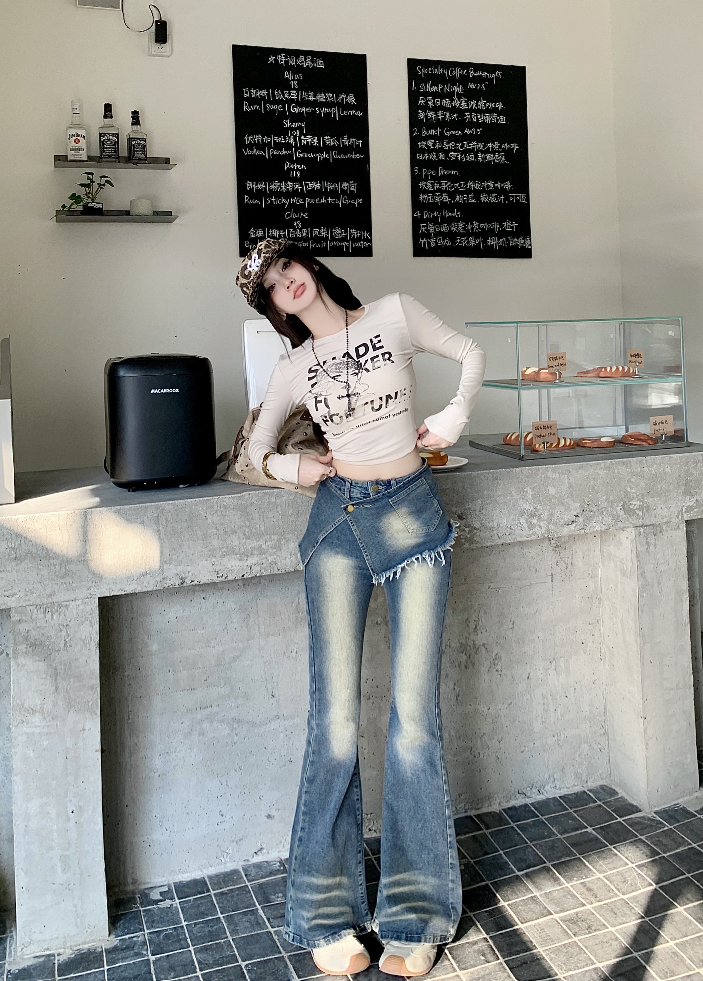 실사 정가 봄 가을 Chic 나팔 긴팔 V넥 데님 여성 셔츠 디자인 센스 작은 대중 허리 수축 아름다운 맨위
