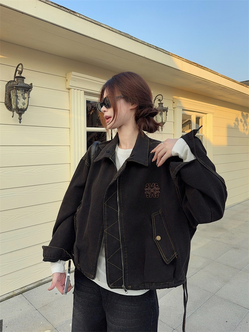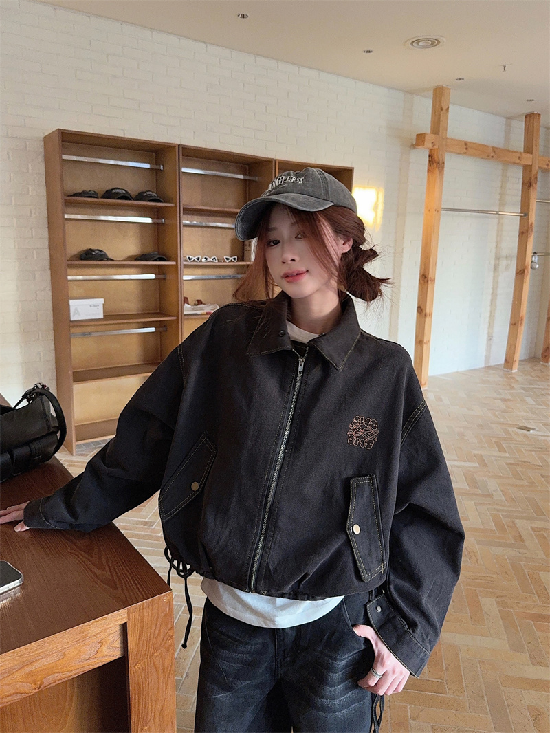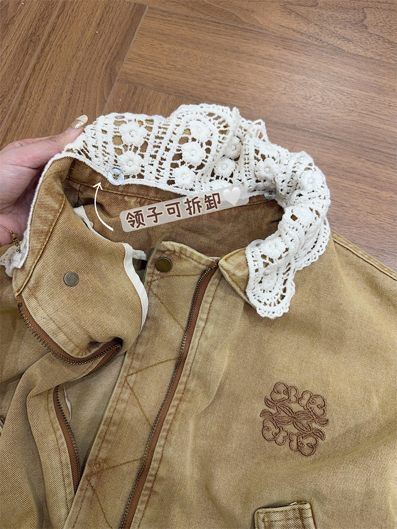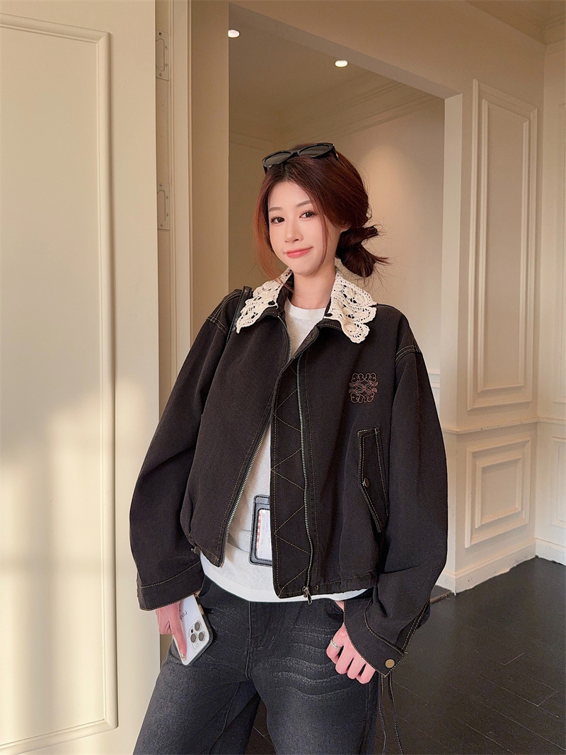 실사 정가 가을 겨울철 새로운 워싱 워크웨어 레트로 스타일 패치워크 폴로 칼라 루즈핏 데님 여성 코트