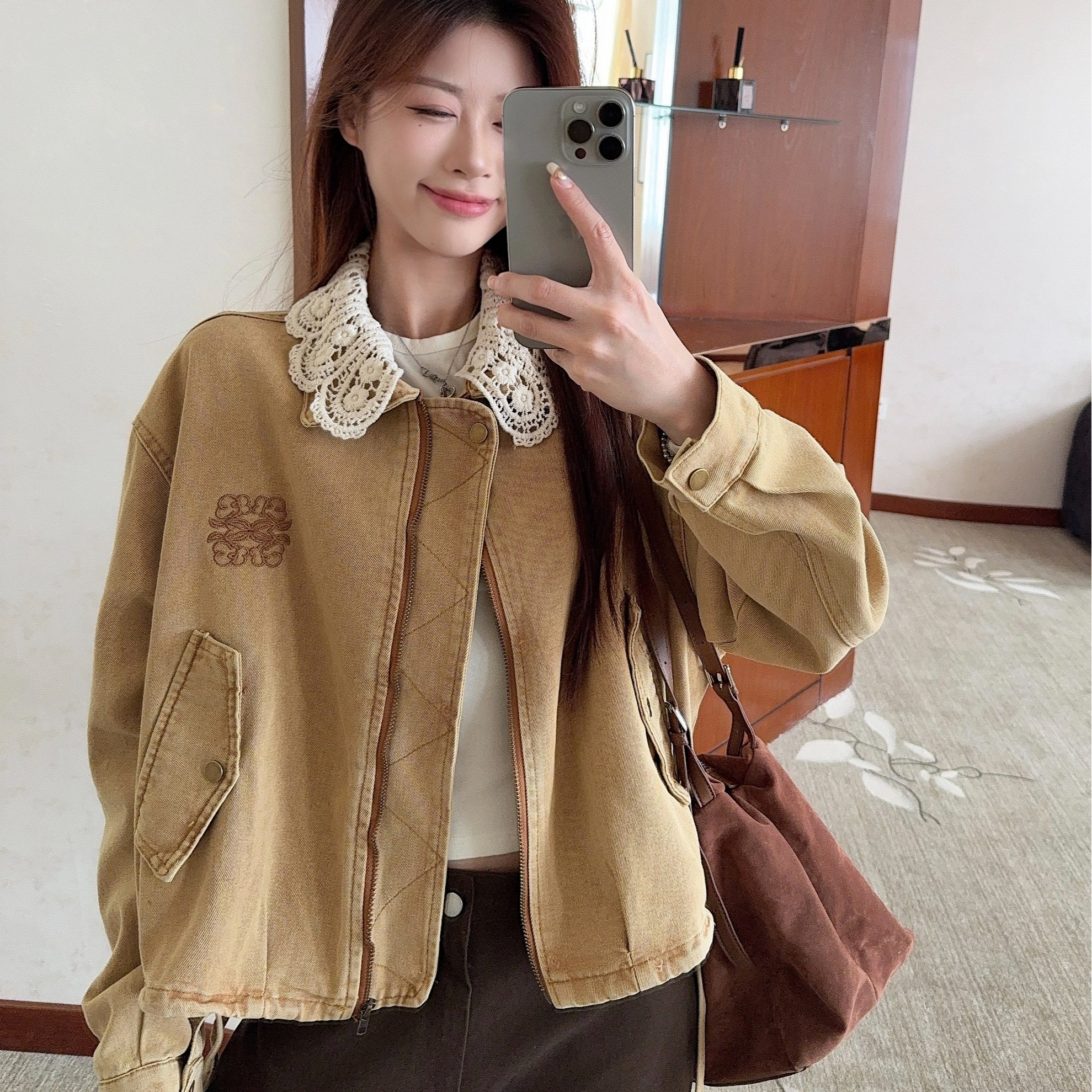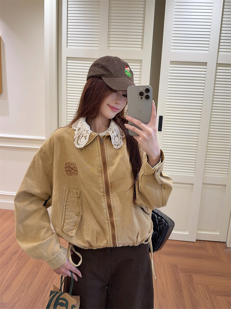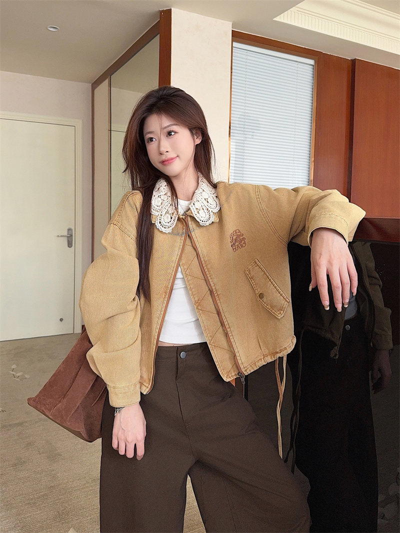 실사 정가 가을 겨울철 새로운 워싱 워크웨어 레트로 스타일 패치워크 폴로 칼라 루즈핏 데님 여성 코트