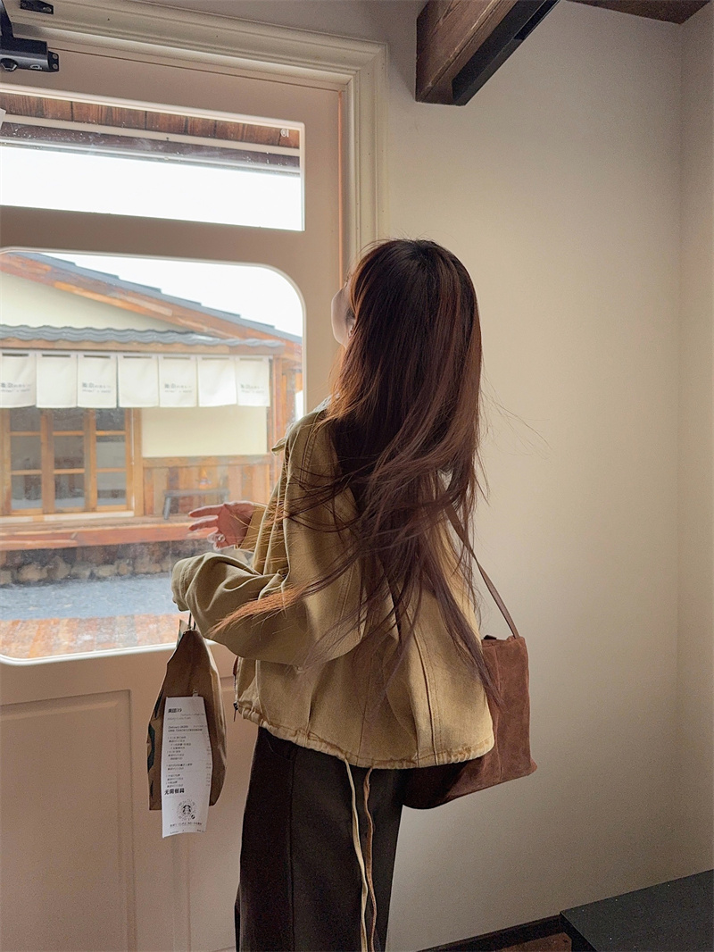 실제 촬영 정가 한국 chic 항구 바람 기질 더블 지퍼 여가 와일드 짧은 단락 긴 소매 후드가 달린 카우보이 외투