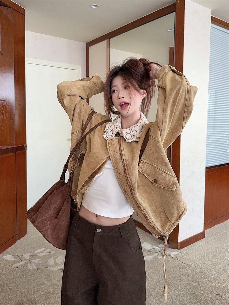 실사 정가 튀김 거리 핫걸 레트로 워시 물 마 오래된 작은 대중 다용도 트렌디 차가운 어깨 데님 쇼트 스타일 재킷