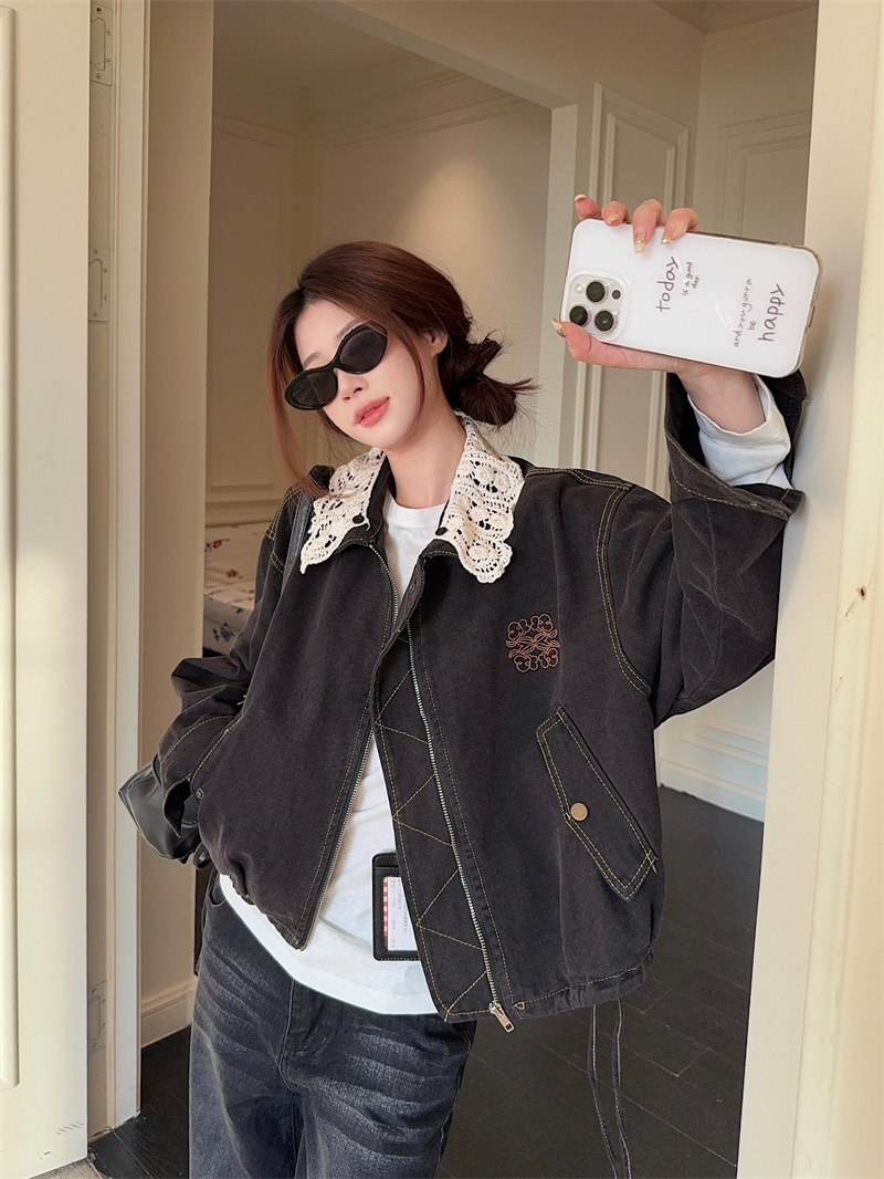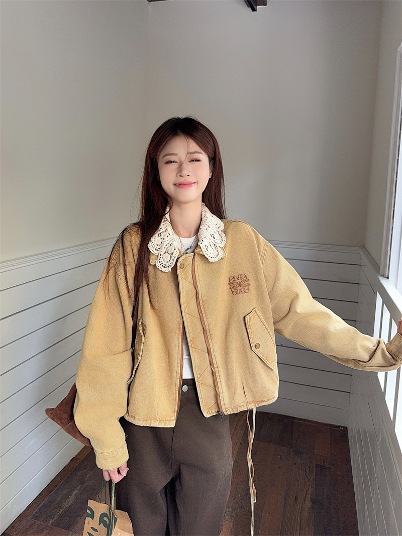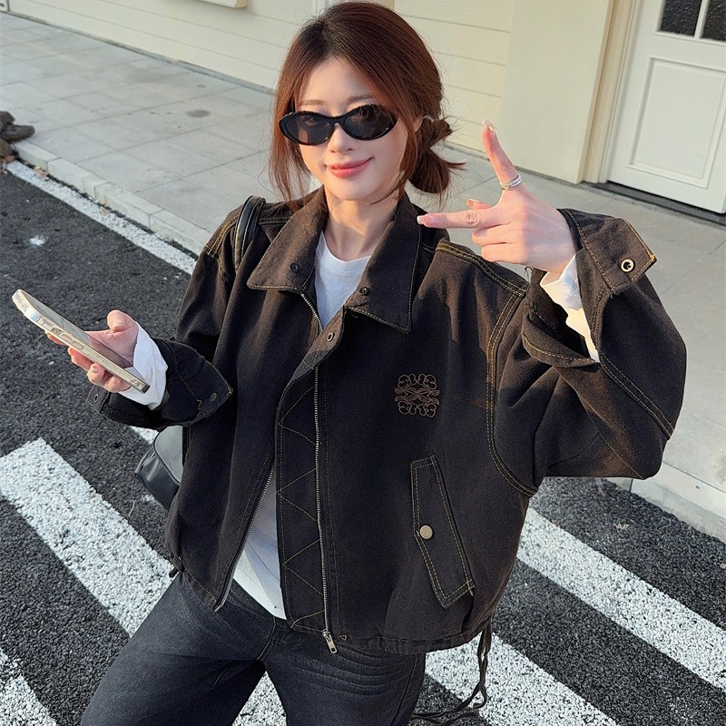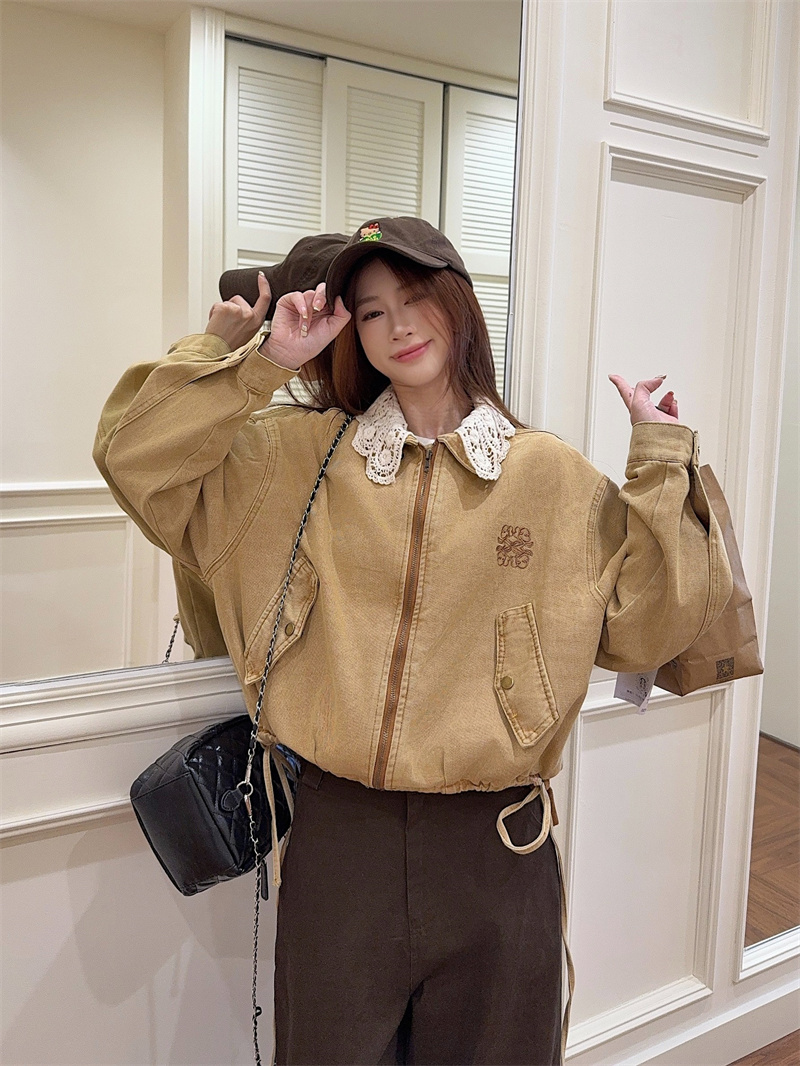 실사 정가 가을 겨울철 새로운 워싱 워크웨어 레트로 스타일 패치워크 폴로 칼라 루즈핏 데님 여성 코트