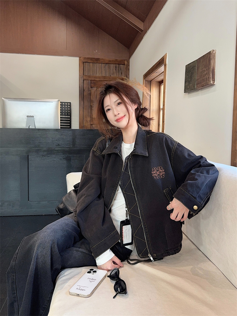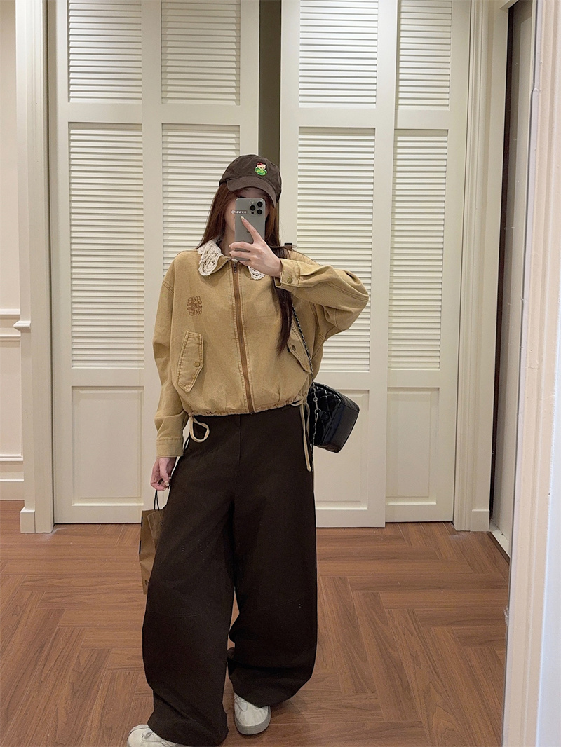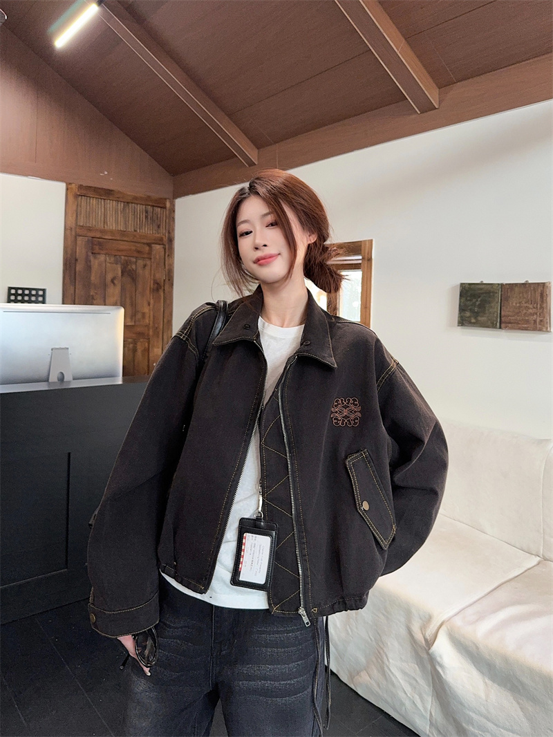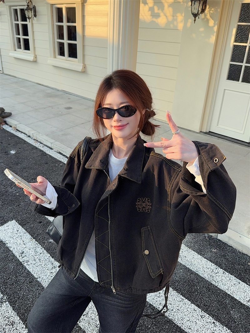 실사 정가 가을 겨울철 새로운 워싱 워크웨어 레트로 스타일 패치워크 폴로 칼라 루즈핏 데님 여성 코트