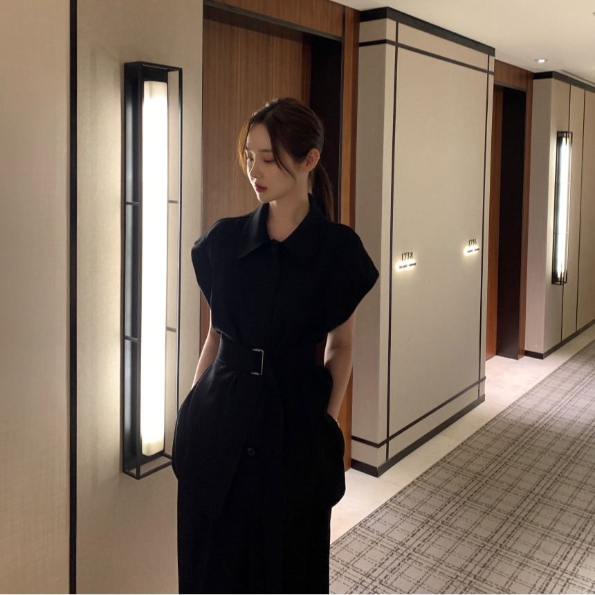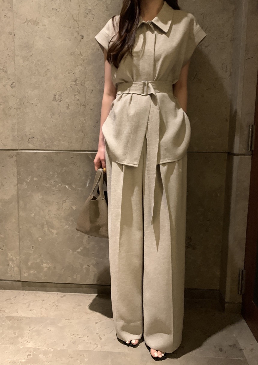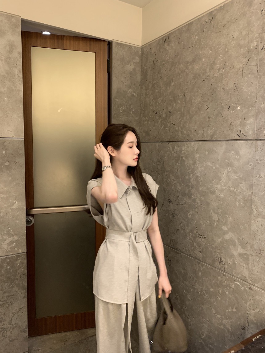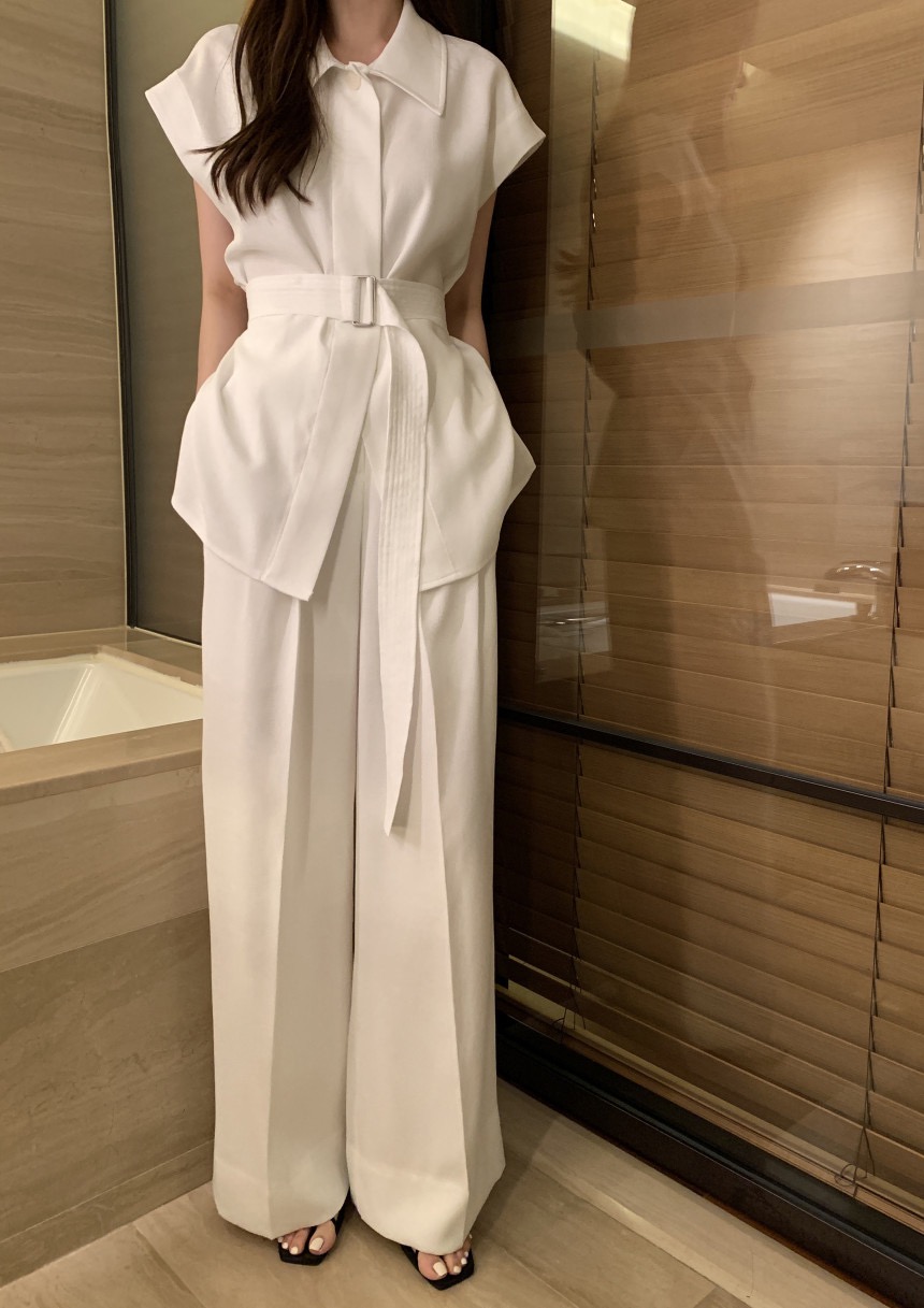 품격 V넥 레이스업 싱글 줄 버튼 캐미솔 작은 셔츠 하이웨이스트 루즈핏 스트레이트 와이드 레그 팬츠 세트 투피스 세트